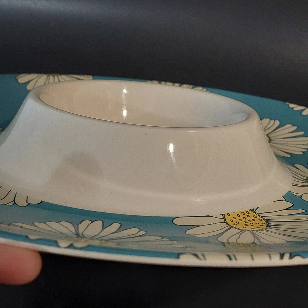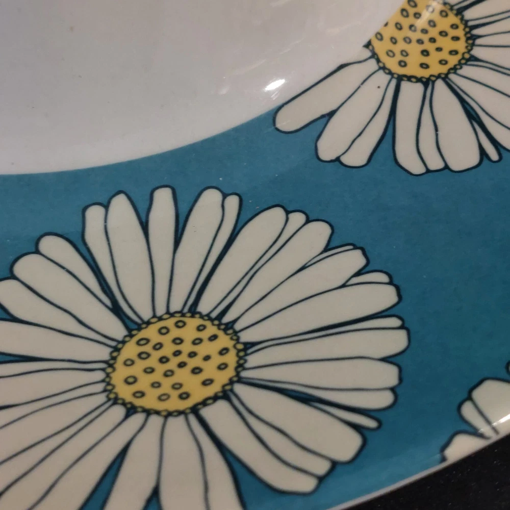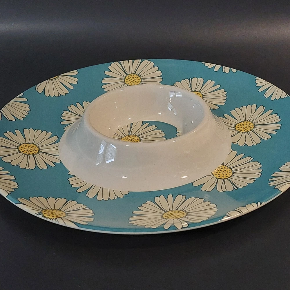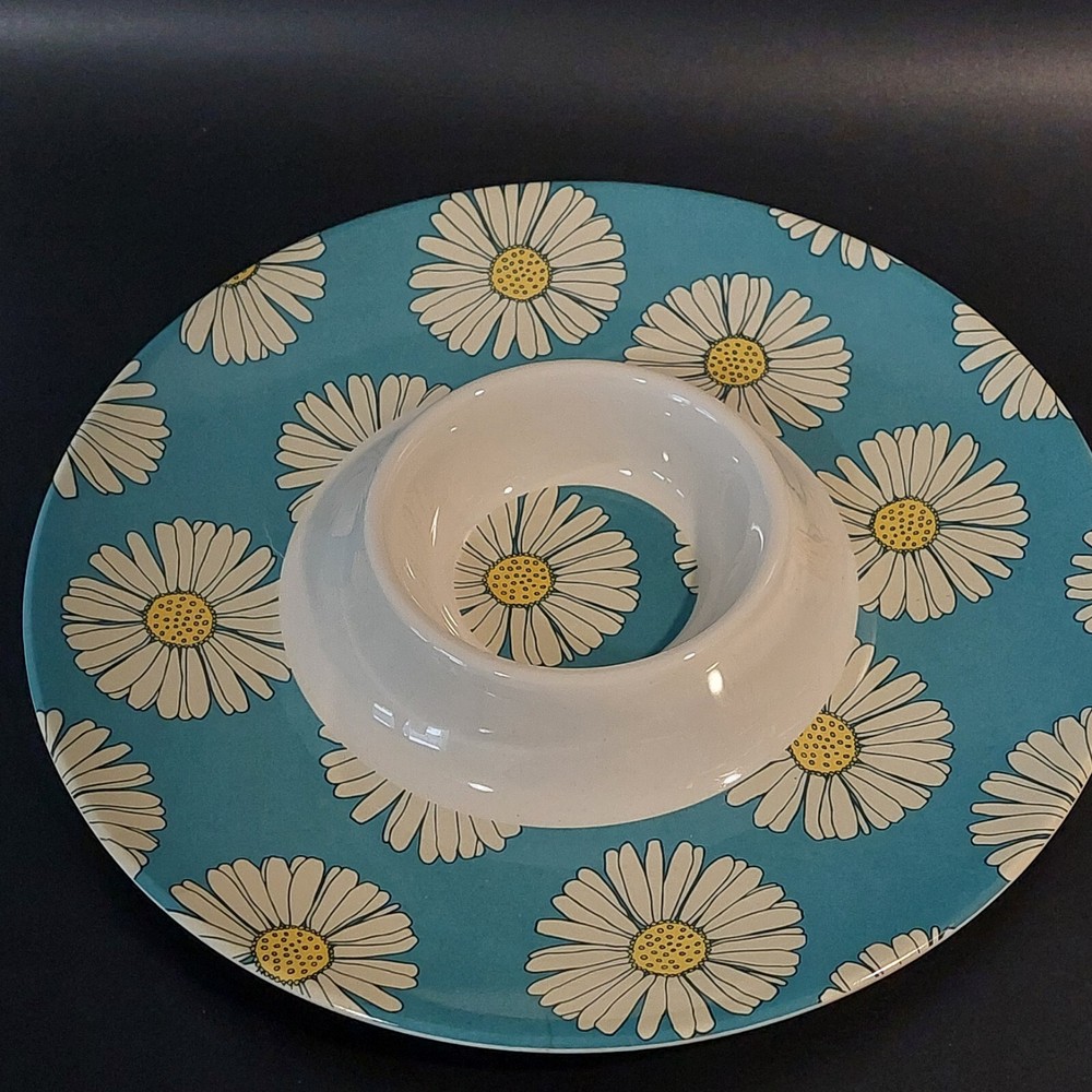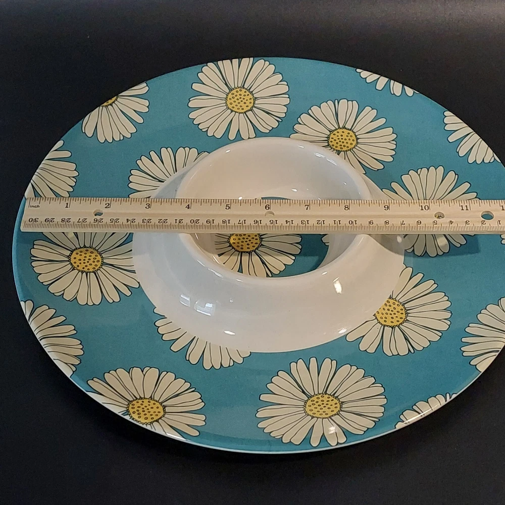EXCELLENT CONDITION, NEVER USED BUT NOT IN ORIGINAL PACKAGING. The Matilda Jane Daisy Serving Platter is a large round dish measuring 12 inches in length and width, with a depth of 2 inches, perfect for serving chips and dip at various occasions like Bachelorette Parties, Easter, Mother's Day, and Bridal Showers. The platter features a teal color with white daisies in a floral garden theme, made of glossy melamine material. It has a tray shape and is designed with a pattern of daisy floral flowers, making it a stylish addition to any table setting.