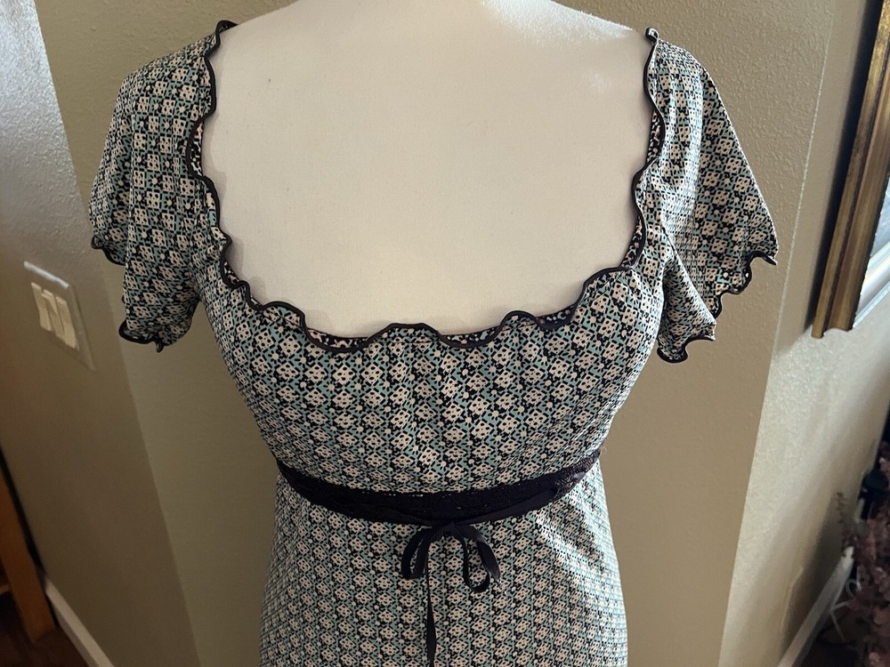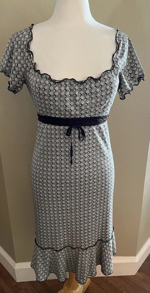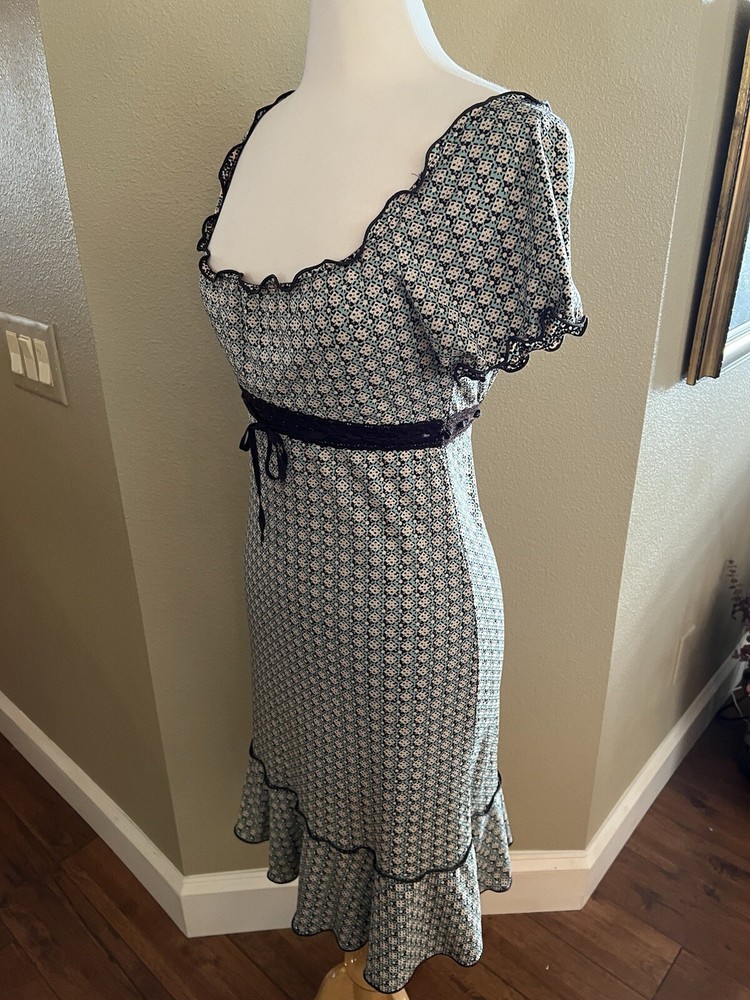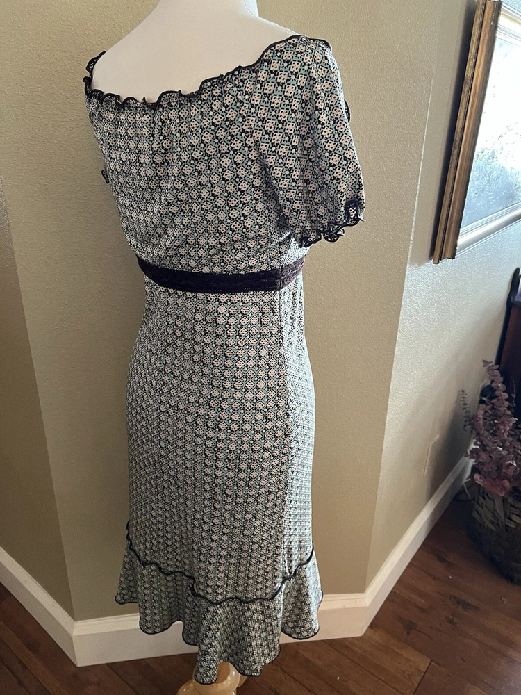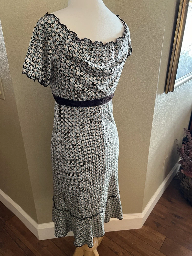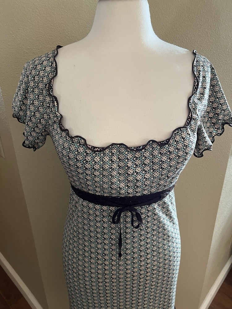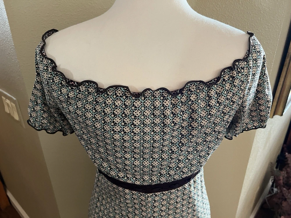 Max Studio Light Blue Brown Peasant Sweetheart Neck Off Shoulder Peasant Dress XS Fits like an extra small or small Fantastic condition no issues Measurements laying flat off shoulder Shoulder to shoulder 15 inches Bust 17 inches Waist 15 inches Shoulder to bottom 36 inches