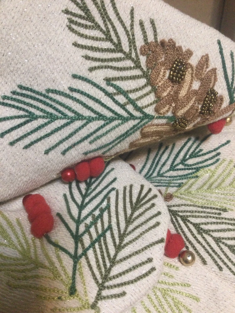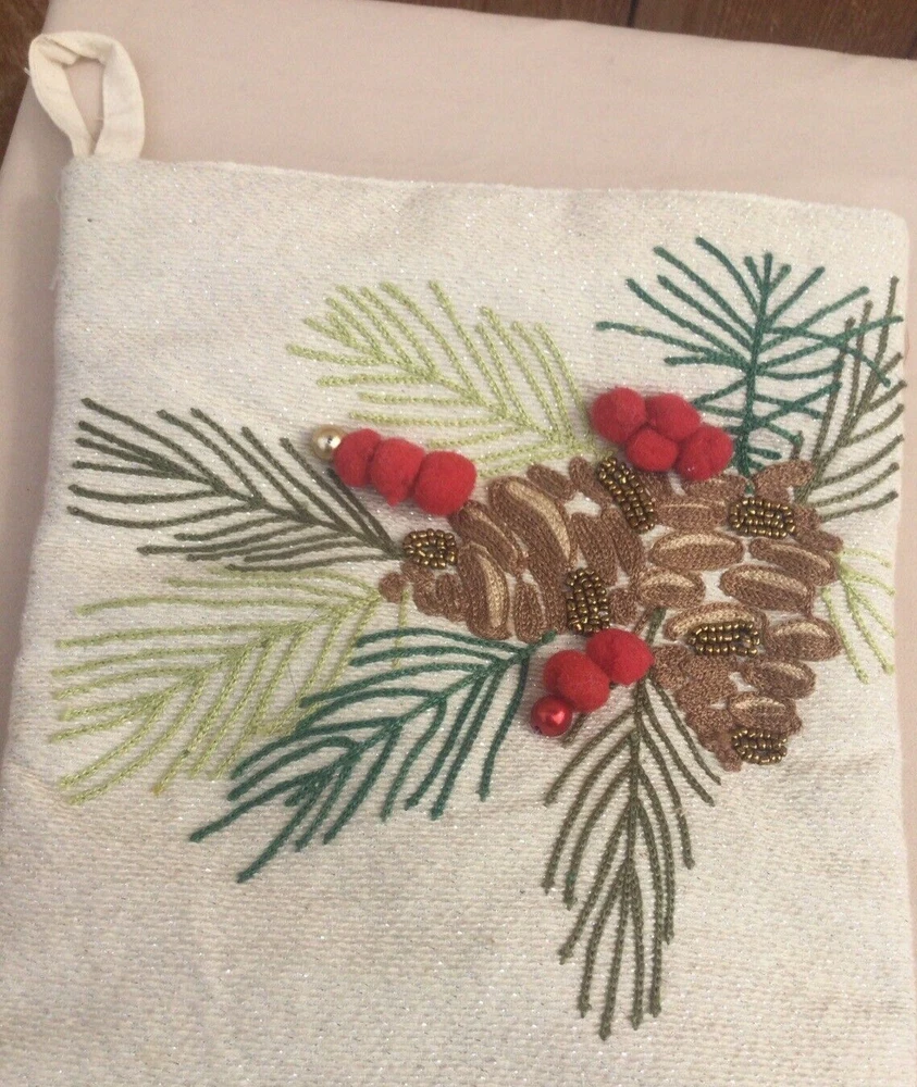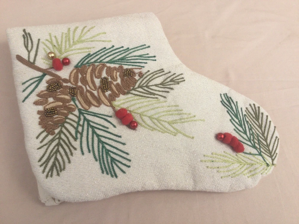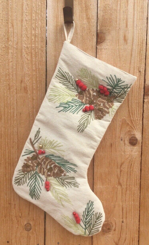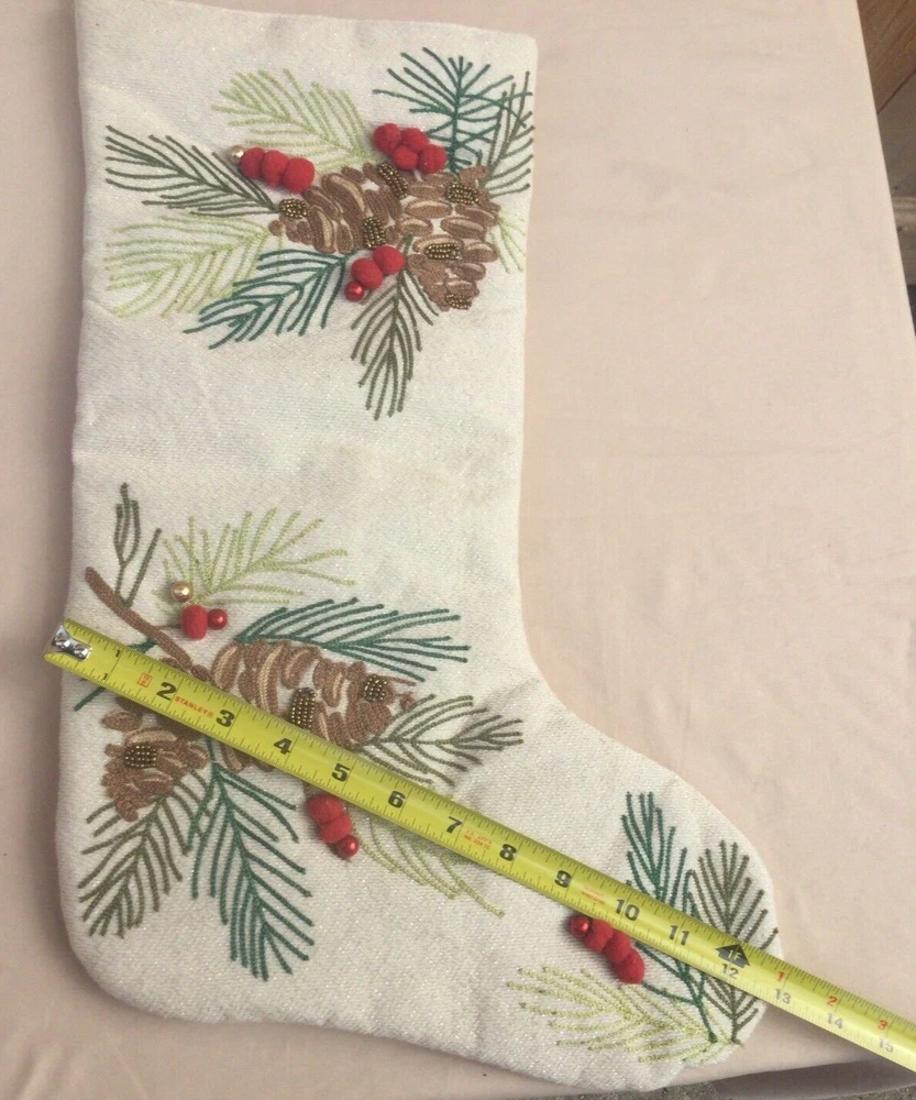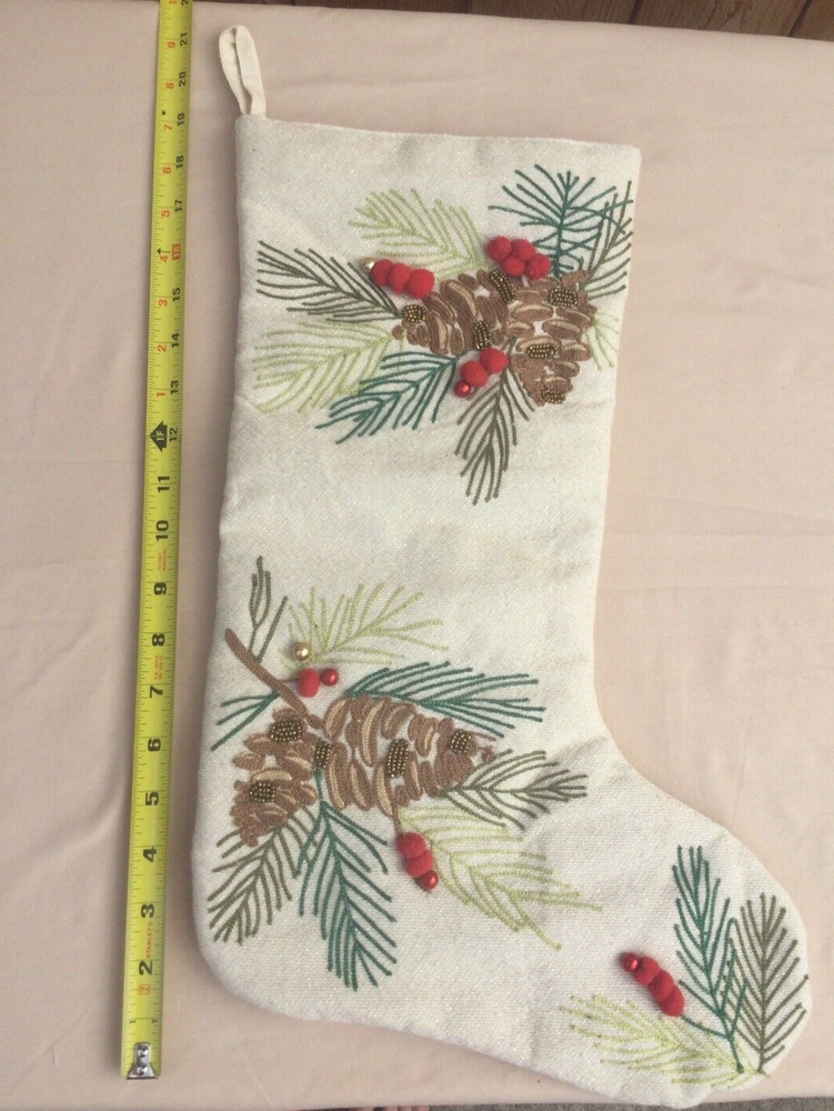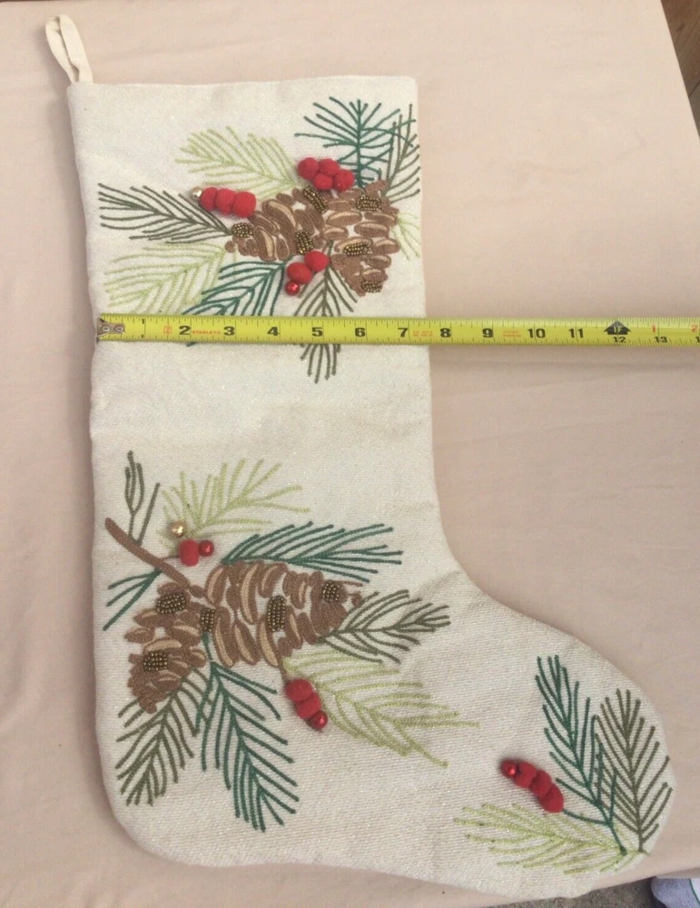 New without tag is this elegant Max Studio Home Christmas stocking beautifully decorated with embroidered pinecones; accented with a touch of seed beads and the red pompom holly berries accented with a hint of red/gold beads adding a perfect pop of color. The pine needles are embroidered in multiple colors of green. In all, the warmth of the stocking along with the twinkling silver tone metallic embroidery background, representing the evening stars, gives the final touch to the elegance and warmth of the Christmas stocking. This stocking is a perfect addition to add the warmth of the holiday season to your home. It could also be a perfect hostess gift to a family member, friend, or colleague. Details: · Brand: Max Studio Home · Color: Multicolor · Pinecones & Holly Berries · Approximate Measurements (See Photos) · Ideal for the Christmas Holiday or Gift Giving · Material: o Front: 93% Cotton | 7% Metallic o Back: 100% Cotton o Filling: 100% Polyester Fiber · Exclusive of Decoration · Spot Clean Only · RN 75343 · Made in India My home is smoke free. Measuring tape, ruler, skeleton key, and/or display are NOT included. Please scrutinize photos for accuracy, condition, and detail as they are considered your description. Item is new without tag. Coloring may be different due to lighting and/or screen display setting differences. Thank you for purchasing and/or viewing my eBay item(s)! All sales final…No refunds.