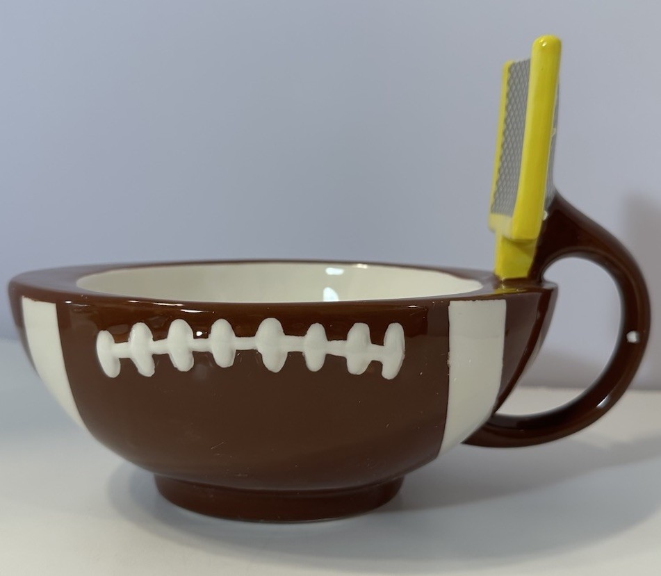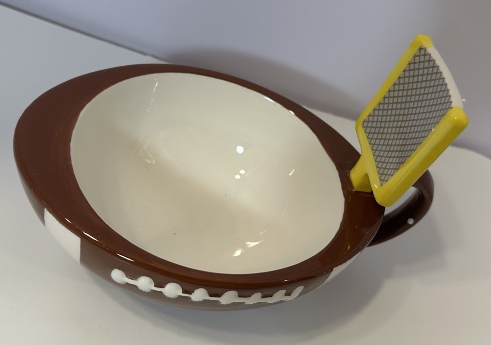The Maxis Creation Ceramic Football Dip Bowl Large Mug is a unique and stylish piece perfect for any sports enthusiast. This handcrafted ceramic bowl features a football shape and design, making it a standout addition to any home decor. Ideal for all occasions, this dipping bowl can be used for snacks or as a quirky large mug for enjoying your favorite beverages. With a shiny finish and brown color, this piece is both practical and visually appealing, making it a great gift for Father's Day or any sports lover in your life.