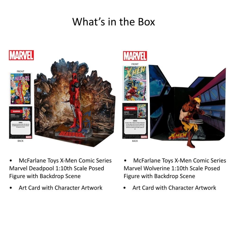 Absolutely love this duo! The detail on both Wolverine and Deadpool is insane—dynamic poses that look straight out of the comics. The included scene backdrops add so much character, making them perfect for display. Packaging is pristine, and they feel solid and high-quality. A must-have for any Marvel collector!