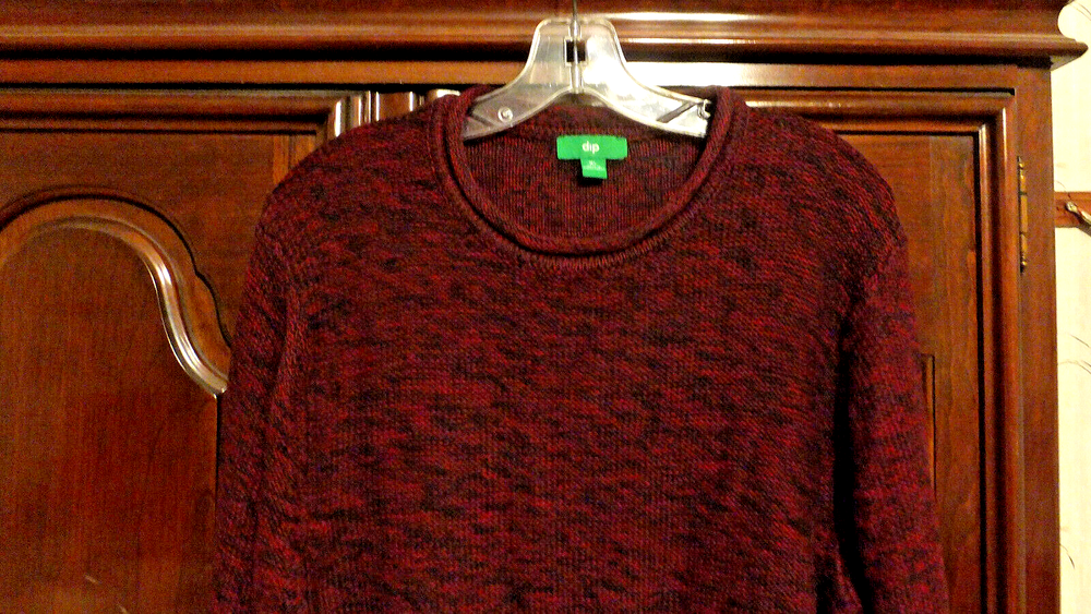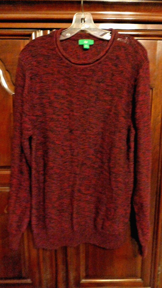 Never worn by grandson, in new condition, this is a burgandy and black mottled sweater by Dip and is 83% cotton and 17% acrylic. No snags. No stains, no tears. Chest is 22 inches across the front and is 30 inches from shoulder to hem. Sleeves are 26 inches from shoulder to hem. Smoke free and pet free home. Shipping is $7.99
