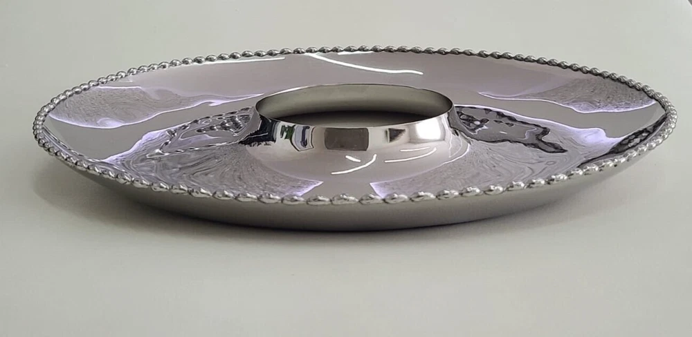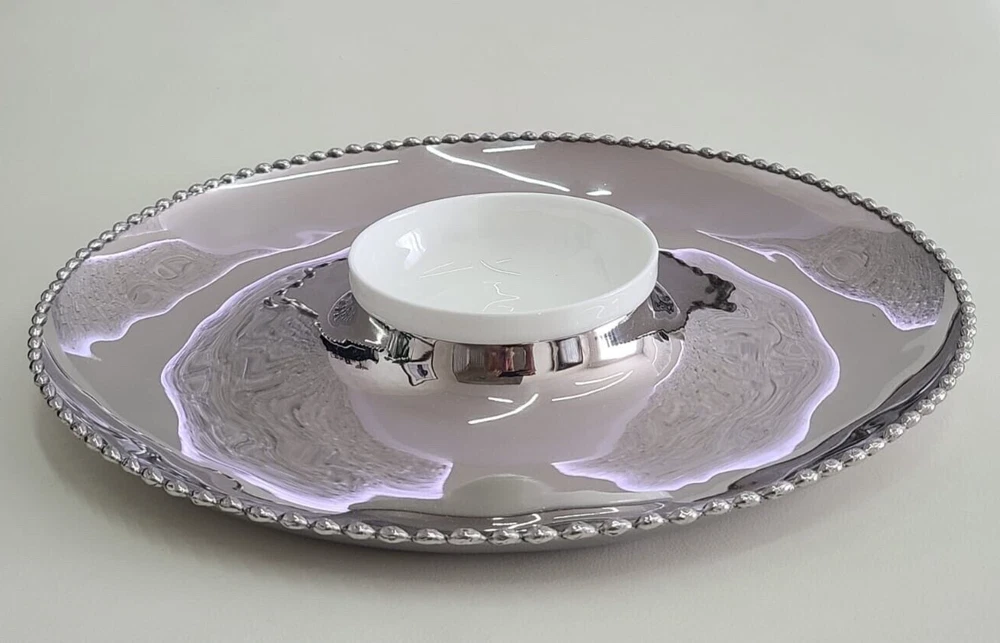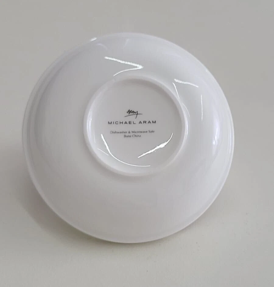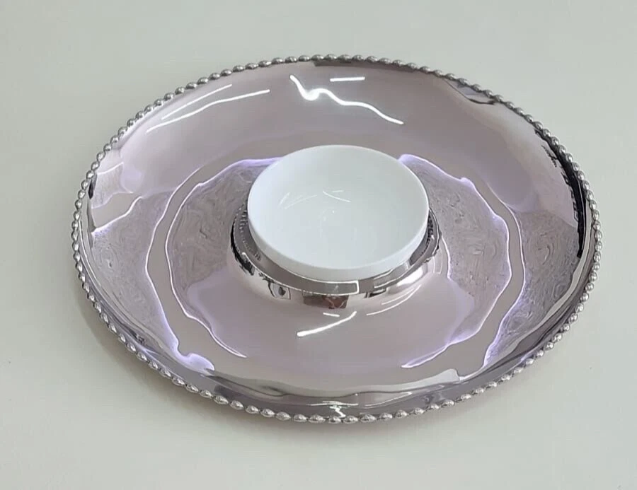 Add a touch of modern elegance to your dining experience with this Michael Aram Molten Bone China Chip & Dip set. Crafted from high-quality stainless steel, this set features a solid pattern with two compartments for chips and dip, perfect for all occasions. The round shape and large size of 14 inches in diameter make it an ideal addition to any kitchen or dining table. Not only is this set stylish, but it is also practical with features such as a tray and dishwasher-safe parts. The set weighs 2 pounds and comes in a set of two with each piece having a diameter of 14 inches. Impress your guests with this beautiful and functional set that is sure to make any meal a memorable one.