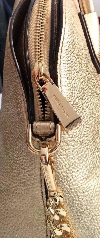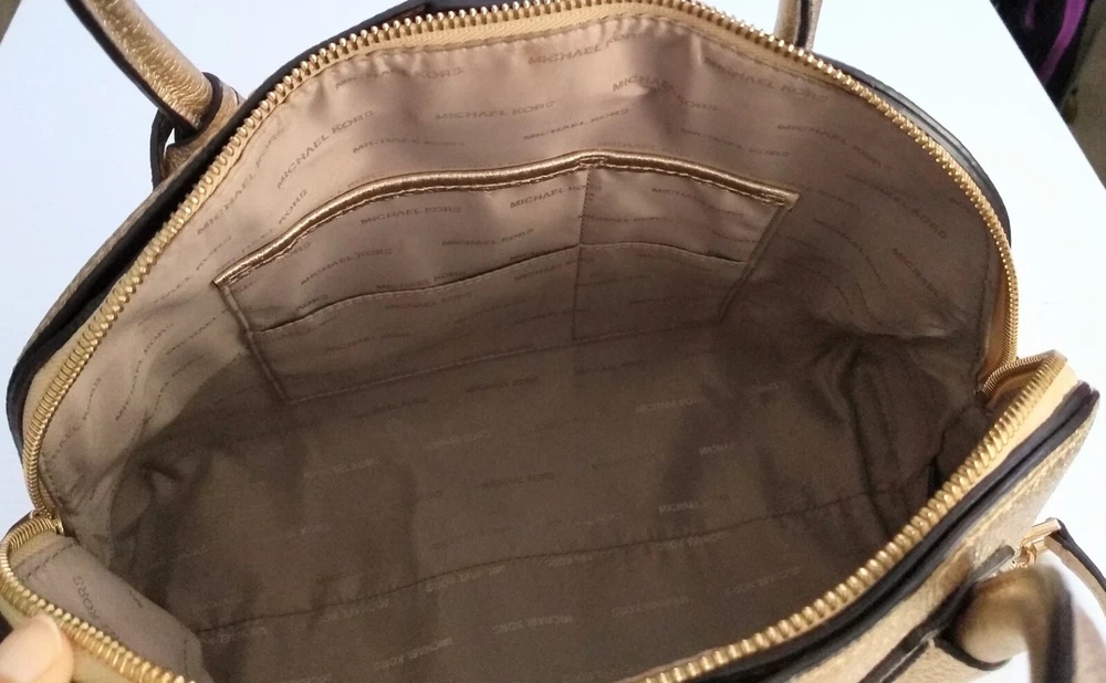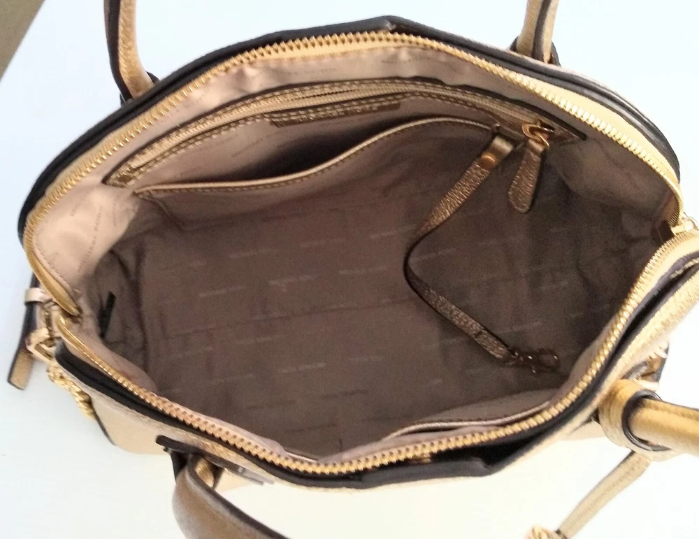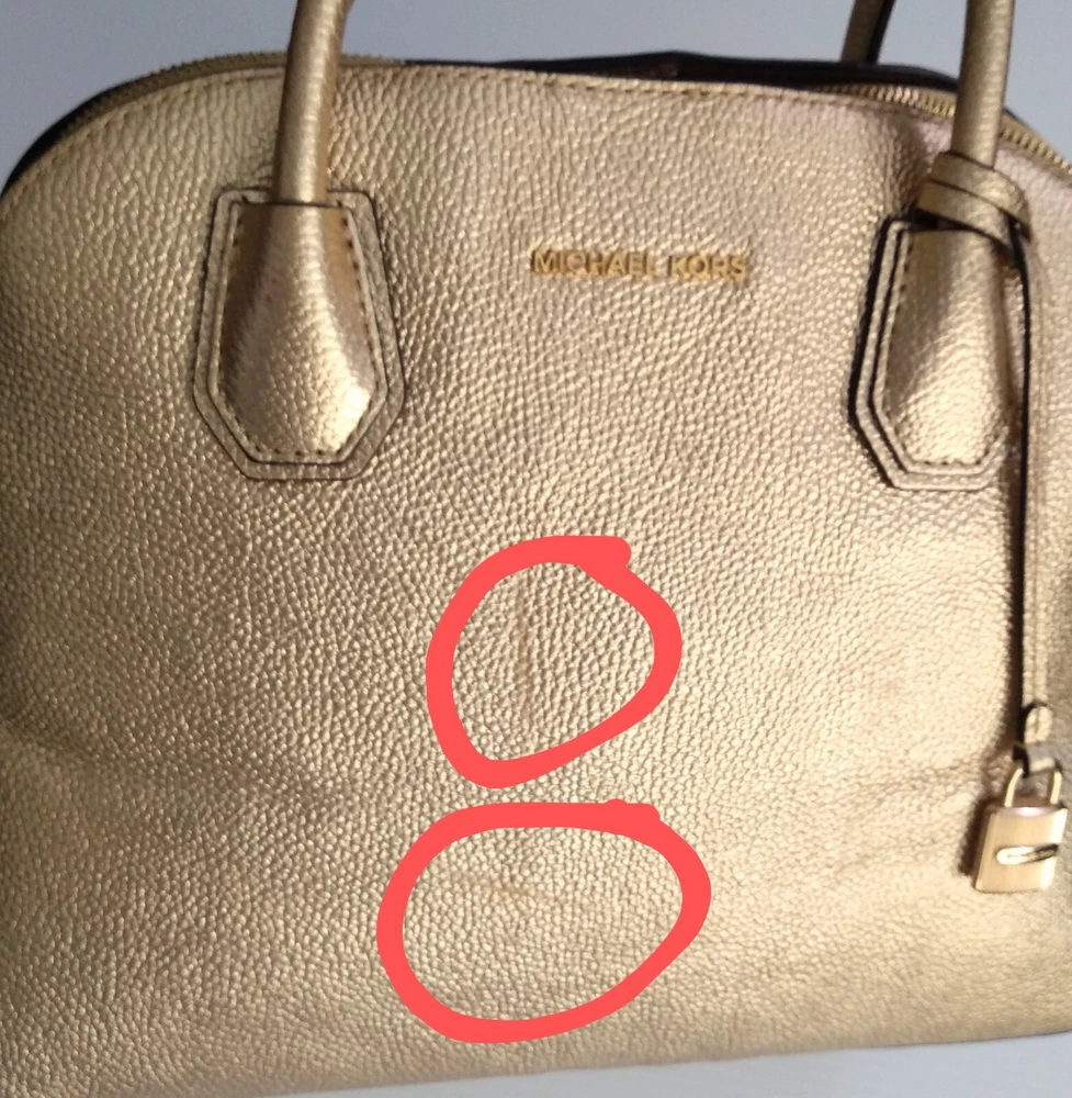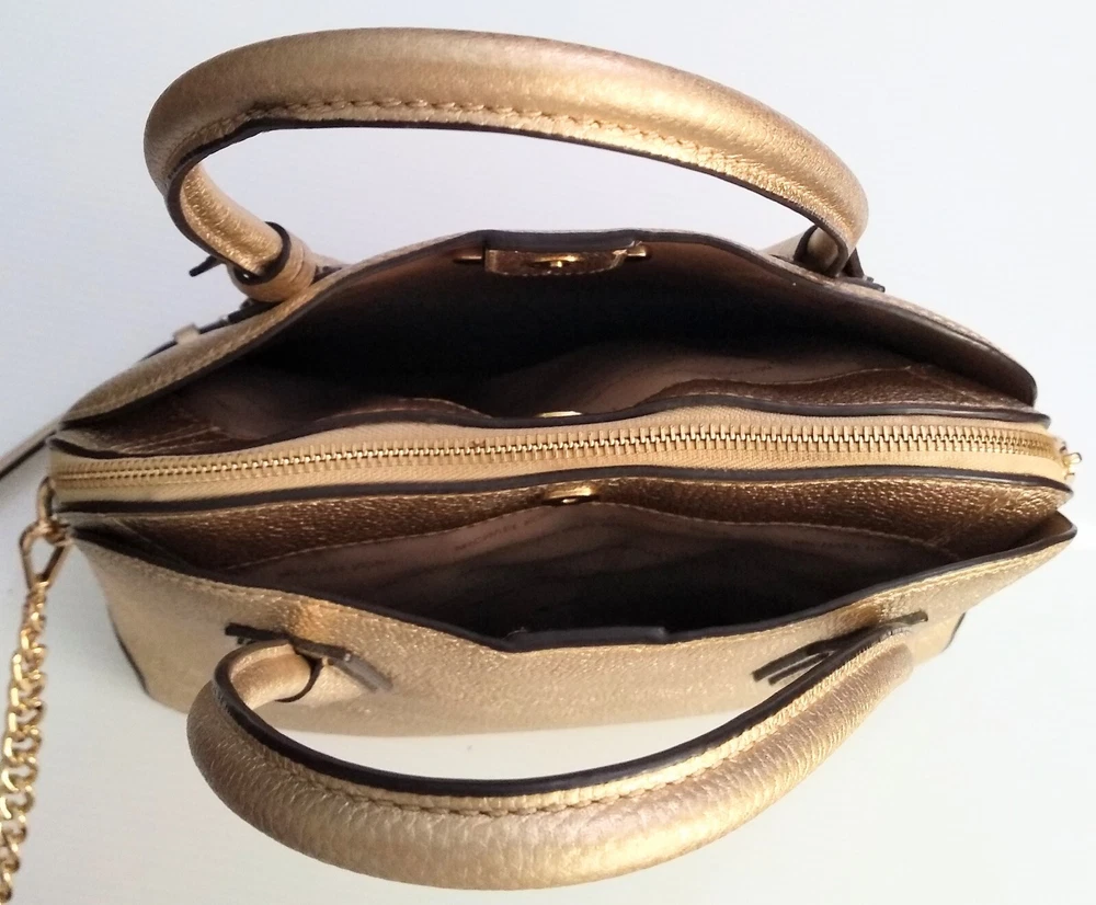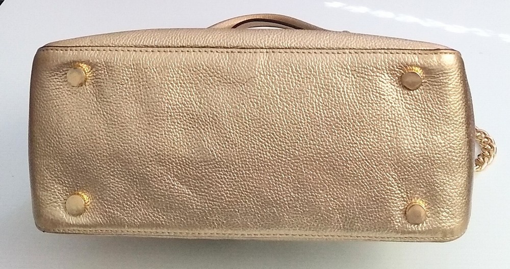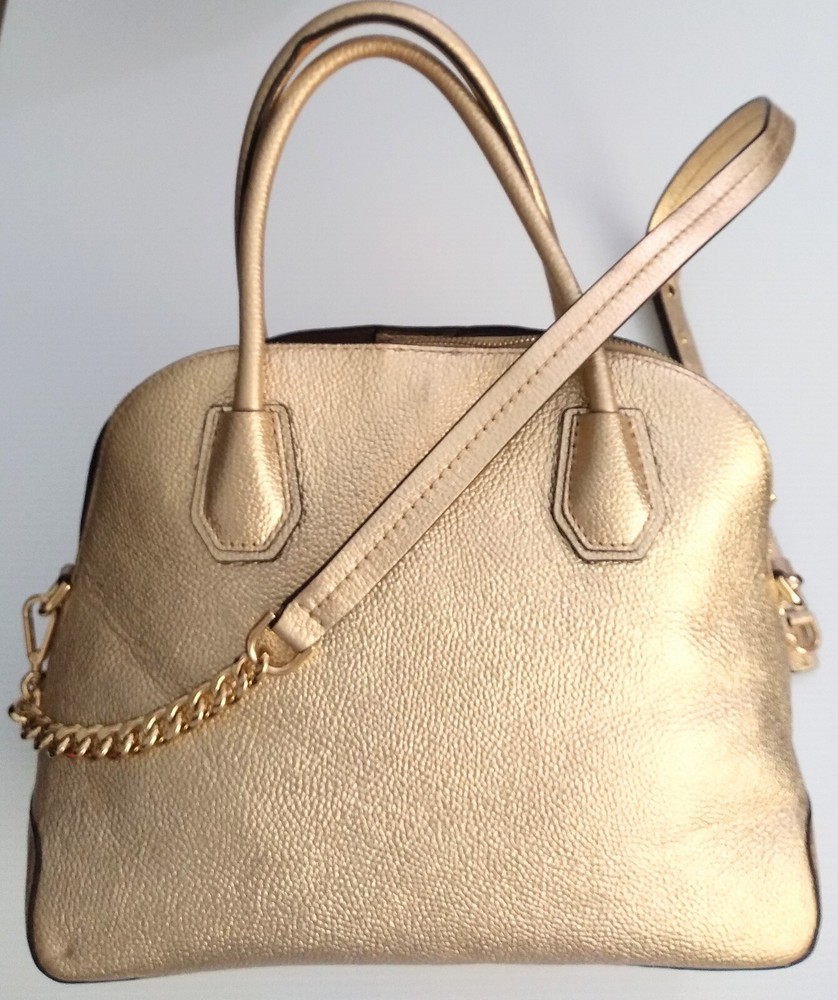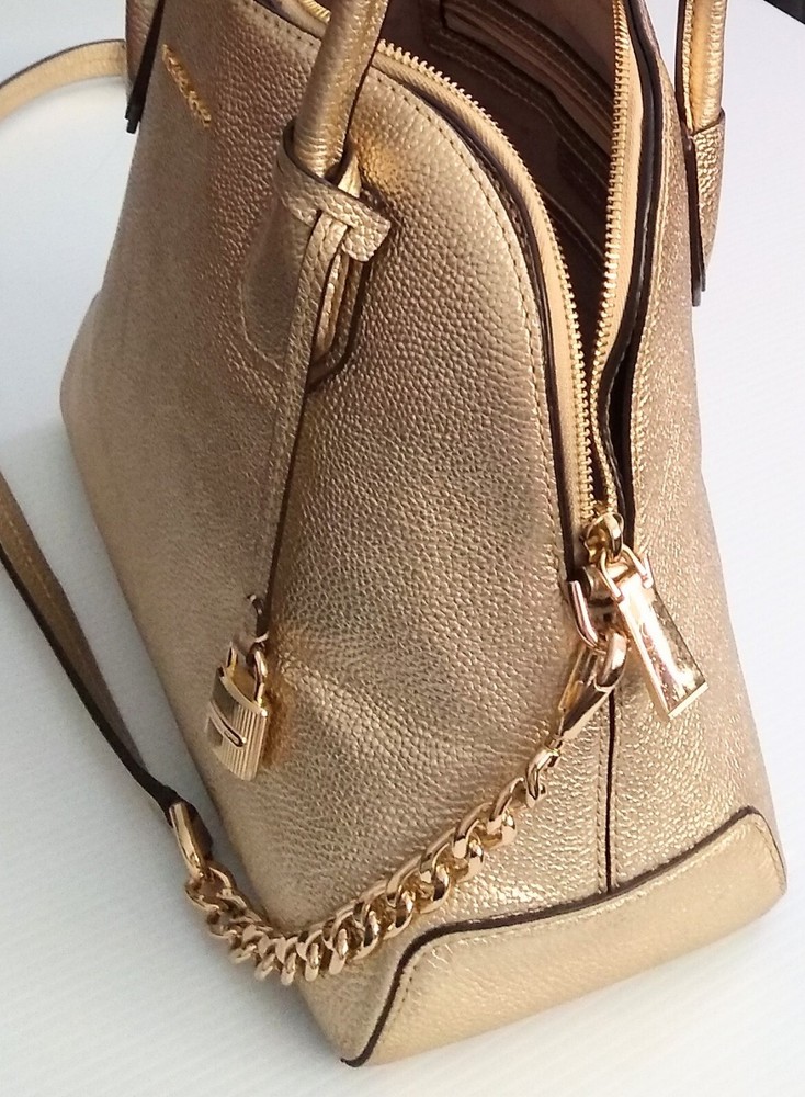 Michael Kors Studio Mercer Gold Leather Dome Satchel Shoulder Bag Charm. 100% Pebbled Leather, Gold-Tone Hardware 12.5"W X 10"H X 5"D Handle Drop: 4.5", Adjustable Strap: 14.5"-17" Exterior: 2 Magnetic Snap Compartments Interior: 1 center zip compartment with 1 zip pocket & 5 slip pockets inside Great Pre-Owned Condition Very clean condition interior and exterior has scuff marks in front, light wear on bottom corners and the back of the handle no rips or tears. (See photos for details)