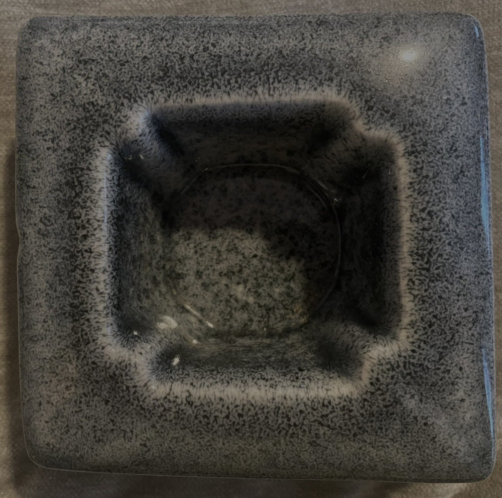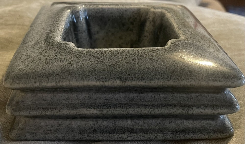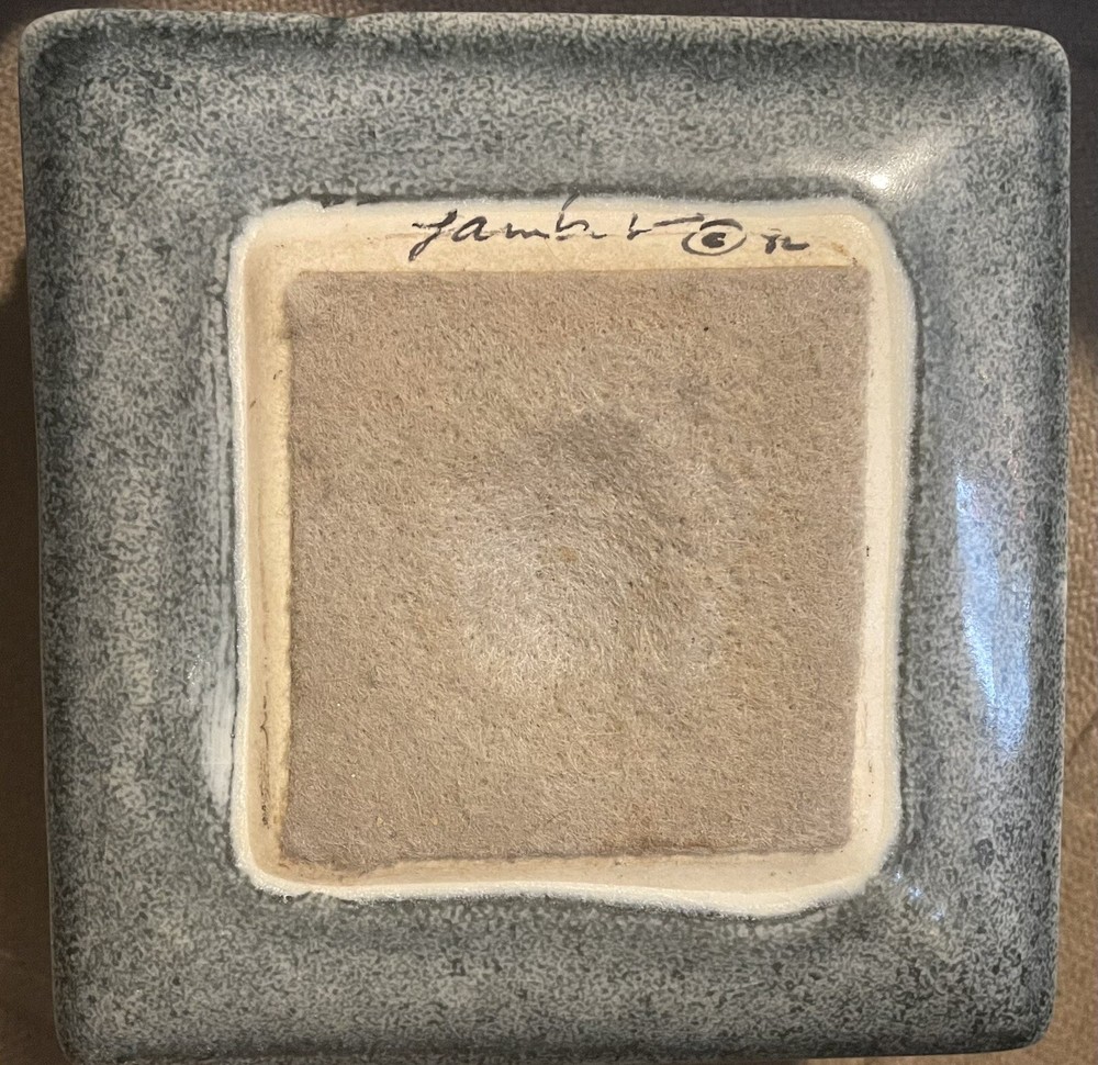 This Michael Lambert Studio Art Pottery 1982 Square Trinket Candle Holder is a unique piece of art that will definitely add a touch of elegance to any room. Made with clay, this antique holder is designed in an abstract form and finished with a glossy texture. The gray color and solid pattern make it a perfect fit for any home decor. Signed by Michael Lambert himself, this late 20th century (1970-1999) piece is an original and handmade production of art pottery. The United States origin and backstamp of the product line ensure its quality. This vintage item of Arts & Crafts/Mission Style is a must-have for any art collector or lover. Size: 4 6/8” x 4 1/4” x 1.5”