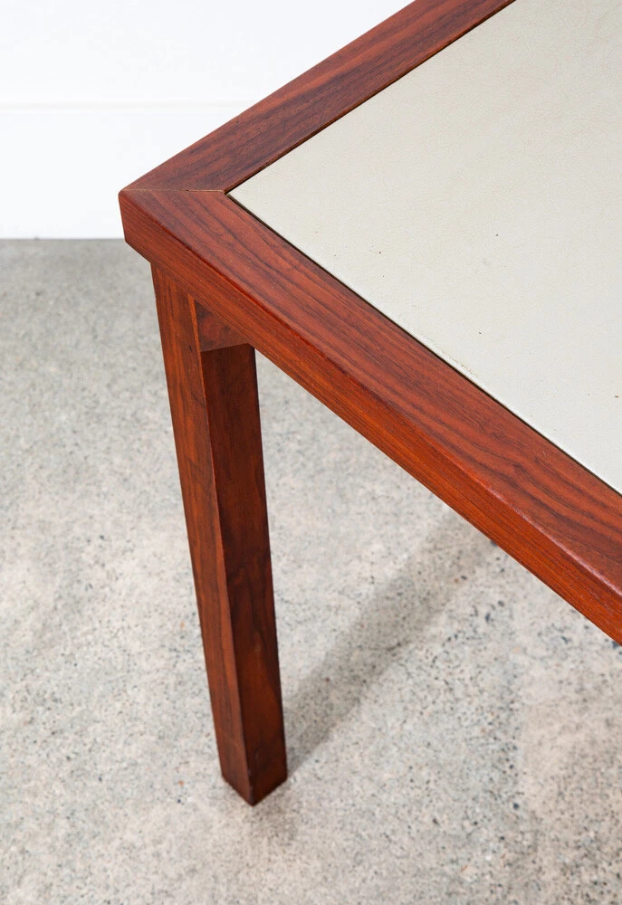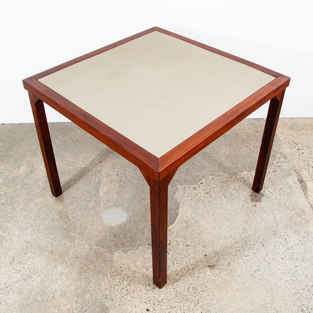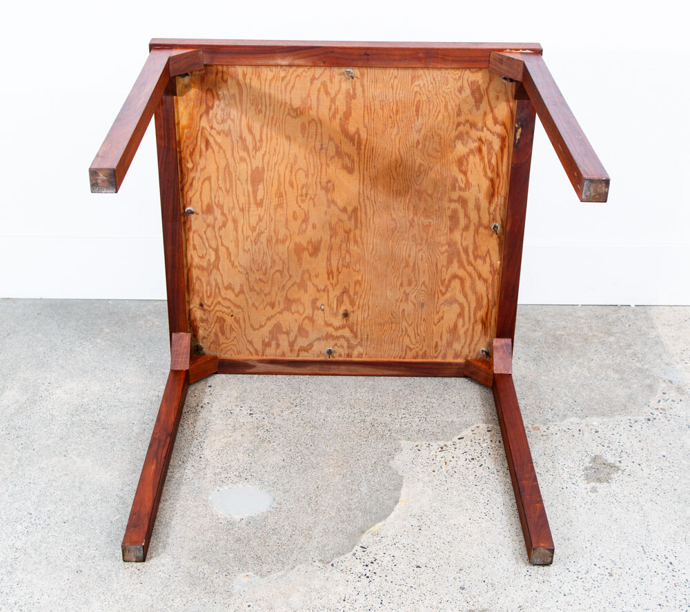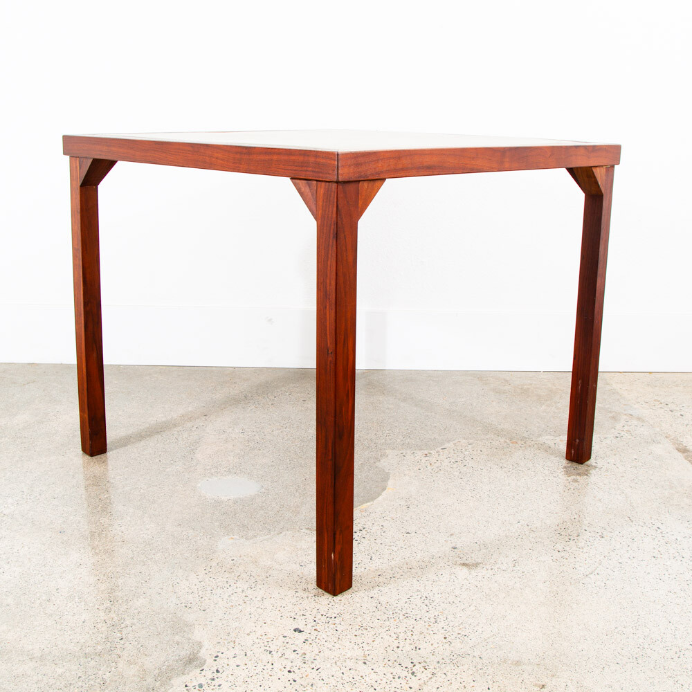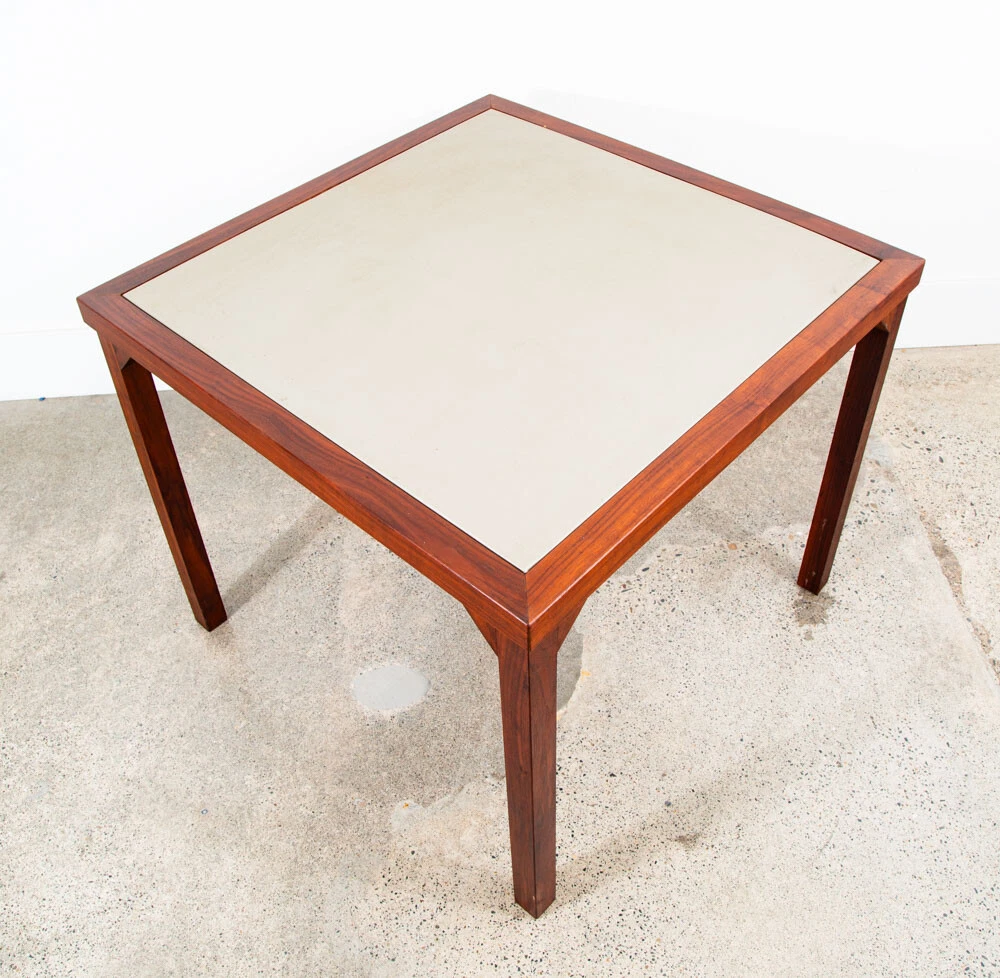 Solid walnut custom square card table in outstanding condition. Each leg as well as the trim is made up of figured solid black walnut. The center of the table offers a taupe vinyl or laminate surface. Unique and sturdy. Looks great in any space. Please see all photos to ensure you know what you are buying. FREE SHIPPING included in the listing price to your home or space via FedEx or USPS Measures: 30 W x 30 D x 16 H Condition report: Near mint original condition. Unstamped example. Sturdy and structurally sound. 9.5/10 condition rating. Exceptions to free shipping: Overseas, incl. HI & AK (location dependent, but shipping charged at cost) If your location requires a ferry, customer is required to cover any and all extra transportation costs to and from the delivery location. For our professional and fully insured shipping company, we will need to confirm your shipping address and phone number so the driver can coordinate a date and time with you and deliver your item directly to your desired address. Upon shipment, we will be unable to provide a tracking number, but I will provide you the courier's contact information for you to call and check on your item. I cannot ship the item without your communication. Since we offer the free shipping, we reserve the right to choose the option that ensures the best shipping service. We also offer pickup at our main office in Sacramento, CA for a discounted rate. At Mid Century Sacramento, we source, restore, and carefully curate iconic 20th century/mid century modern designs to time capsule condition. We view good furniture design as the same as functional art and our goal is to put that art into your hands. Our services include staging, restoration, and reupholstery services. Per request, we can make any changes or updates (such as upholstery or restorations) to your item at cost through professional contractors. Feel free to contact me if you have any questions. Thank you for your interest in my item.