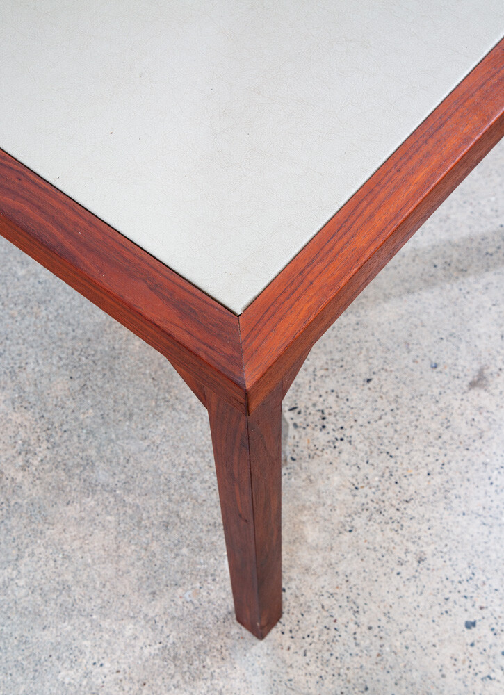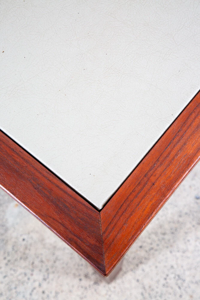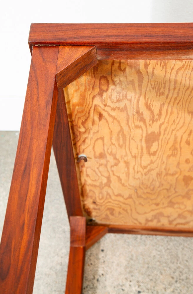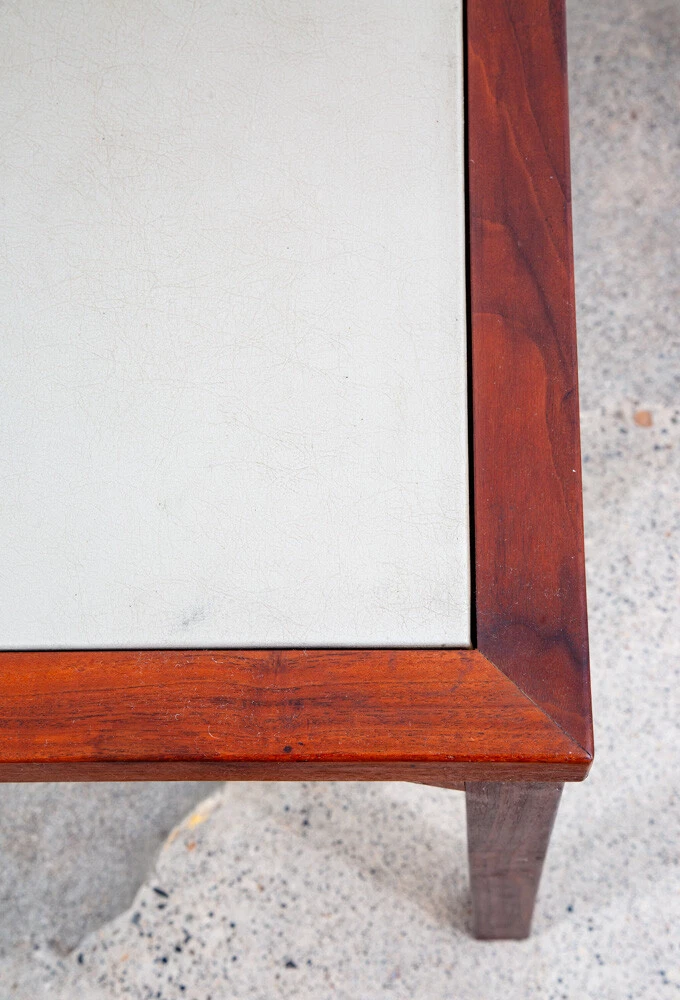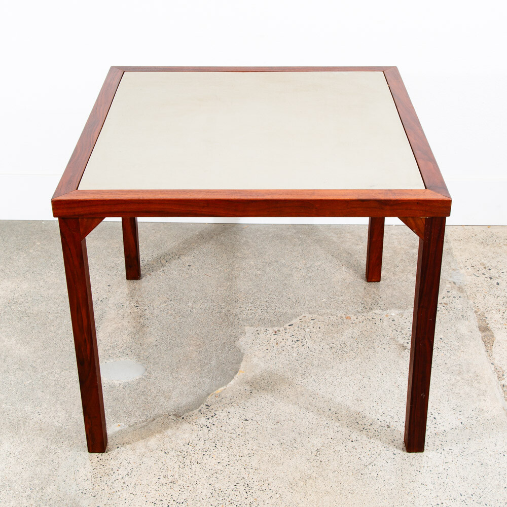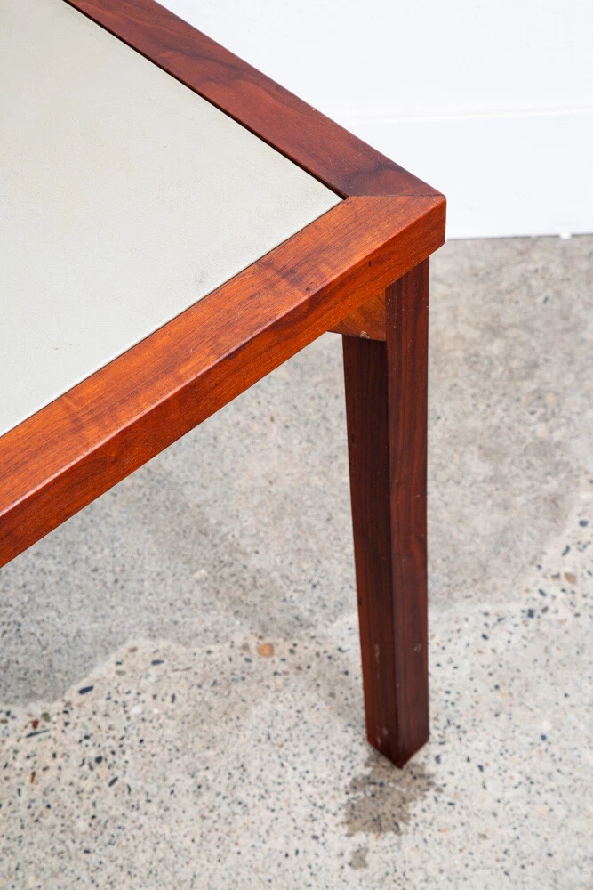 Solid walnut custom square card table in outstanding condition. Each leg as well as the trim is made up of figured solid black walnut. The center of the table offers a taupe vinyl or laminate surface. Unique and sturdy. Looks great in any space. Please see all photos to ensure you know what you are buying. FREE SHIPPING included in the listing price to your home or space via FedEx or USPS Measures: 30 W x 30 D x 16 H Condition report: Near mint original condition. Unstamped example. Sturdy and structurally sound. 9.5/10 condition rating. Exceptions to free shipping: Overseas, incl. HI & AK (location dependent, but shipping charged at cost) If your location requires a ferry, customer is required to cover any and all extra transportation costs to and from the delivery location. For our professional and fully insured shipping company, we will need to confirm your shipping address and phone number so the driver can coordinate a date and time with you and deliver your item directly to your desired address. Upon shipment, we will be unable to provide a tracking number, but I will provide you the courier's contact information for you to call and check on your item. I cannot ship the item without your communication. Since we offer the free shipping, we reserve the right to choose the option that ensures the best shipping service. We also offer pickup at our main office in Sacramento, CA for a discounted rate. At Mid Century Sacramento, we source, restore, and carefully curate iconic 20th century/mid century modern designs to time capsule condition. We view good furniture design as the same as functional art and our goal is to put that art into your hands. Our services include staging, restoration, and reupholstery services. Per request, we can make any changes or updates (such as upholstery or restorations) to your item at cost through professional contractors. Feel free to contact me if you have any questions. Thank you for your interest in my item.