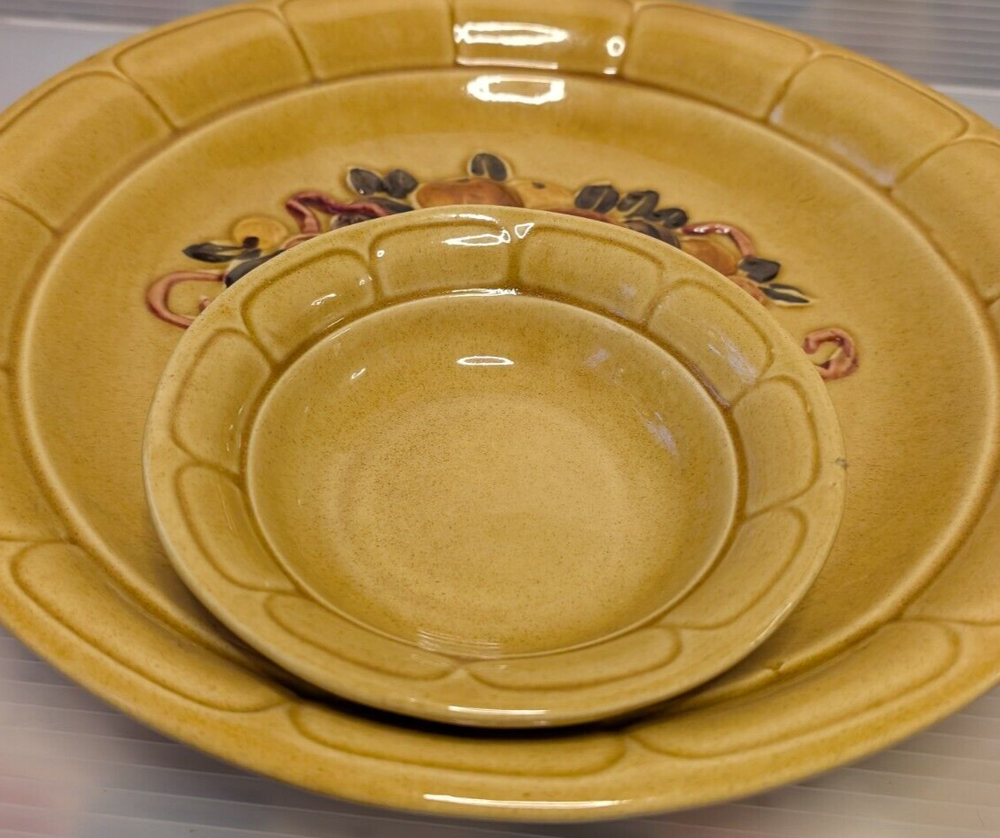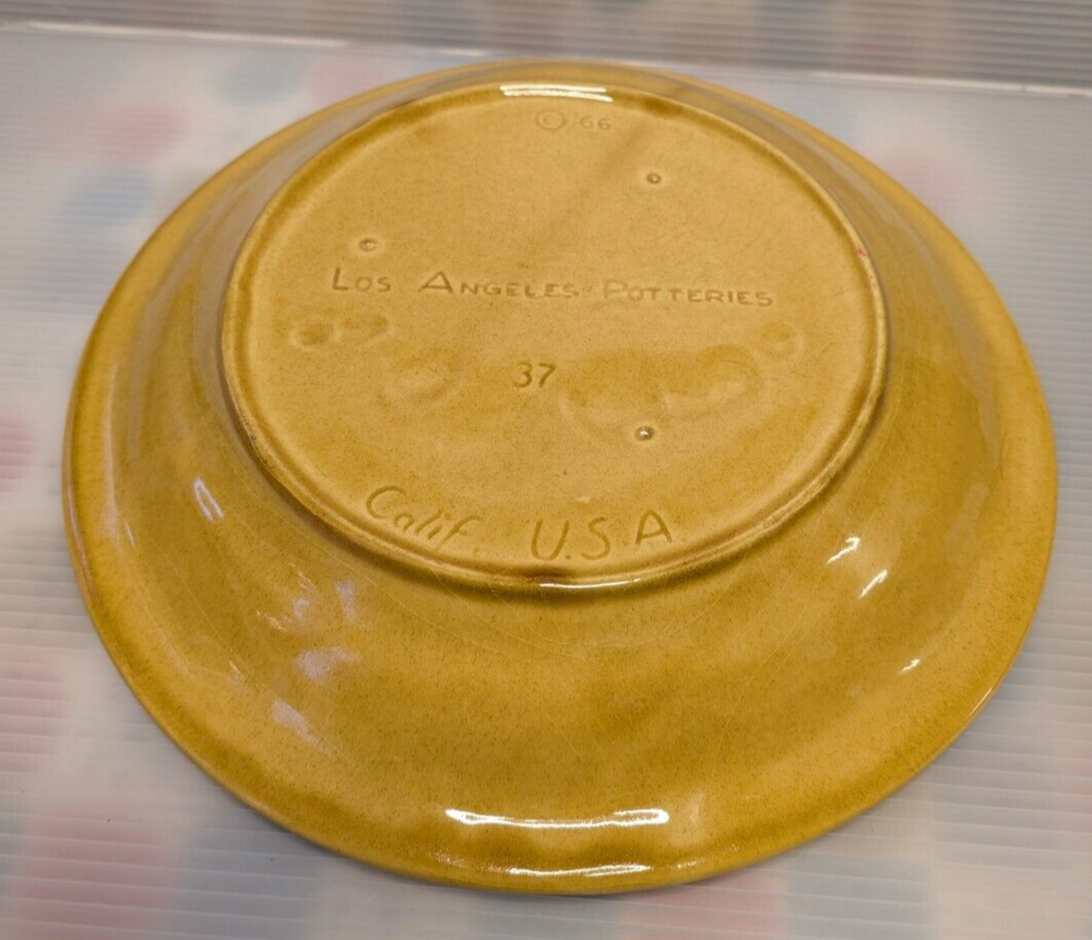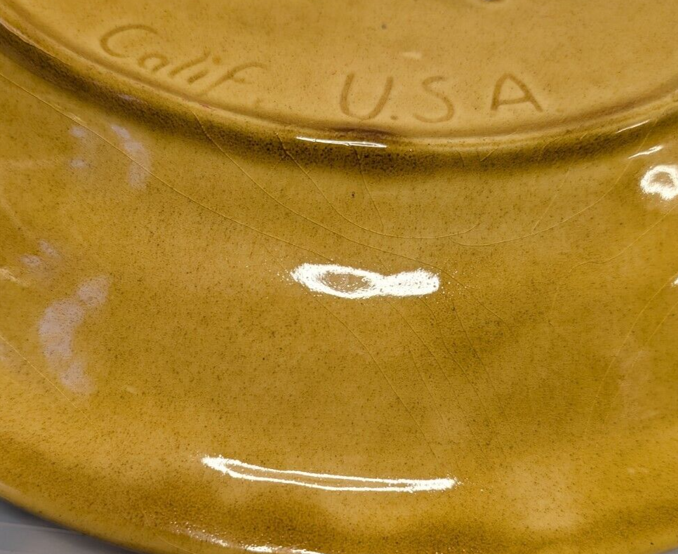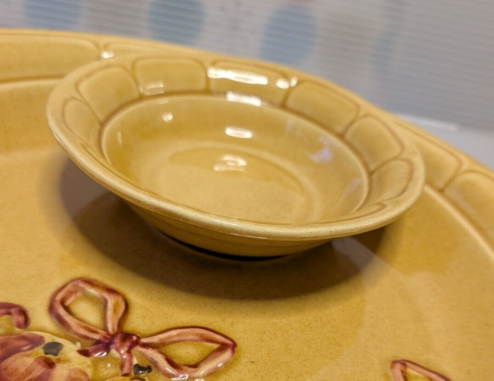 This is a vintage 1966 Los Angeles Potteries chip & dip platter, featuring a round shape with a glossy gold finish. It has two compartments (the bowl is attached), a fruit pattern, and a decorative design in a Mid-Century Modern style. The platter is 14.25 inches long and 2 inches high, suitable for hand washing only. It is an original production art pottery piece from the United States.