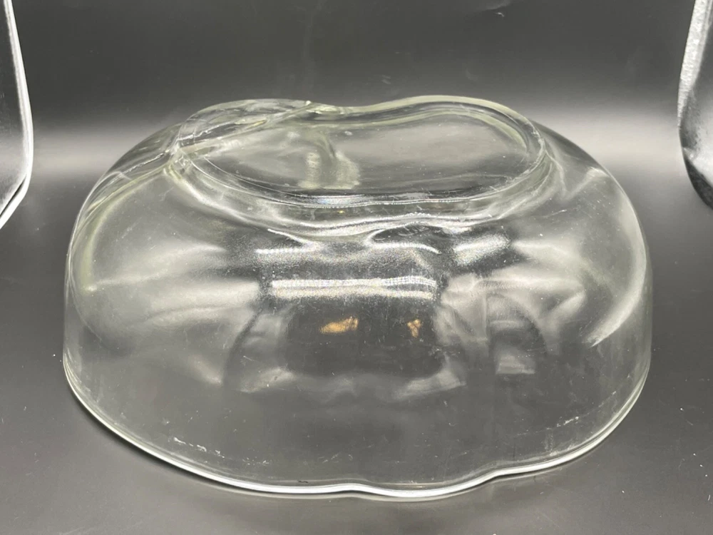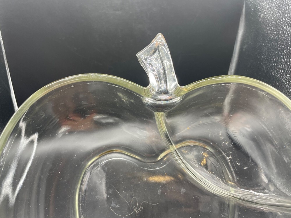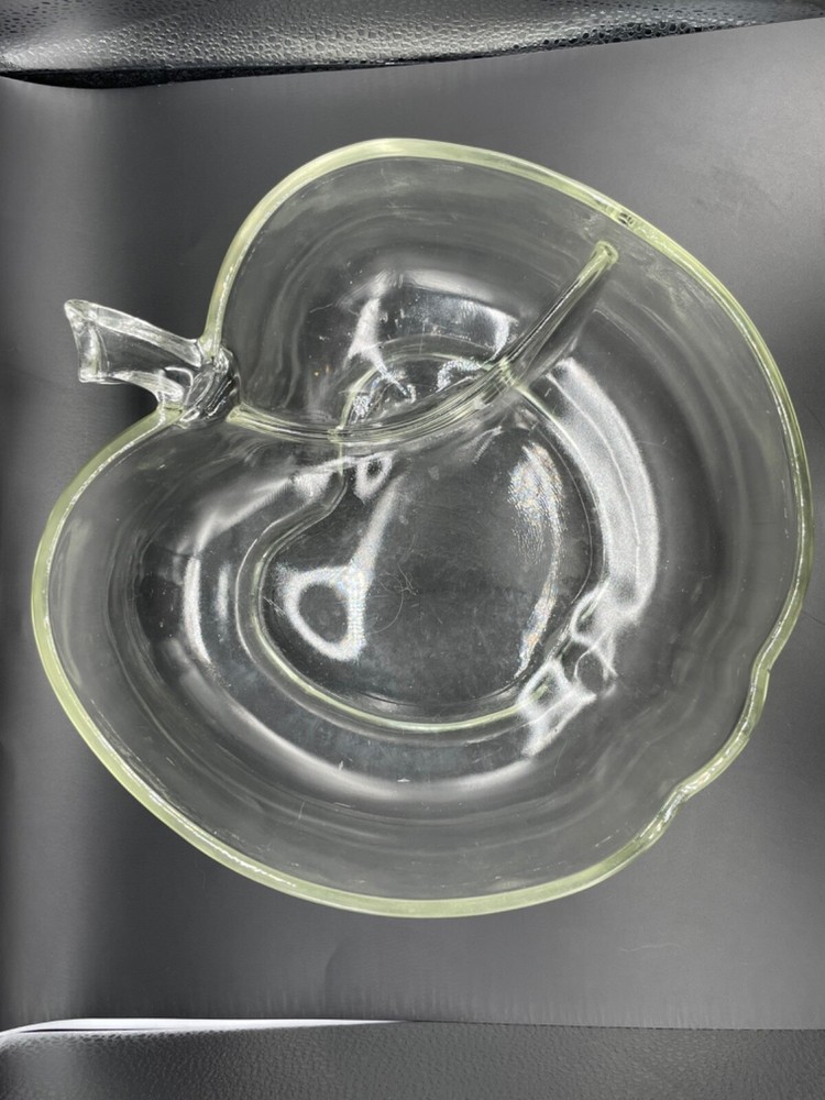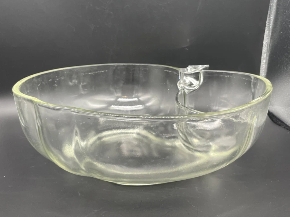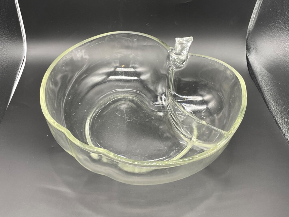 Mid century, clear glass, apple shaped chip and dip bowl Separate space for a dip Measures 10 1/4” x 10 7/8” x 3 1/2” high No cracks or chips Tub 1/28/25