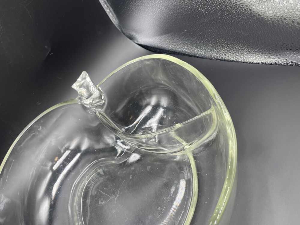 Mid century, clear glass, apple shaped chip and dip bowl Separate space for a dip Measures 10 1/4” x 10 7/8” x 3 1/2” high No cracks or chips Tub 1/28/25...