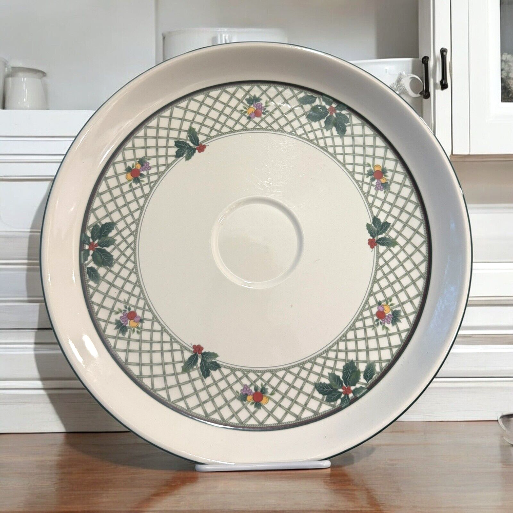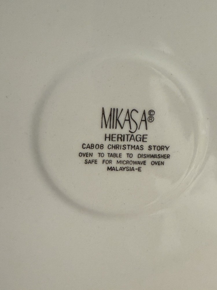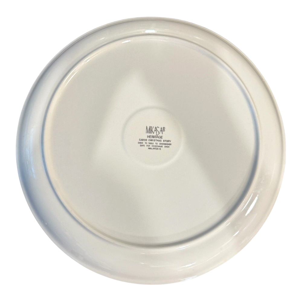 This Mikasa Heritage Cabob Christmas Story 15" Chip & Dip Platter is the perfect addition to your holiday table. With a beautiful white porcelain finish and a glossy look, this serving piece is sure to impress your guests. The large size makes it ideal for serving cake, chips, or other snacks, while the intricate tree design adds a festive touch to any occasion. Crafted in Japan in the 1990s, this original Mikasa piece is part of the Heritage Cabob Christmas Story collection. The modern style and Christmas Toy Story theme make it a great gift for any collector or holiday enthusiast. Measuring 15 inches in width, this chip and dip platter is a must-have for any table decor and serving piece collection. Note that there is a circle in the center to hold a dip bowl; this is only the platter, but any other bowl could certainly be used. This would also work as a cake or cookie platter, or any other use for serving at your holiday parties - great buffet item!