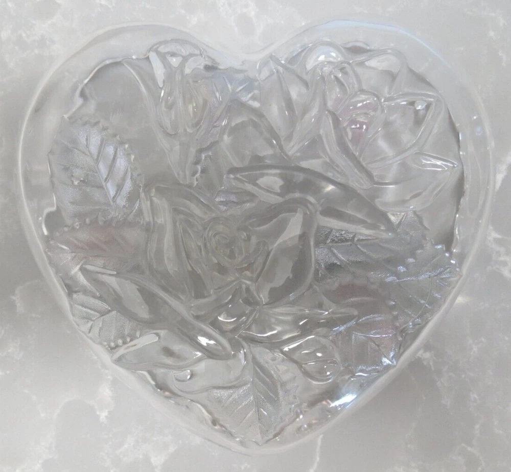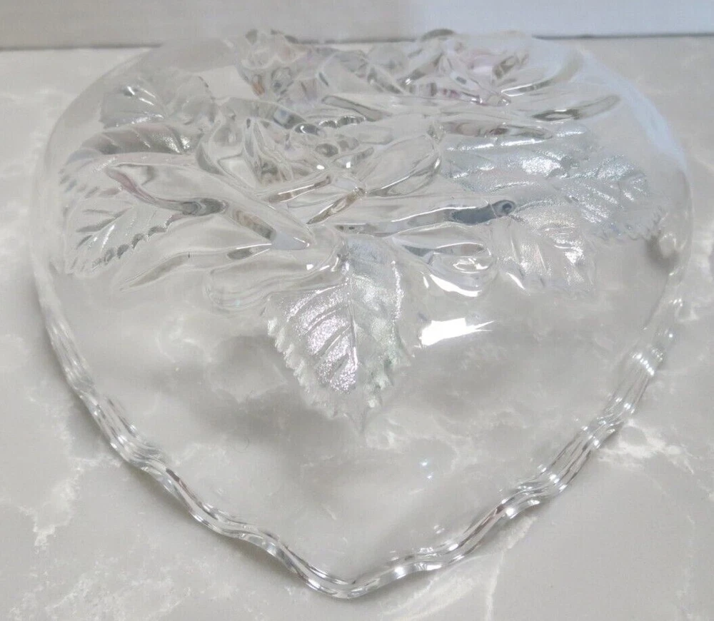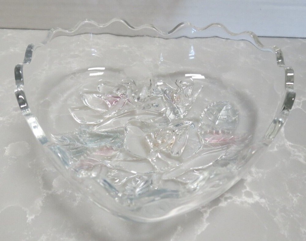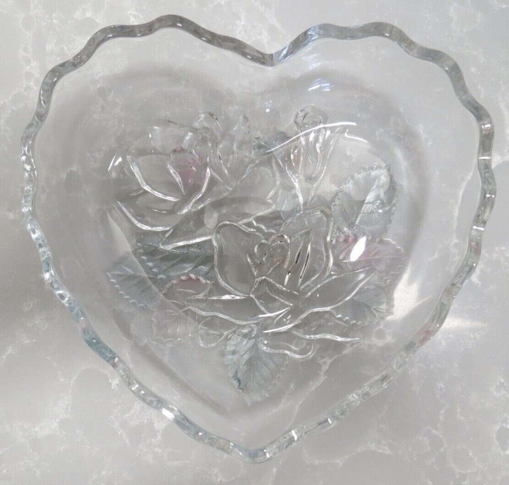 Mikasa Studio Nova Heart Shaped Clear Candy Dish Etched Roses - w/out Label 6" x 1.75" x 5.5" This does NOT come in its original packaging. Thank you for viewing my item up for sale. If you are interested in purchasing anything else from my store, I can put them in the same box to save on shipping. Do not pay for them separate. Just put them in the cart and request an invoice from me.