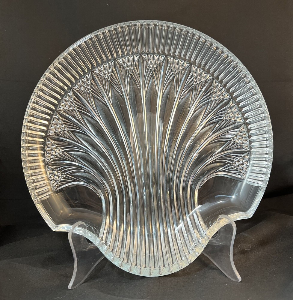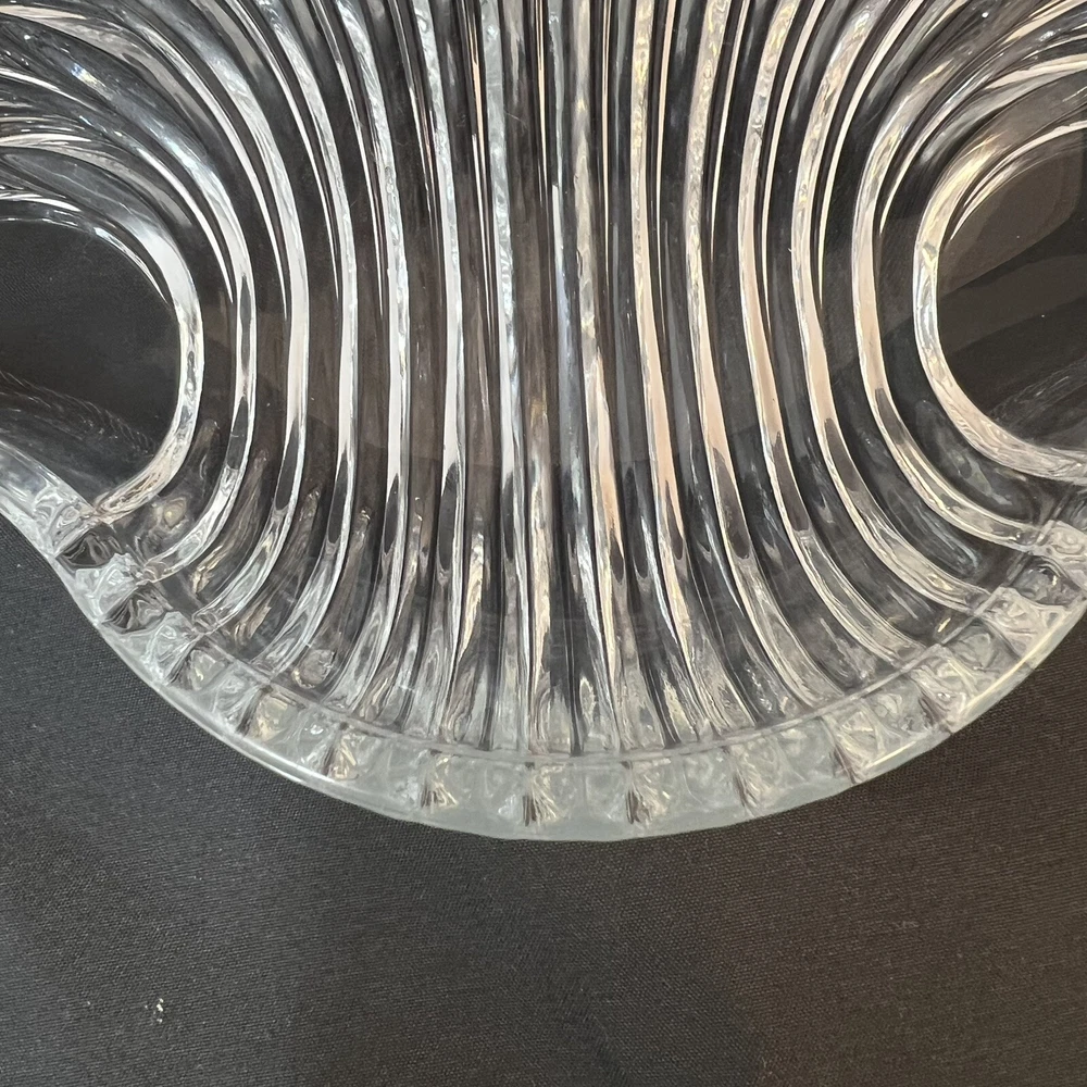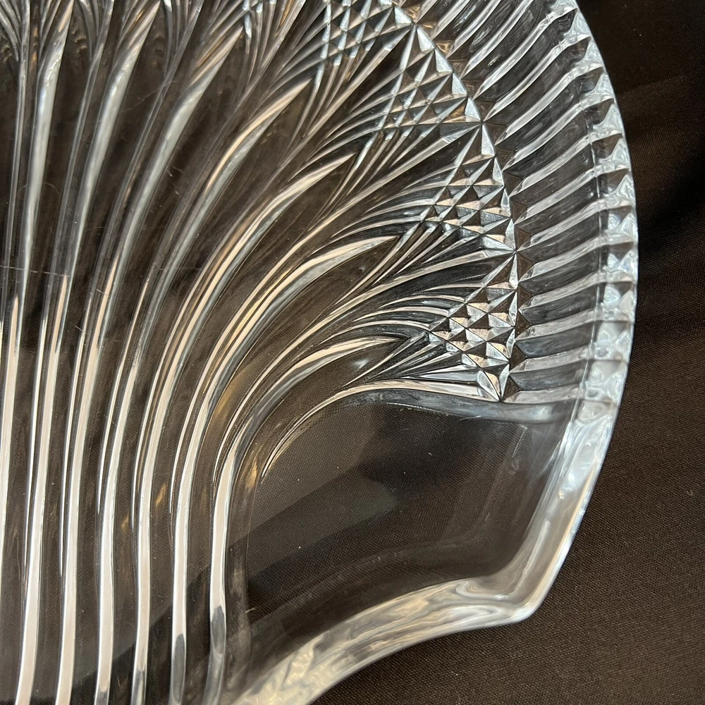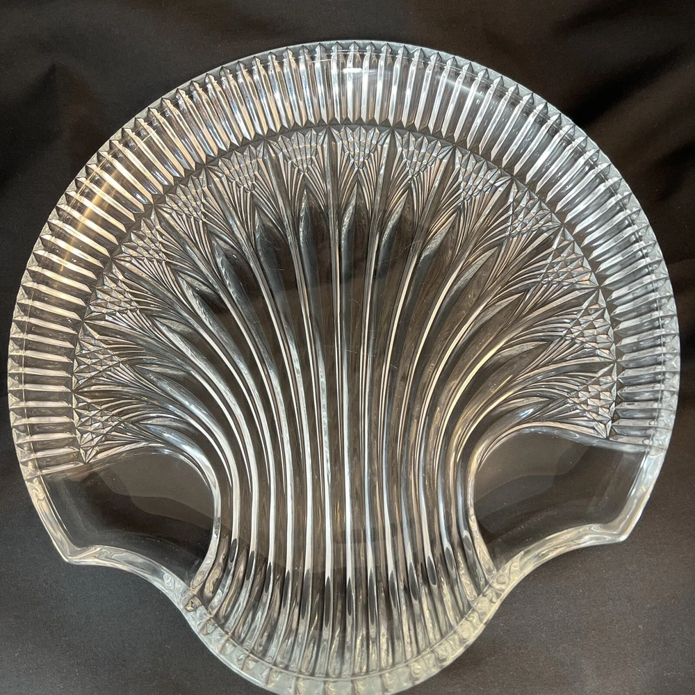 This stunning Studio Nova Pearl Surprise crystal serving platter is a must-have for any collector or lover of art deco design. Made in Japan by Mikasa, this round platter features a beautiful shell shape and a glossy finish. The clear crystal material adds a touch of elegance to any table setting and is perfect for serving your favorite dishes. The shell design creates a handle so this tray can comfortably be used for passed hors d'oeuvres. With a diameter of 10.5 inches and a weight of 2 pounds and 7 ounces, this platter is both functional and stylish. The Art Deco shell design and Studio Nova Pearl Surprise production line make it a unique addition to any collection. This platter is perfect for serving guests or as a special gift. Excellent condition. No chips cracks scratches.