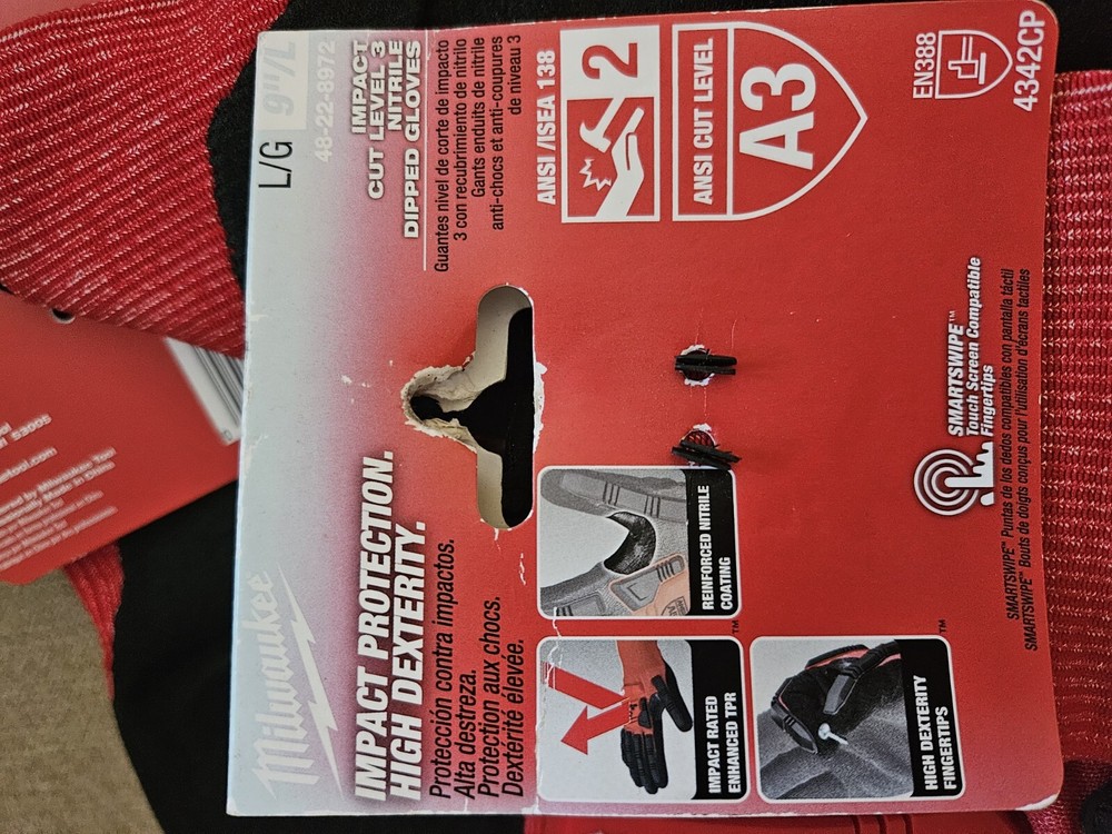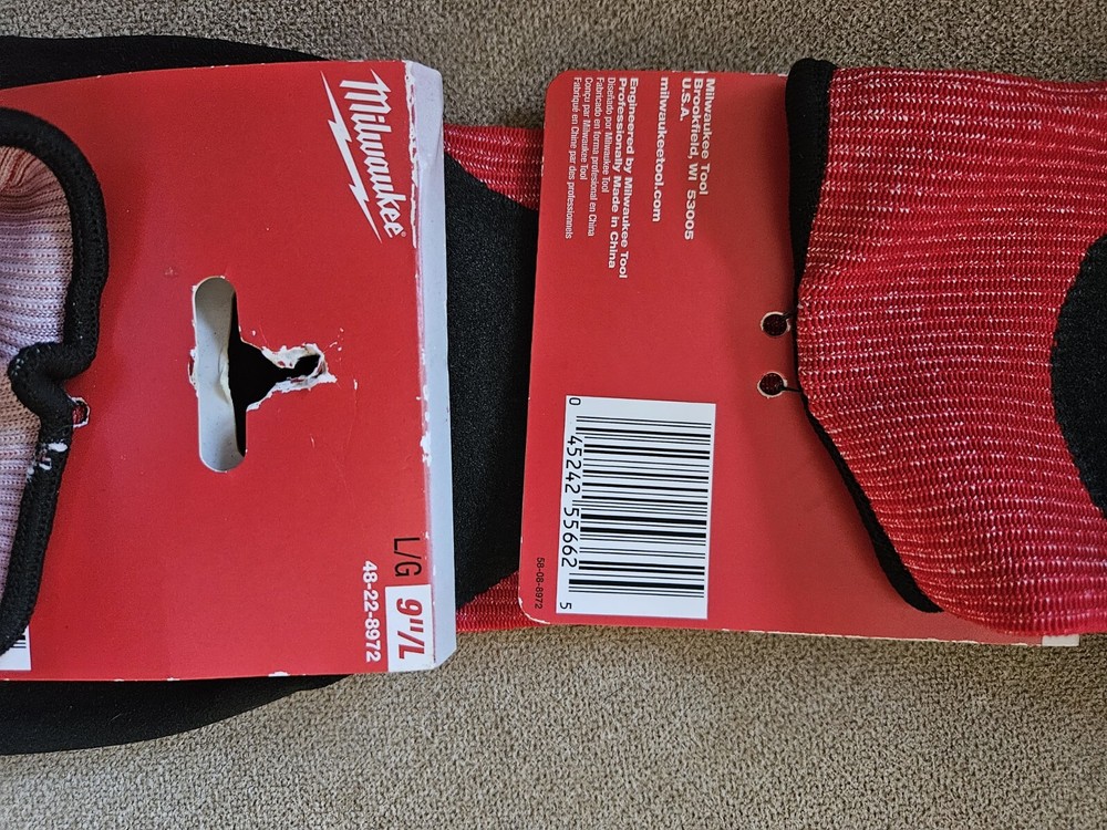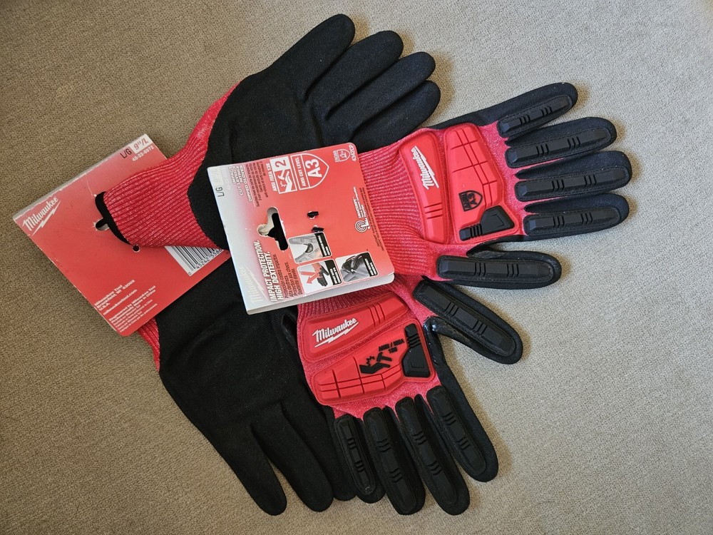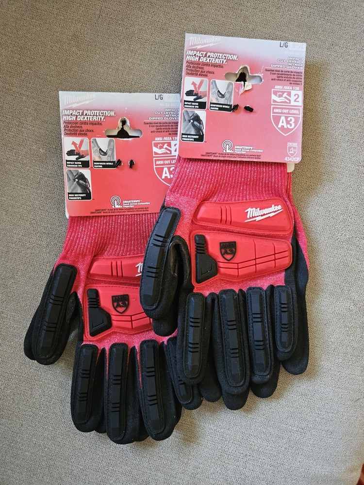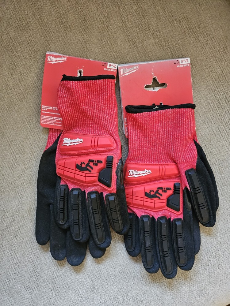 2 Pairs of Milwaukee Nitrile A3 Cut Nitrile Dipped Gloves 48-22-8972- 9"Large, NEW with Factory Tagged Label These Milwaukee work gloves are a top-quality choice for anyone in need of durable and reliable hand protection. Made with nitrile coating material, these gloves are both comfortable and functional, providing excellent grip and protection for your hands. With a manufacturer warranty available by contacting the manufacturer, these gloves come in a vibrant red and black color scheme and are size Large. The A3 cut design makes them resistant to punctures and abrasions, making them perfect for use in a variety of settings. Don't miss out on these new tagged gloves from Milwaukee - order now!