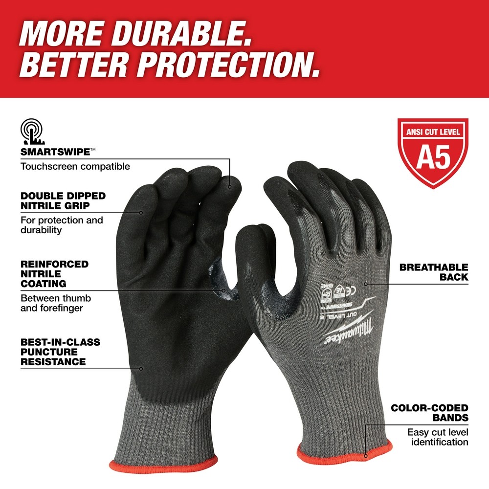 Free Shipping on this item Model MILW 48-22-8954 Milwaukee 48-22-8954 Cut Level 5 Double Nitrile Dipped Gloves, Nylon/HPPE, XXL Fast Free Shipping 30 Day Return Policy Full Factory Warranty Product Details FEATURES: • ANSI 5 • Double dipped nitrile grip for best in class protection and durability • Best in class puncture rating for resistance to sharp materials • High dexterity design when handling small objects • Nylon & HPPE liner material • Double dipped nitrile with sandy texture finish • TDM cut rating E • Abrasion rating 4 • Tear rating 4 • Puncture rating 4 • Breathable glove design • Ideal use for sheet metal, ducting, and glass handling applications SPECIFICATIONS: • Length: 10.5" • Height: 0.25" • Width: 6.5" Milwaukee Tool’s cut resistant dipped gloves are designed to provide ultimate durability, all–day comfort, and best in class dexterity for handling small objects. These gloves feature ANSI and EN cut level V protection to help prevent injuries from sharp objects on the jobsite. Additionally, Milwaukee gloves utilize a double dipped nitrile grip to provide best in cla Why Shop With Us? SHOP WITH CONFIDENCE Competitive pricing and manufacturer warranty on the products we sell FAST FREE SHIPPING Most orders ship within one business day via Fedex ground. WORLD CLASS CUSTOMER SERVICE Our support agents are here to assist you, Monday through Friday. 30 DAY RETURN POLICY We want you to be satisfied with your order, and accept returns up to 30 days after purchase. Shipping All orders ship within 24-48 hours of placement, Monday through Friday, with the exception of national holidays. Orders placed after 12pm PST Friday or over the weekend are typically shipped the following Monday. All shipments are processed and fulfilled from our facility in Las Vegas, Nevada. Please note: We cannot ship to PO boxes or APO addresses at this time. Shipping is available to the 48 contiguous US states only (international shipping unavailable). We do not ship to Alaska, Hawaii, or Puerto Rico. Returns We will gladly accept returns up to 30 days after you receive your order. The buyer is responsible for return shipping unless the item is defective, damaged, or materially different from what was ordered. Photo evidence of damages may be required. If the return arrives to our facility with significant wear and signs of use, a Restocking Fee may apply. Customer satisfaction is always our #1 goal – if you are at all dissatisfied with your order, feel free to contact us with any questions or concerns.