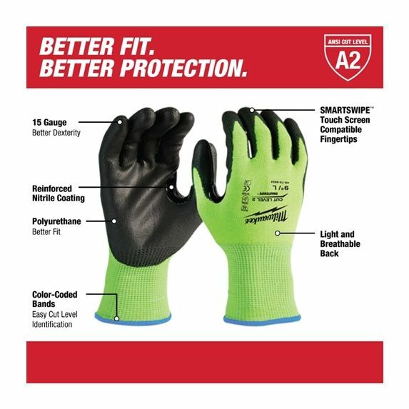 SIZE: XL 10" Milwaukee Tools cut resistant dipped gloves are designed to provide ultimate durability, all day comfort and best in class dexterity for handling small objects. These gloves feature ANSI and EN cut level V protection to help prevent injuries from sharp objects on the job site. Additionally, Milwaukee gloves utilize a double dipped nitrile grip to provide best in class protection from puncture and a dual layer for added durability. SMARTSWIPE fingertips and palms provide full access to touchscreen devices without removing the gloves and also feature high dexterity fingertips to maximize control when handling small objects. Size: large. Color: Hi-Vis Yellow. Gender: unisex. Age Group: adult. If you have any questions please feel free and let us know. We offer combined shipping on orders with multiple items from our inventory. Be sure to choose the same delivery service for all items in your cart from our store. . Multiple shipping options available. We ship daily. We offer combined shipping when multiple items are purchased together for great savings. . . . .Combined shipping availableCombined shipping available Combined shipping available in most cases.