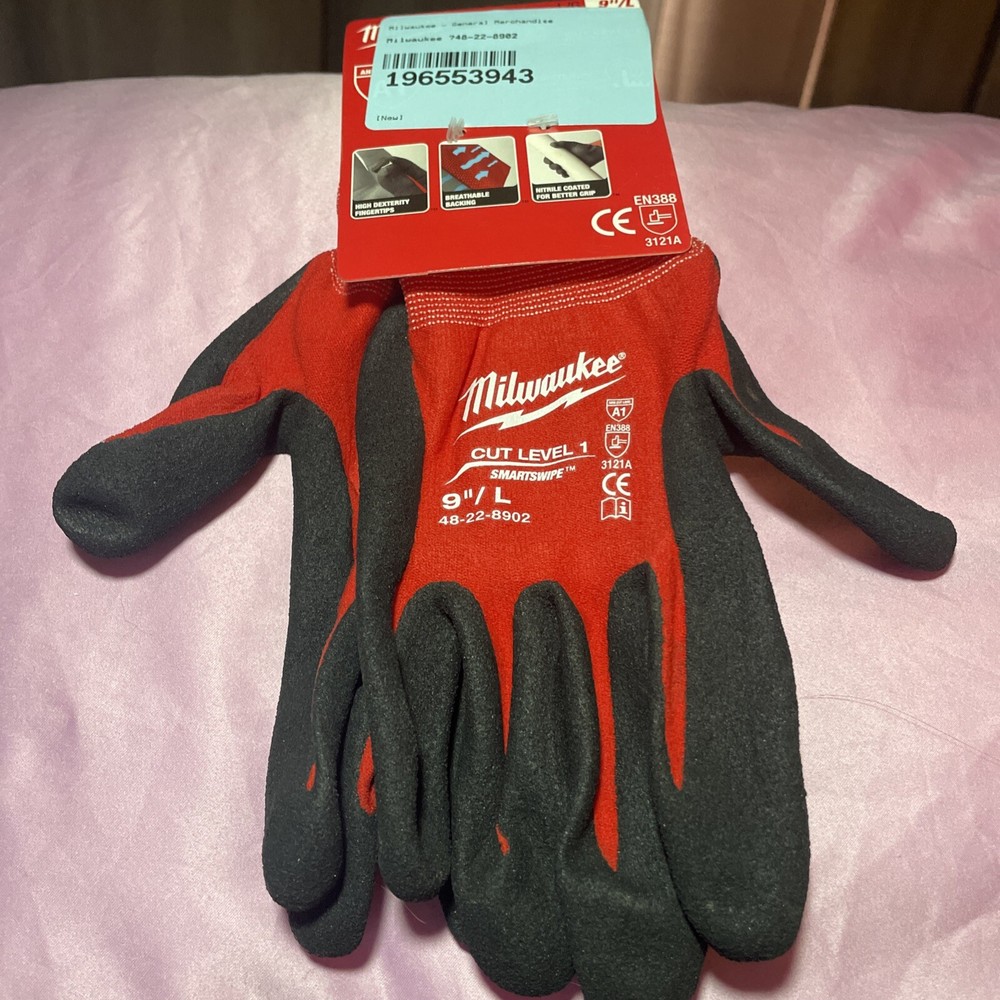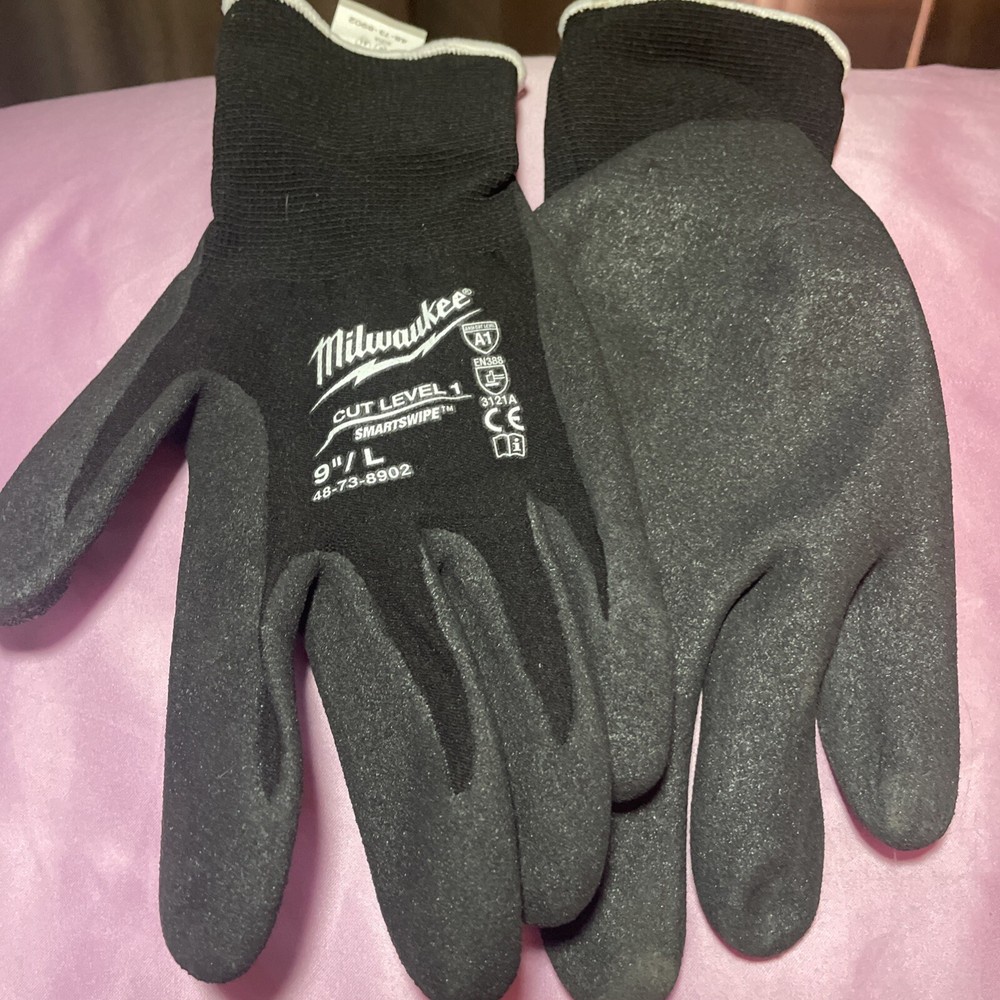 Milwaukee Cut Level 1 Dipped Gloves in Size L 9" and one size Medium are made of Nitrile Rubber for protection. The gloves are brand new.