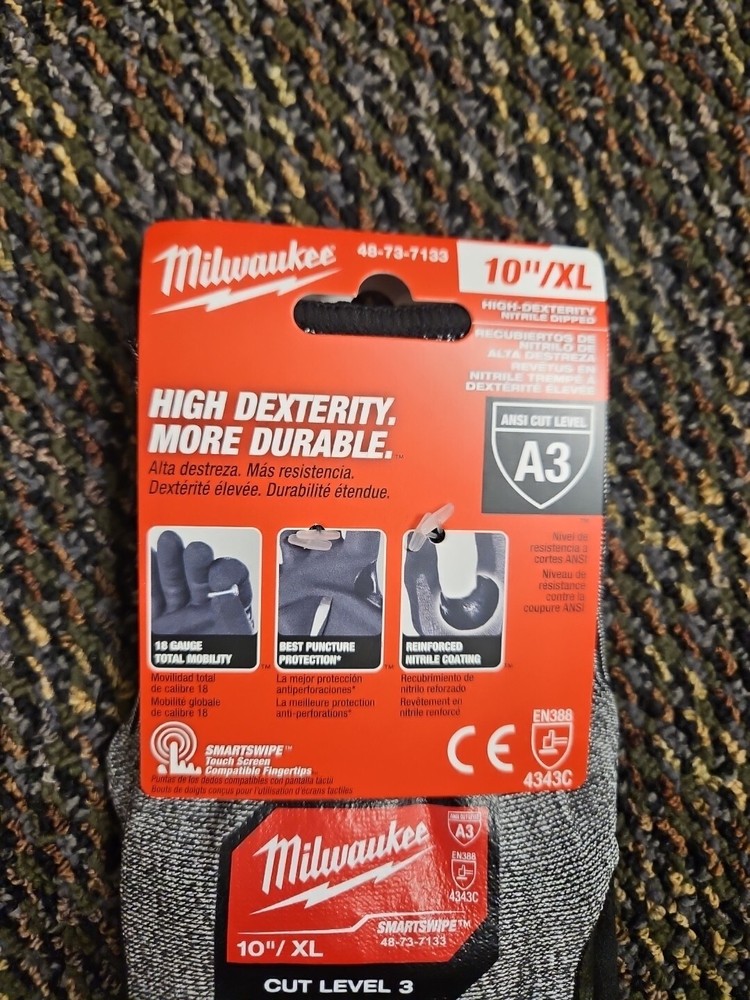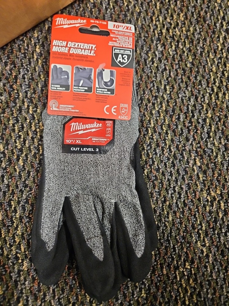 The MILWAUKEE® Cut Level 3 Nitrile Dipped Gloves are designed to be more durable and provide better protection. These gloves feature a reinforced nitrile coating between the thumb and index finger for added durability in high wear areas and are constructed with a 15-gauge knit for better dexterity when handling small objects. Additionally, these gloves have nitrile Comfort Web Grip for better grip and durability. SMARTSWIPE™ fingertips & palms provide full access to touchscreen devices without removing the gloves. MILWAUKEE® Nitrile Dipped Gloves feature a color-coded wrist band and back of hand logo for easy cut level identification.