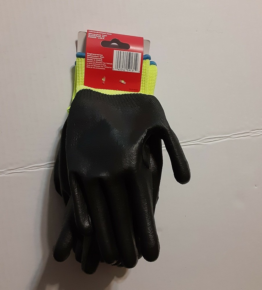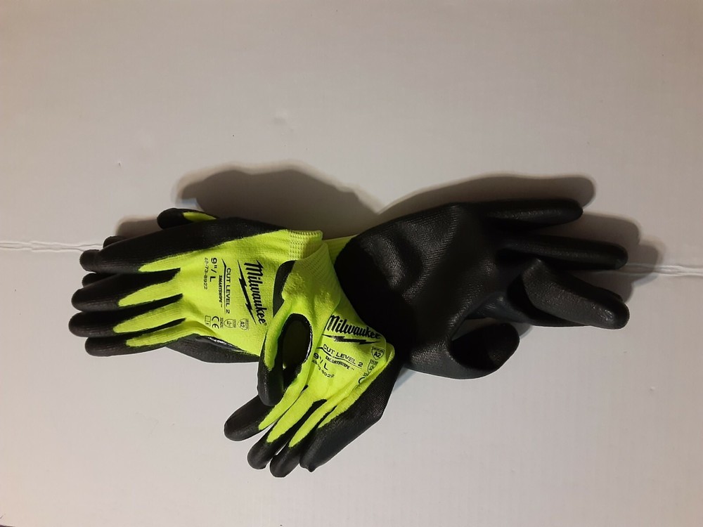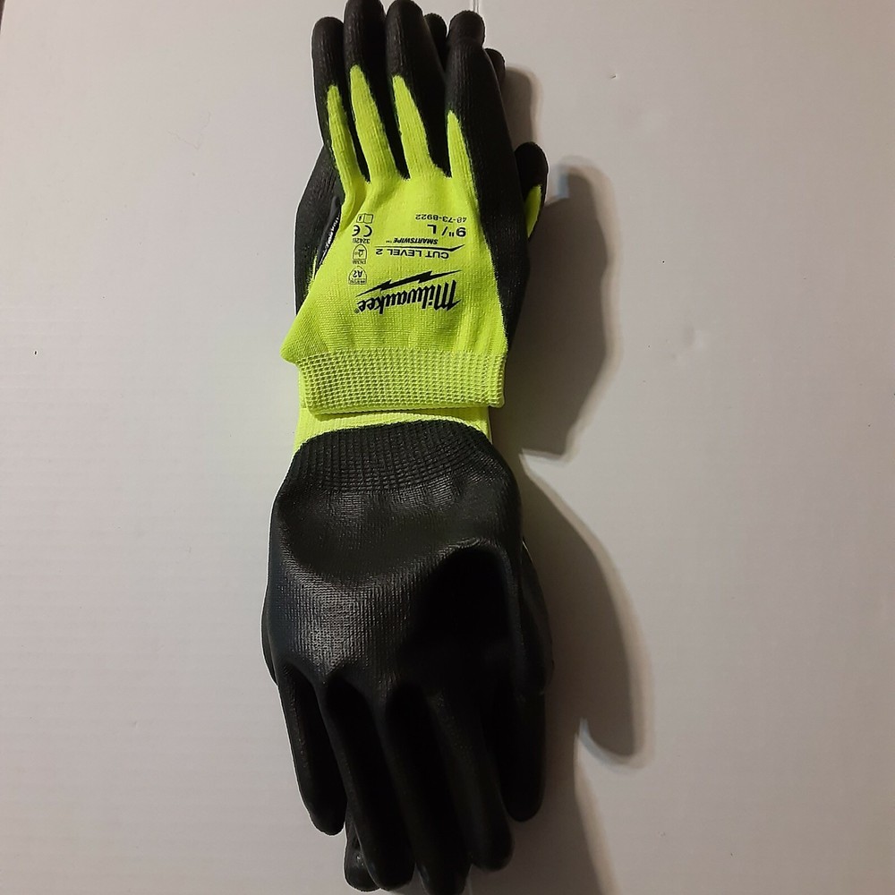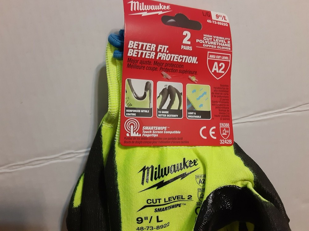 0060 This bundle of Milwaukee high-visibility cut 2 resistant gloves is perfect for any job site. The gloves are made with a polyurethane coating for added durability and grip. They come in a size large and with two pairs, making them a great value. The gloves are cut-resistant, helping to protect your hands while you work. They are brand new and have not been used before. The gloves are perfect for those who work in construction, manufacturing, or any other industry that requires hand protection. They are made with high-quality materials and are designed to last. 0060 Bundle of Two (2) Pairs of Gloves Smartswipe Touch Screen Compatible Fingertips Reinforced Nitrile Coating 15 Gauge Better Dexterity Light & Breathable ANSI Cut Level A2 9" size Large