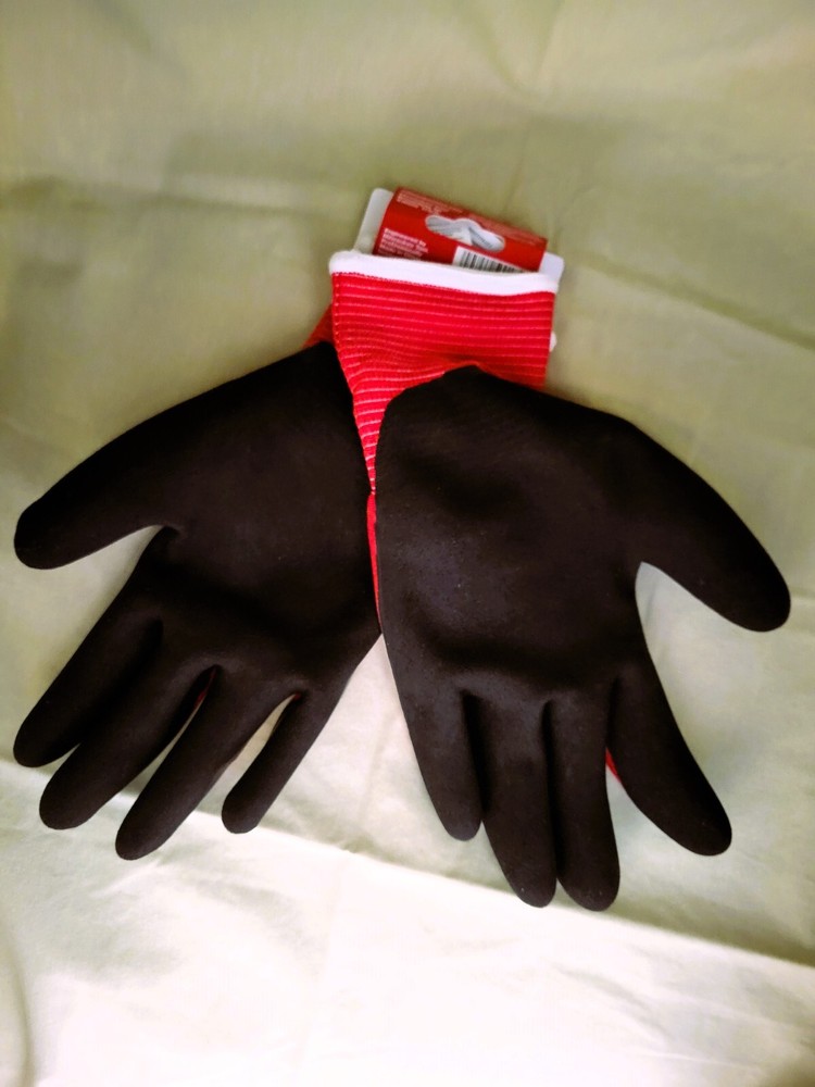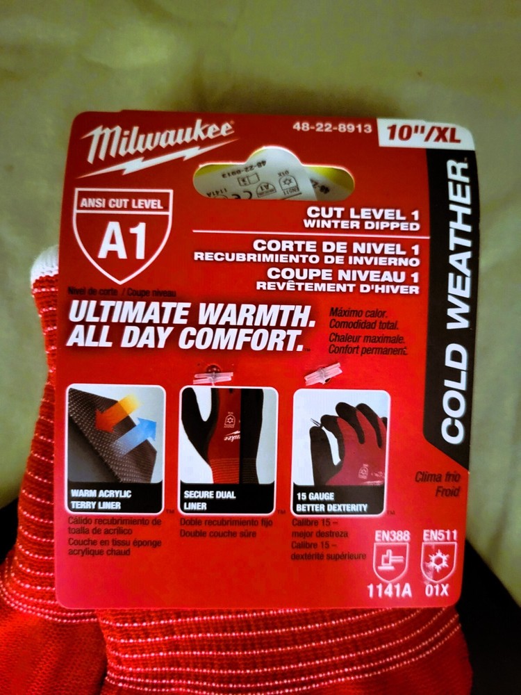 The Milwaukee extra-large ANSI Cut Level 1 Winter Insulated work gloves are designed to provide ultimate warmth, all day comfort and best in class dexterity for handling small objects. The insulated winter work gloves utilize a warm acrylic terry liner to maintain warmth in the coldest outdoor conditions. The gloves have a secure dual thermal liner to comfortably keep users' hands warm without the liner separating after extended use on the job site. These gloves feature a 15-Gauge nylon outer liner resulting in high dexterity fingertips and breathability. The cut resistant work gloves are ideal for material handling, general purpose and remodeling applications. Milwaukee Tool's gloves are constructed of 1/2 double-dipped latex palm micro finish for water resistance to provide best in class grip performance in the coldest temperatures. ANSI 1; EN 511: 01X; EN 388: 1141A 1/2 double dipped latex micro finish for water resistance and warmth Sandy latex finish for grip performance 10-Gauge inner liner for warmth 15-Gauge outer liner for dexterity Breathable and comfortable glove design Ideal use for material handling and general purpose remodeling applications Sold as-is only.