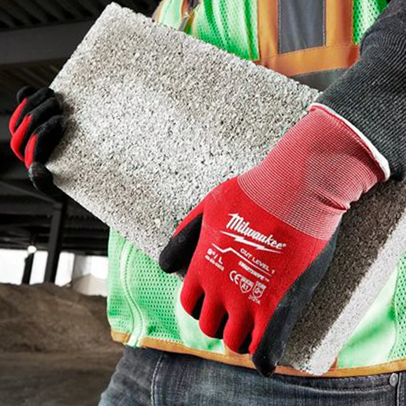 Milwaukee Tool’s dipped gloves are designed to provide ultimate durability, all–day comfort, and best in class dexterity for handling small objects. SMARTSWIPE™ index fingertips provide full access to touchscreen devices without removing the gloves and the textured nitrile palm provides best in class grip performance. The gloves are made of a nylon and lycra blend to provide all day comfort and wick away moisture and also feature high dexterity fingertips to maximize control when handling small objects.Performance / Protection Rating Test Method Scale Rating Abrasion EN388 1-4 3 Cut EN388 1-5 1 Tear EN388 1-4 2 Puncture EN388 1-4 1 TDM Cut ISO 13997 A-F A ANSI Cut ASTM F2992 A1-A9 A1