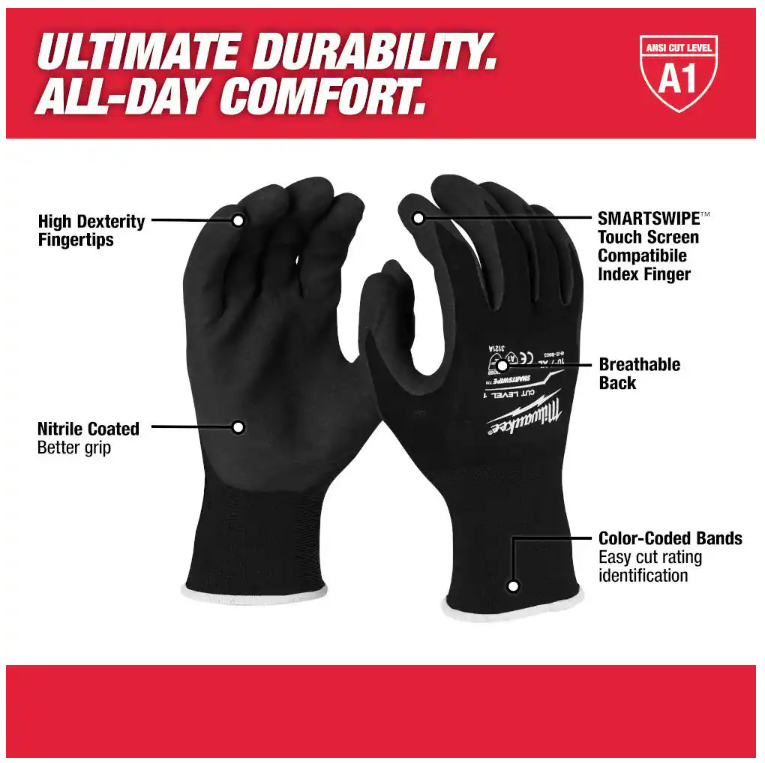 Upgrade your work gloves with these Milwaukee XL Black Nitrile Level 1 Cut Resistant Dipped Work Gloves. Made of high-quality nitrile rubber, these gloves are designed to provide maximum protection against cuts and punctures. The gloves are dipped in a special solution to enhance their durability and resistance to wear and tear. These gloves are perfect for a wide range of applications, including construction, landscaping, and facility maintenance. With a comfortable fit and excellent grip, they are ideal for handling tools and equipment. The gloves are available in a pack of 4 pairs, making them a great value for your money. Don't settle for inferior gloves - choose the Milwaukee XL Black Nitrile Level 1 Cut Resistant Dipped Work Gloves for ultimate protection.