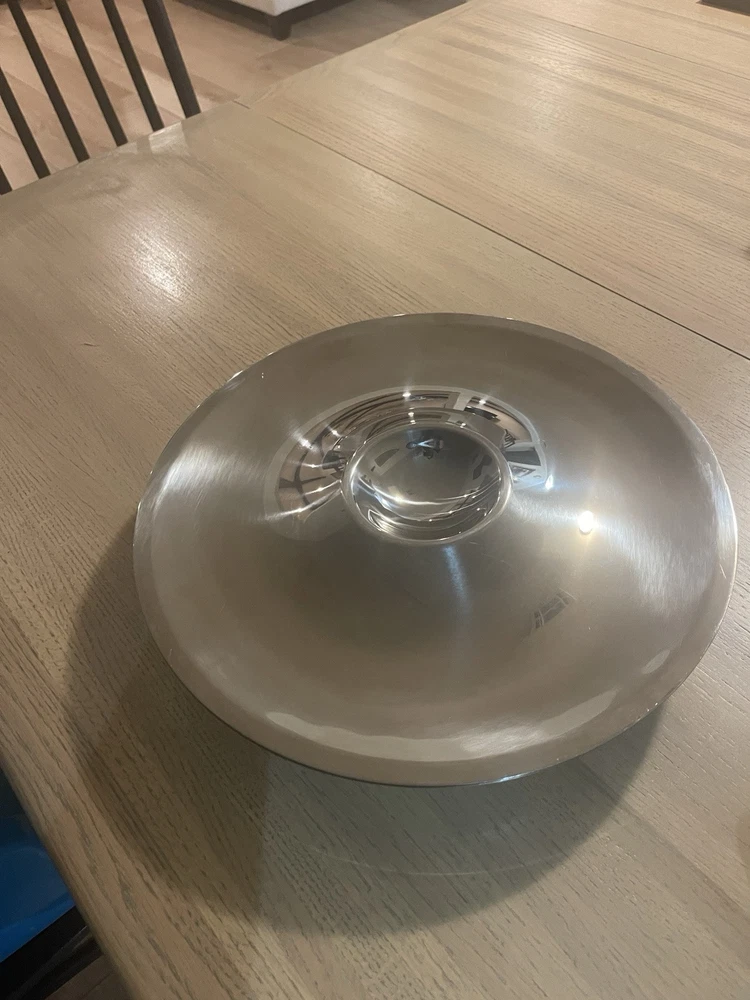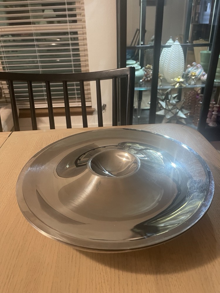 Modernist FRONTGATE 14.5" Stainless Steel Round Insulated Chip &Dip Serving Tray Frontgate super chill appetizer, shrimp cocktail serving tray. Double walled stainless with gel-based inner layer to be placed in freezer before use - keeps contents cold for your event. Two piece with drip bowl base. Size 14.5" diameter x 2.5" tall... heavy weight 8.75 lbs. ***Very Good pre-owned condition, likely used for one. Minimal arms of wear. With keep party food cold. Can be used in multiple ways and stylish for any season.