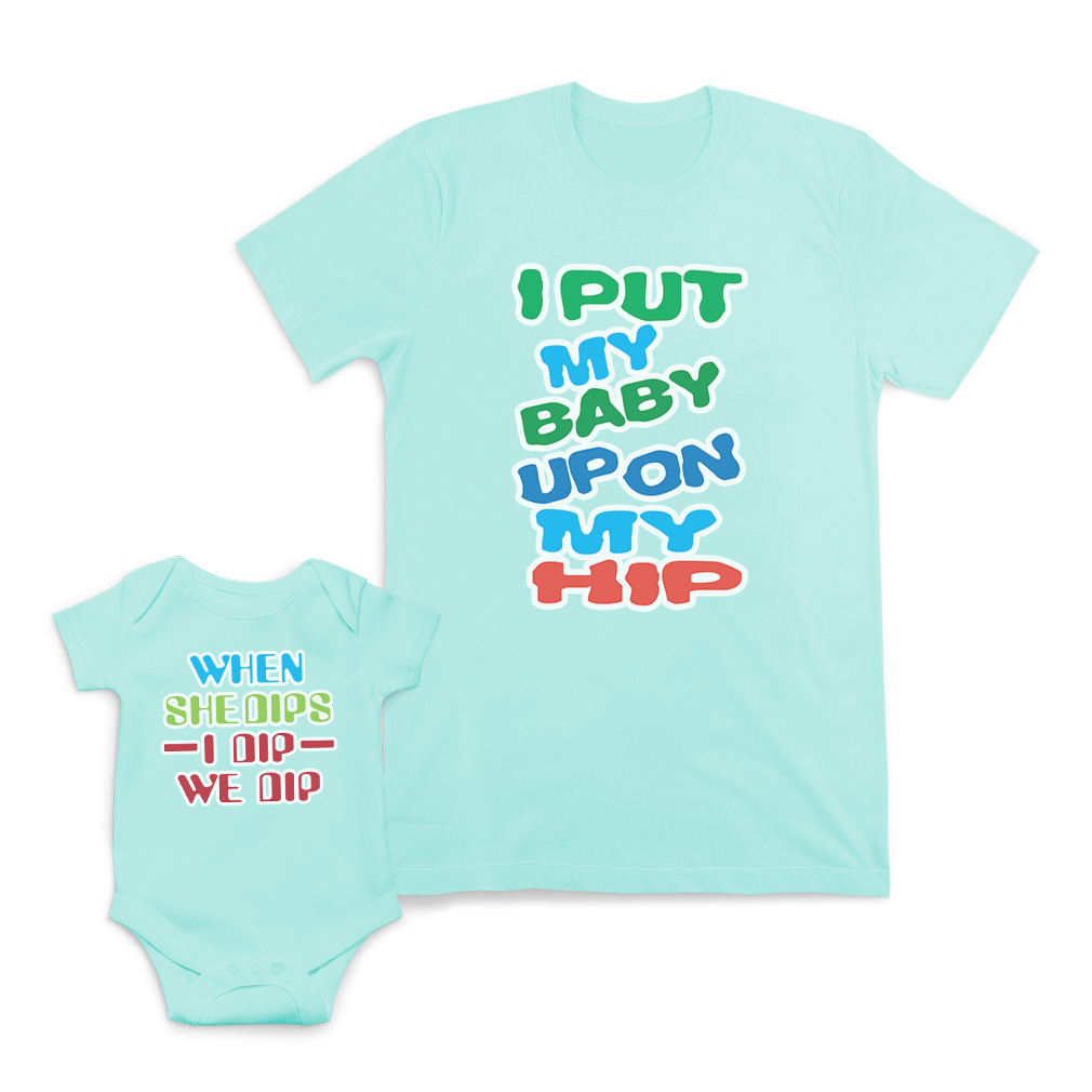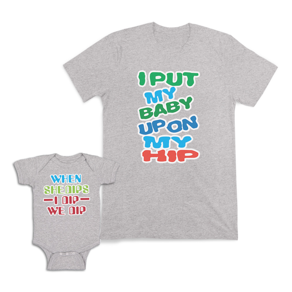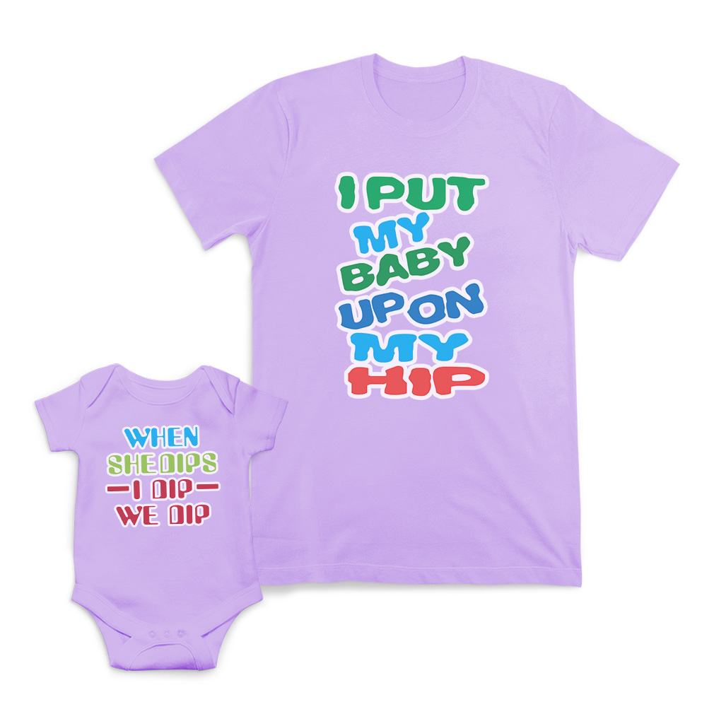 Mommy and Me Outfits Baby Bodysuit & T-shirt Matching Outfits for Son & Daughter Get the camera ready for this unique and fun moment in family! Get your mother daughter matching put outfits or mother son matching my baby outfits for an awesome day full of joy and memory. Take funny pictures and share them instantly with your friend and family. The design's text reads: i put my baby up on my hip when she dips i dip we dip GREAT BABY SHOWER GIFTS IDEA: Unforgettable and cute, our mommy and me matching hip outfits are the perfect mother’s day gift or for any occasions like birthdays, anniversaries, Christmas, Father’s Day. This she dips two piece outfits is composed of a high quality cotton adult T-shirt for mommy, and a soft and comfy baby bodysuits for baby! The I dip bodysuit is unisex and will fit either boy or girls. There are 4 colors to choose from so we are sure that you can find the perfect one. Our designs are professionally printed with state-of-the-art equipment guaranteed not to fade or crack, with no bleed through inside to protect baby's soft skin! Our prints will continue to feel and look great even after many washes for many years. We have more than 15 years of experience in the printing industry to offer you stunning detail and rich lifelike colors. All prints are carefully made in our lab in Tampa, Florida. THE CUTEST TWINNING SET FOR MOMMY AND BABY! ** Premium Quality: Share your awesome style with your little one with our set of breathable 100% cotton unisex T-shirt and baby bodysuit for maximum comfort and ultra-soft material for their delicate skin. ** Mommy and Me Matching Outfits: Imagine how cute you will be on pictures with your loved one wearing this shirt and baby bodysuit matching clothes set. Simply choose the right size for the baby and the mom! ** Perfect for Boys & Girls: Most of our mini me matching outfits are gender neutral. It can be a mom and daughter matching outfits or a mom and son matching outfits as well. ** Easy Everyday Care: Easy to wash and to re-use. Our mommy and me clothes set can be washed by hand or simply throw our matching outfits family into your washer and dryer and call it a day! ** Unique Designs & Fun Graphics: We put a lot of thought and time in the design of our matching outfits family. We are proud to offer you the best selection of body twinning, as well as the best variety of Family and Friends and Mom graphic designs