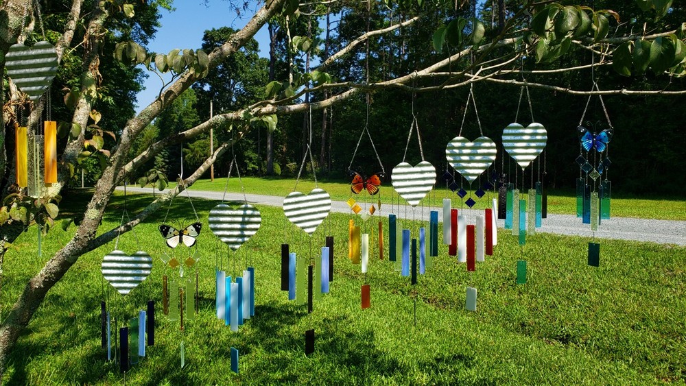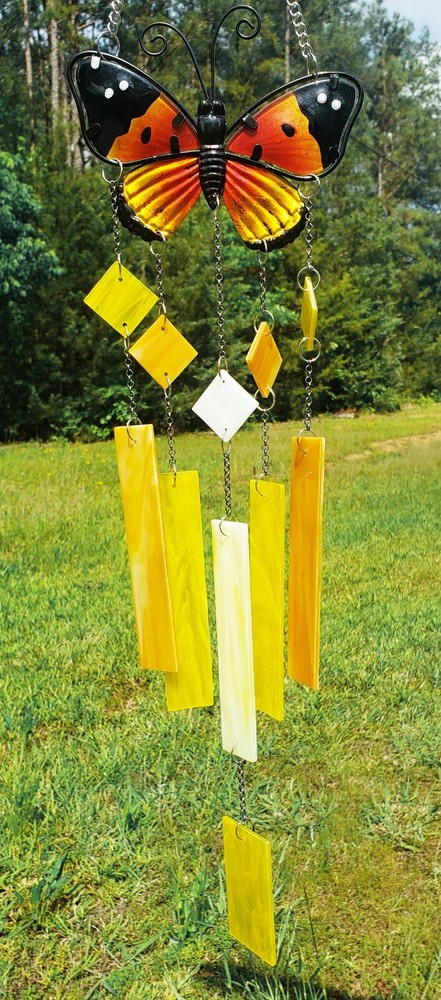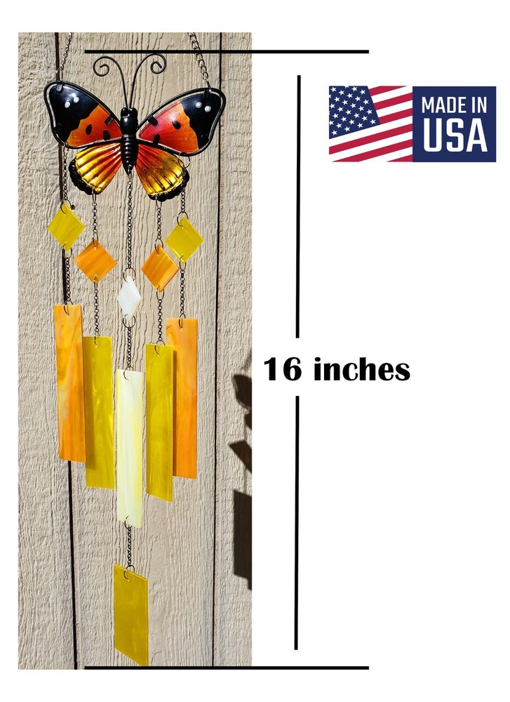 The Glass Monarch Butterfly Wind Chime captures the beauty of nature with its 11 pieces of stained glass and stunning butterfly with two glass wings. Enjoy the calming melody as the wind carries the chime. Windchimes should sound good but also look great. This wind chime does both. This windchime features a colorful Monarch butterfly. The upper wings are glass. There are five 1" stained glass diamond shaped chimes hanging from the butterfly and five 5" long stained-glass chimes hanging from the diamonds with a blue stained glass paddle hanging from the middle chime. The chimes are connected with chain. The length from the top of the butterfly to the bottom of the stained glass paddle is 16 and a half inches. The glass chimes make a wonderful, gentle sound in the wind and are beautiful to look at on days when the wind is not blowing. Handmade in North Carolina at my art studio. Not a cheap import that will fade or apart in a year.