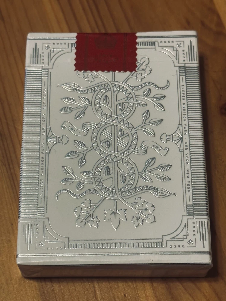 RARE theory11 Playing Cards - Monarchs - Eleven Madison Park Custom Edition. Condition is "Mint". Shipped with USPS Priority Mail. Monarch Eleven Madison Park Edition playing cards were a single-printing limited-edition product not ever sold on theory11.com. These were printed specifically for Eleven Madison Park, a high end restaurant in New York City that was ranked #1 in the world in 2017, and is consistently ranked in the top 10 in the world. This deck is a custom variation based on Silver Monarch playing cards. The EMP Monarchs were printed using the standard theory11 stock and finishes (the same as used on all our custom cards). These were all printed in one single run, and have no known variations. These decks feature a few notable characteristics that make them easily identifiable: - White Paper tuck case with silver foil designs. - 4 leafs on the upper right and lower left branches on the tuck case back (this was from before the change to 5 leafs) - t11 Circle logo and barcode on the bottom flap of the tuck case - Red and gold foil seal with tax-stamp edges (jagged edges) - Black Ink design on white background on the playing card backs - Does not have the newer thin borders - Custom Ace of Spades and 2 custom (identical) Jokers - Other faces standard, with the typical muted theory11 color scheme - Partial custom artwork on the tuck case (EMP leaf logos, "Special Edition", "Made Exclusively for Eleven Madison Park". - Full custom faces, featuring ingredients The EMP Monarchs were commissioned as a part of a unique NYC-themed menu at EMP. The restaurant was tying their menu to various element of NYC culture and history. They wanted to feature the commonly-seen street con 3 Card Monte. Their servers were taught a trick that resulted in the diners selecting ingredients that were used in the next course. Diners were able to take home a deck after the meal. These were not otherwise sold, and as such are extremely rare.