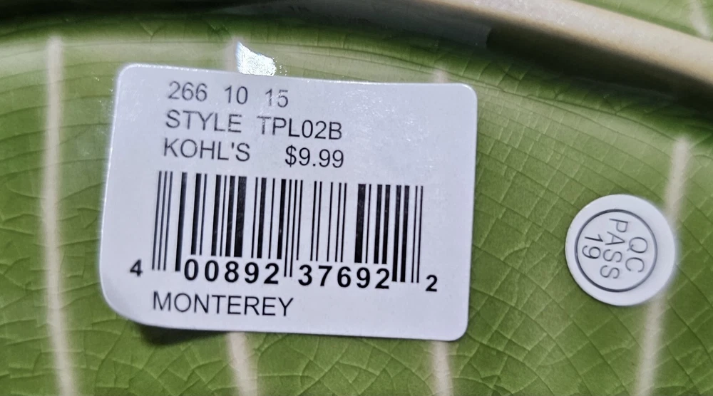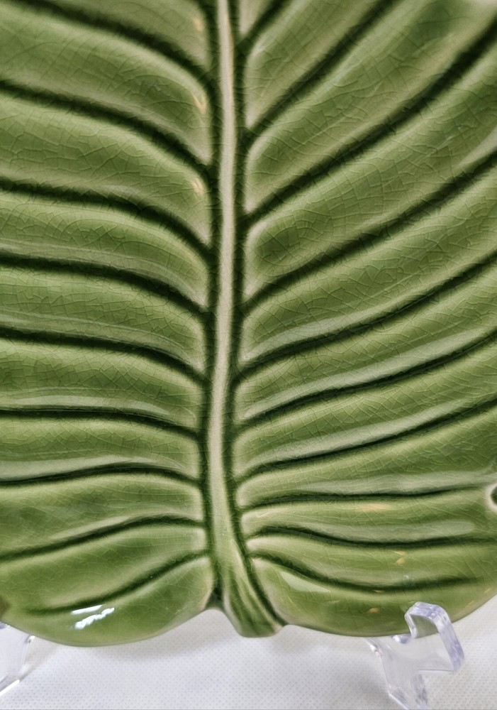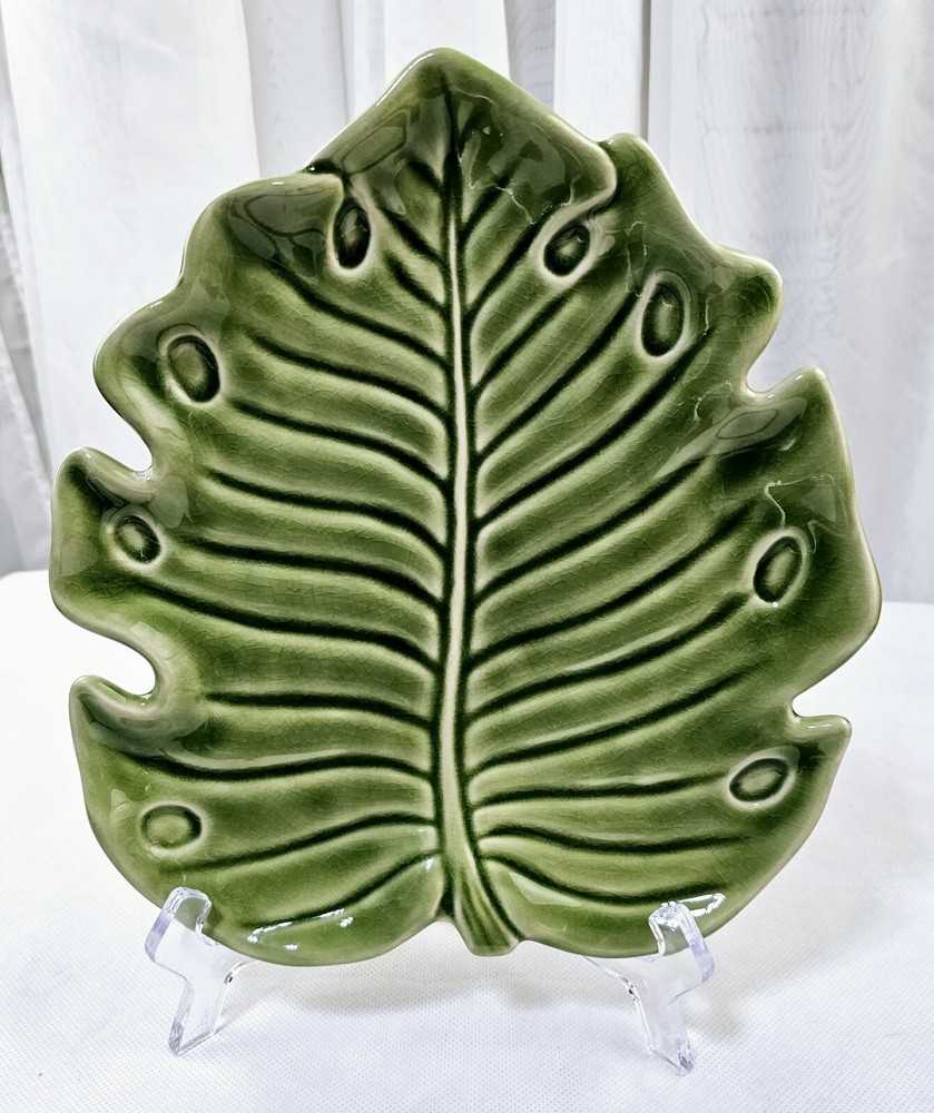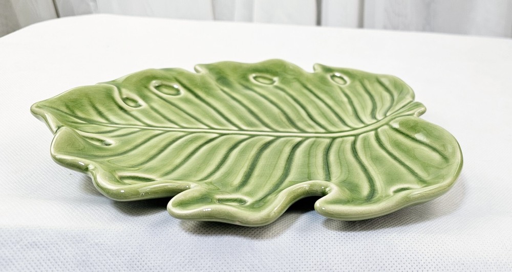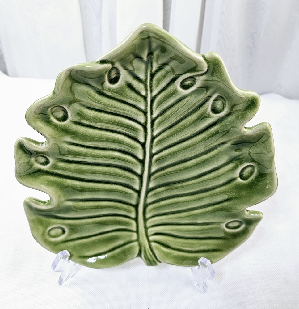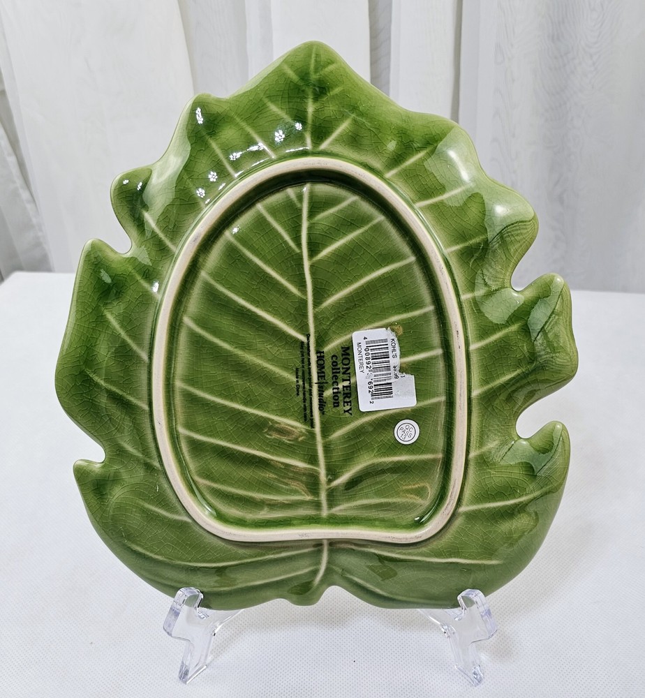 Monterey Collection Home Studio Ceramic Green Leaf-Shaped Plate Measures approximately 10” long x 9.25" wide (at widest point) This plate in the shape of a tropical leaf with crackle glaze. It is dishwasher safe, and microwave and oven proof. It is in excellent pre-owned condition. Please look over the photos and zoom in as they are part of the description. The photographs you see in the listing are of the actual item for sale. I try to describe everything as accurately as possible. If there is a problem with an item, please contact me. Please remember that I am only human and do, on occasion, miss something or make a mistake. Email me any questions! Other Stuff I DO GET MANY OF MY ITEMS FROM GARAGE SALES, ESTATE SALES AND SECOND HAND STORES SO I DON'T HAVE BACKGROUND ON MANY ITEMS. THIS IS FROM A SMOKE FREE HOME BUT I DO HAVE PETS, I DO WASH WHAT CAN BE WASHED TO KEEP THESE CLEAN AND IN BAGS AWAY FROM HAIR AND DANDER. I do not charge a handling fee. I know that shipping rates are high, believe me...I don't like it any more than you do. Thank you for your interest in my item and have a great day!