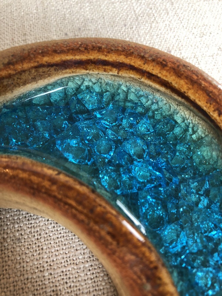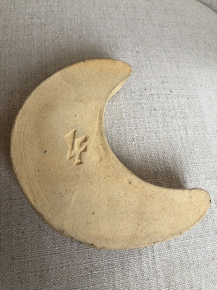 Moon shaped crystalline Studio Pottery Trinket Dish. No chips or cracks. I’m not certain of the type of clay used but I think this is terracotta, although I’m no expert. Great dish to throw you rings/jewelry into at the end of the day. This is 5” long by 1” tall.