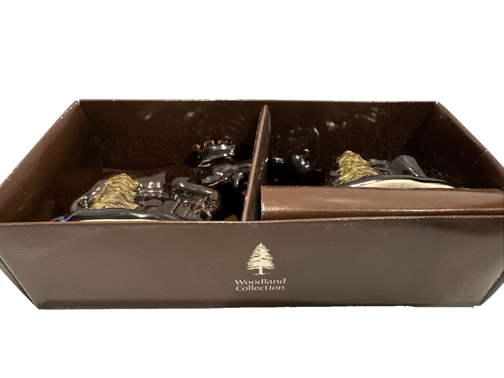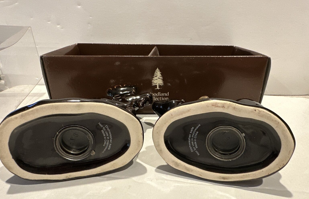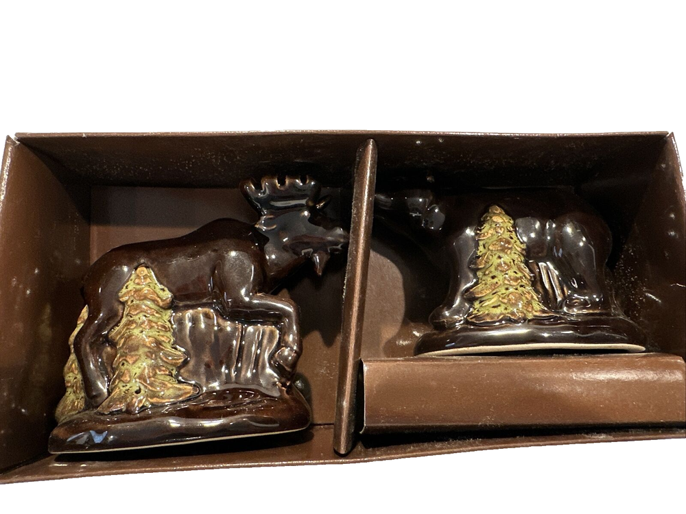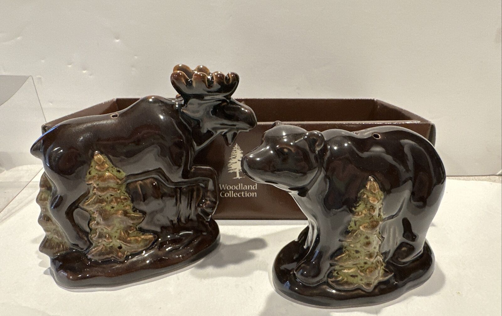 This listing is for MOOSE AND BEAR SALT & PEPPER SHAKERS SET BY HOME STUDIO . BRAND NEW IN PACKAGE No chips or cracks. This set is a brown glazed ceramic. Both have stoppers. Microwave and dishwasher safe. Accented with pine trees. Bear measures 2 3/4" tall x 3 3/4" long x 2" wide. Moose measures 3 1/4" tall x 4" wide x 1 3/4" wide.