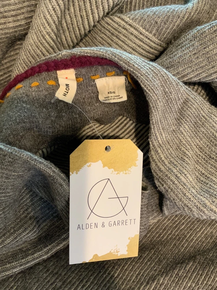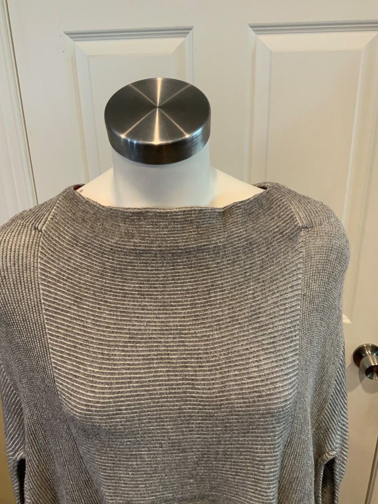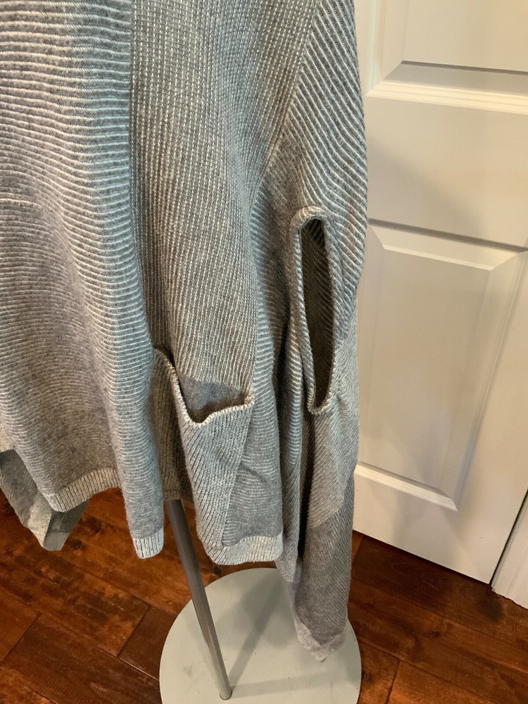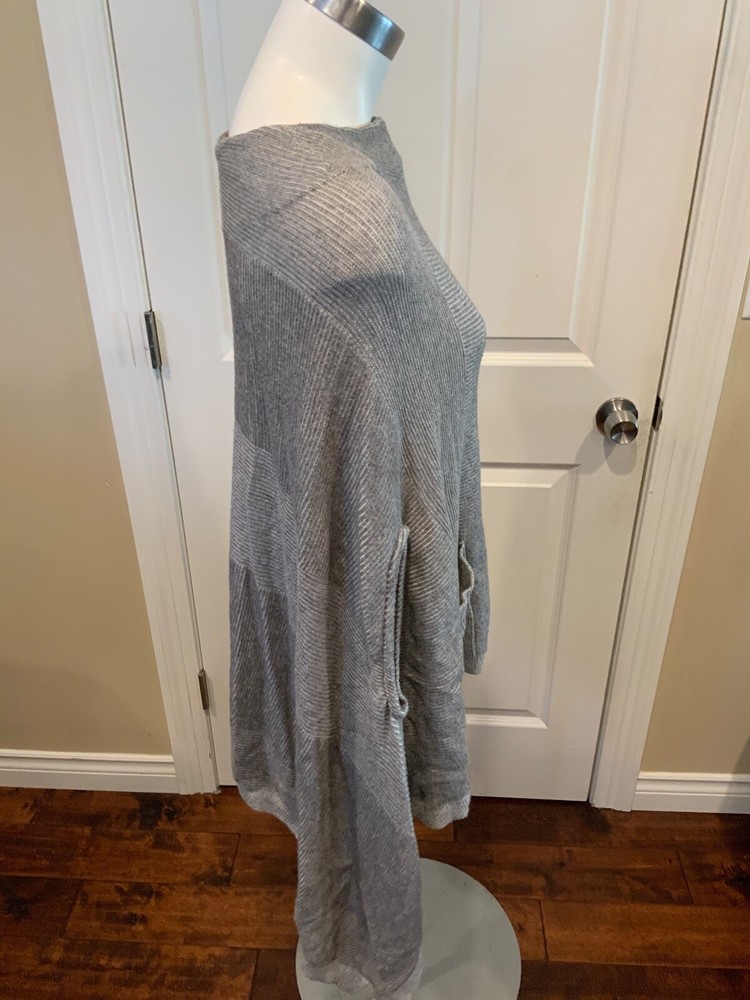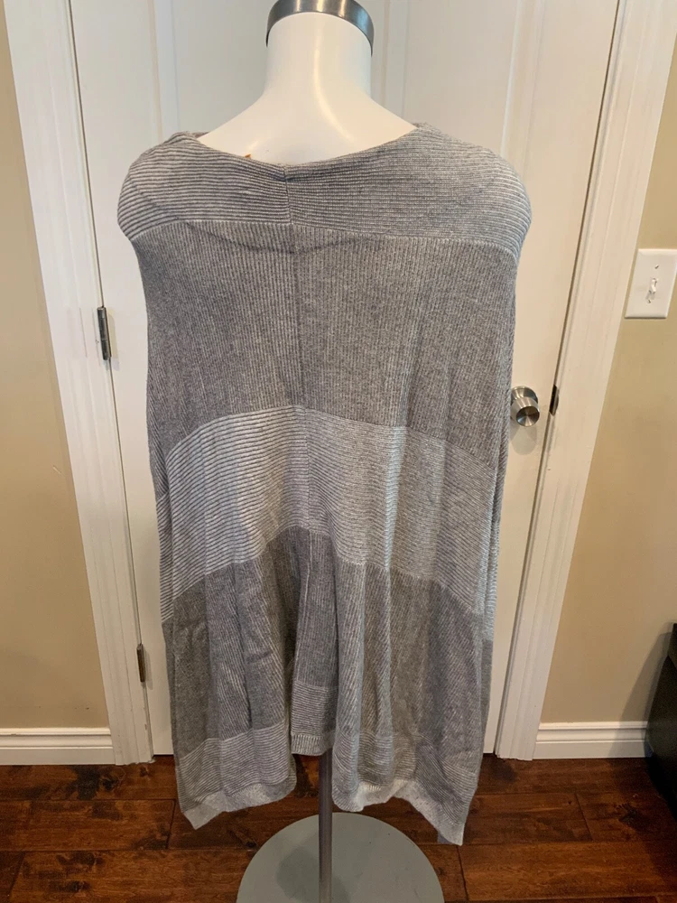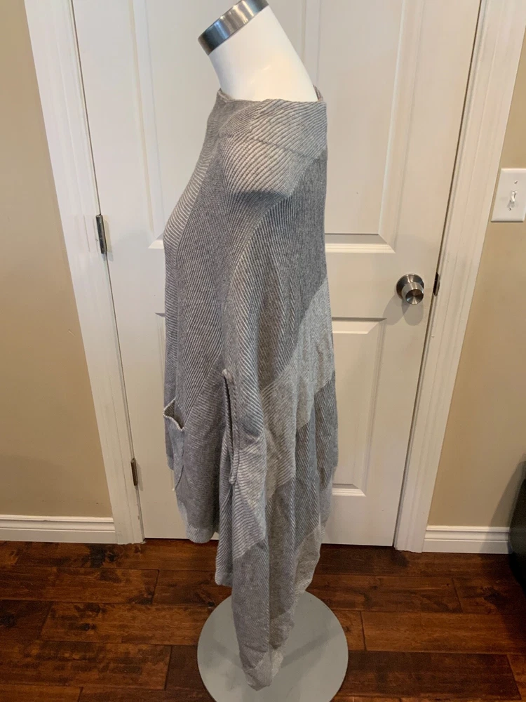 Women's poncho by Moth for Anthropologie “Madison Park" Size: XS/S Chest from just about armholes: 51" Length measured back collar to bottom- 27" *Gray, ribbed, asymmetrical poncho *Sleeveless; Armholes in front *Knit body in gray and white stripes *2 front pockets Please let me know if you have any additional questions and feel free to check out my other listings. I do combine shipping! Thanks! 41216