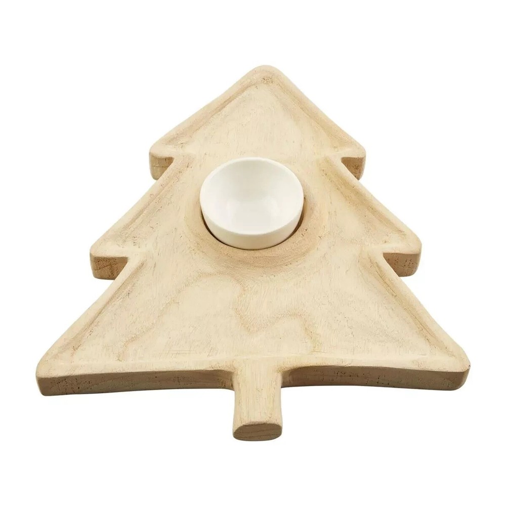 2-piece set. Paulownia wood tree shaped chip server features removable ceramic dip bowl. Measures 14 1/2" x 13" Elevate your holiday gatherings with the Mud Pie Paulownia Wood Christmas Tree Chip n Dip Serving Plate. Crafted from durable wood, this large platter features a festive tree pattern that's sure to be the centerpiece of your table. The rich brown color complements any Christmas decor, making it a versatile addition to your seasonal entertaining essentials.The plate's shape is designed for easy handling and serving, perfect for those busy holiday meals. Whether you're hosting a formal dinner or a casual get-together, this Mud Pie serving plate will serve your appetizers and snacks with a touch of seasonal charm.