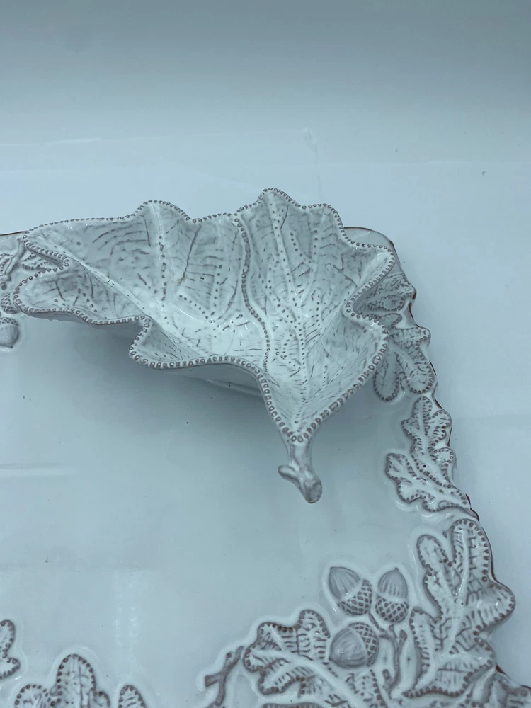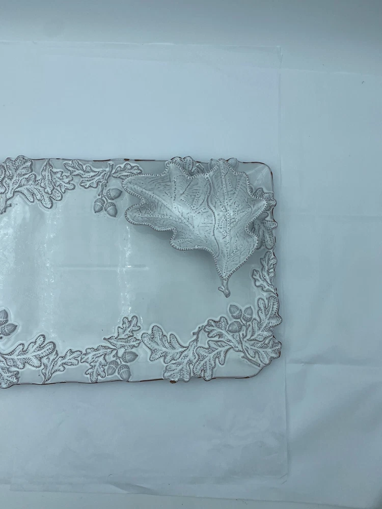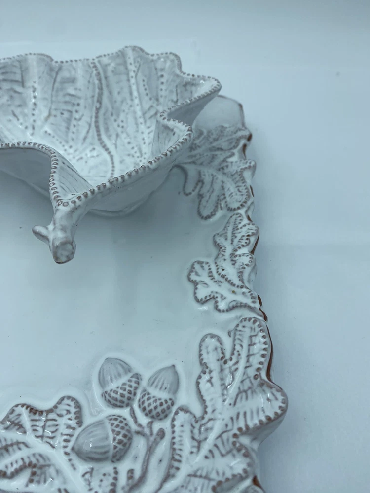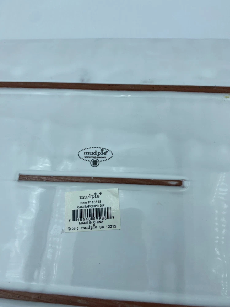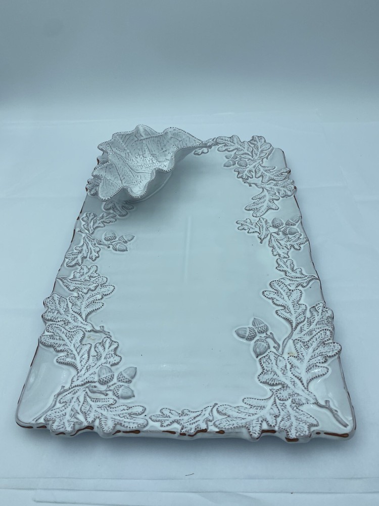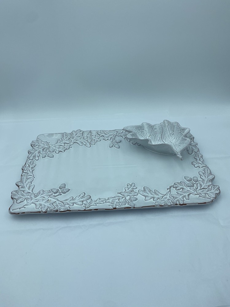 Elevate your entertaining game with this stunning Mud Pie chip and dip platter. Crafted from high-quality stoneware, this large rectangular platter features an embossed oak leaf pattern and a beautiful white glazed finish. The attached chip holder makes it easy to fill and serve, while the tray design adds a touch of farmhouse style to any occasion. 10x16” bowl 6.5” Perfect for all occasions, this chip and dip platter is a must-have for any kitchen or dining room. The easy-to-use design and durable construction make it a practical choice for both everyday use and special events. Add a touch of rustic charm to your entertaining with this Mud Pie platter.