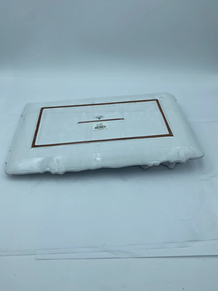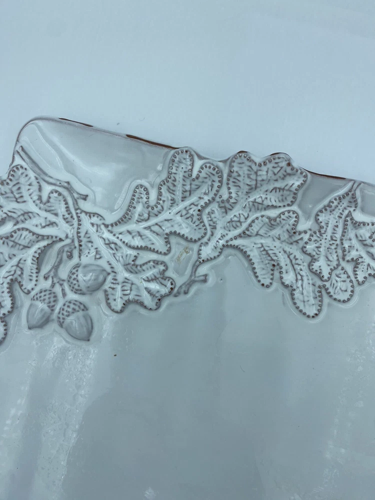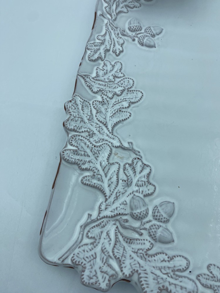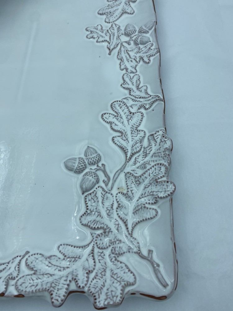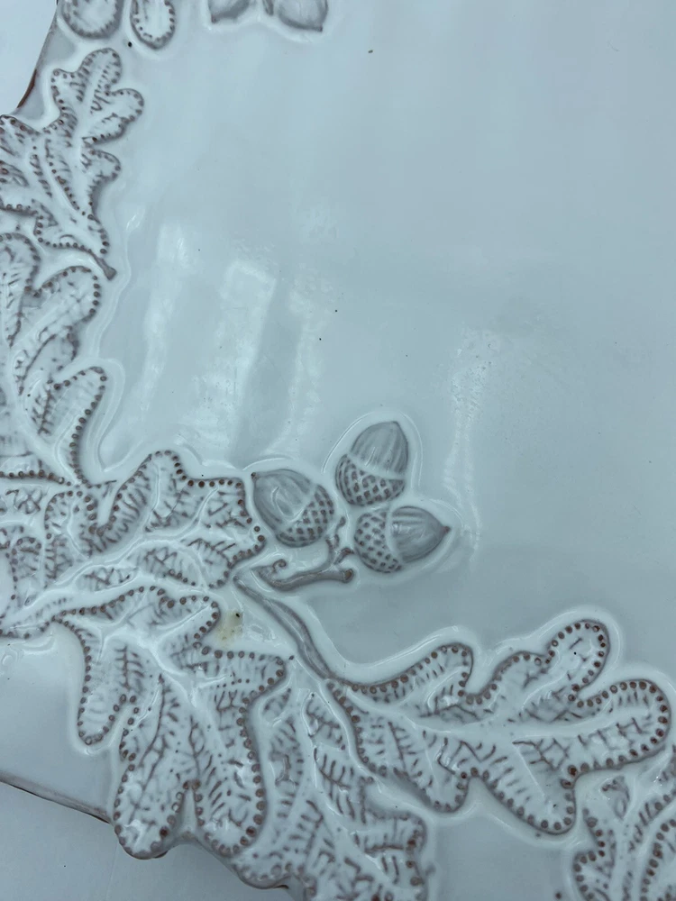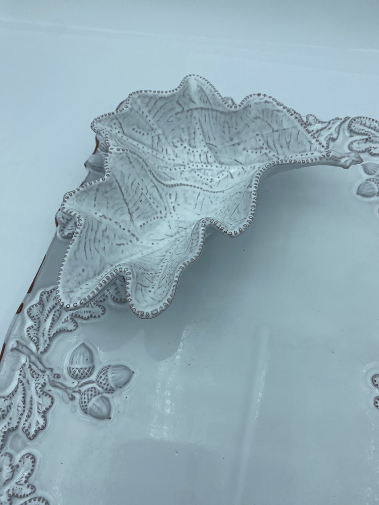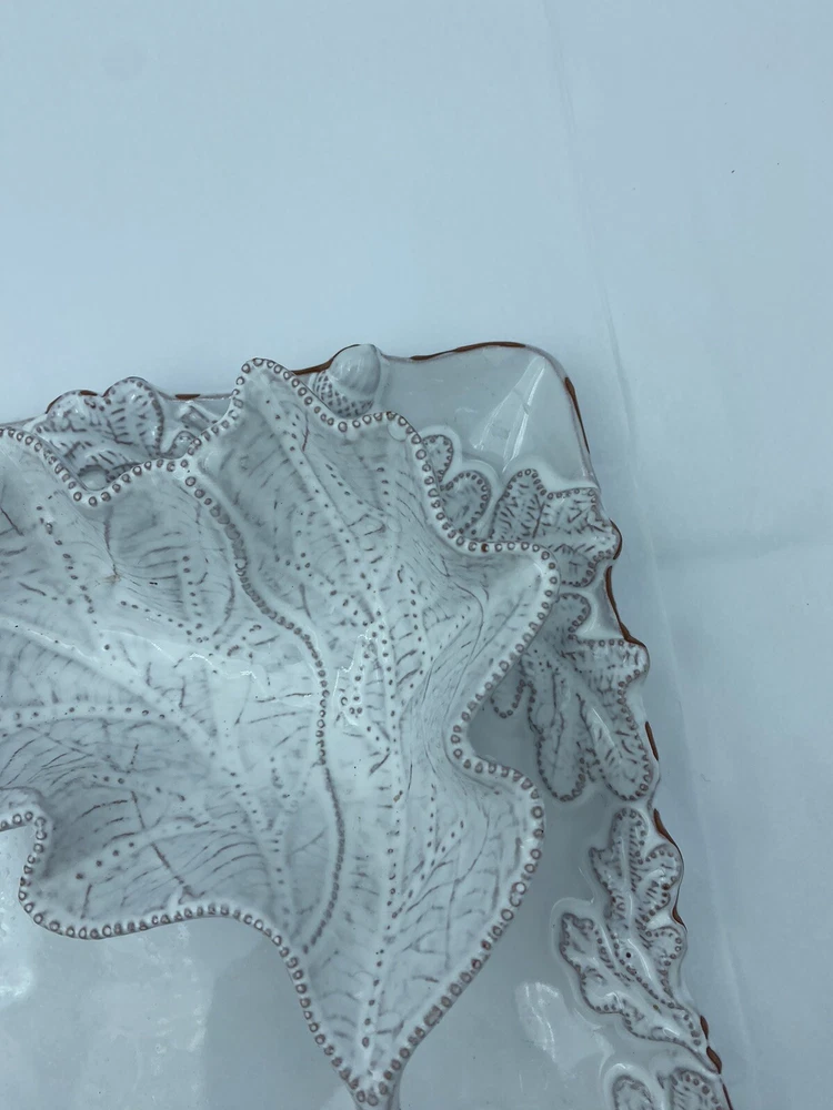 Elevate your entertaining game with this stunning Mud Pie chip and dip platter. Crafted from high-quality stoneware, this large rectangular platter features an embossed oak leaf pattern and a beautiful white glazed finish. The attached chip holder makes it easy to fill and serve, while the tray design adds a touch of farmhouse style to any occasion. 10x16” bowl 6.5” Perfect for all occasions, this chip and dip platter is a must-have for any kitchen or dining room. The easy-to-use design and durable construction make it a practical choice for both everyday use and special events. Add a touch of rustic charm to your entertaining with this Mud Pie platter.