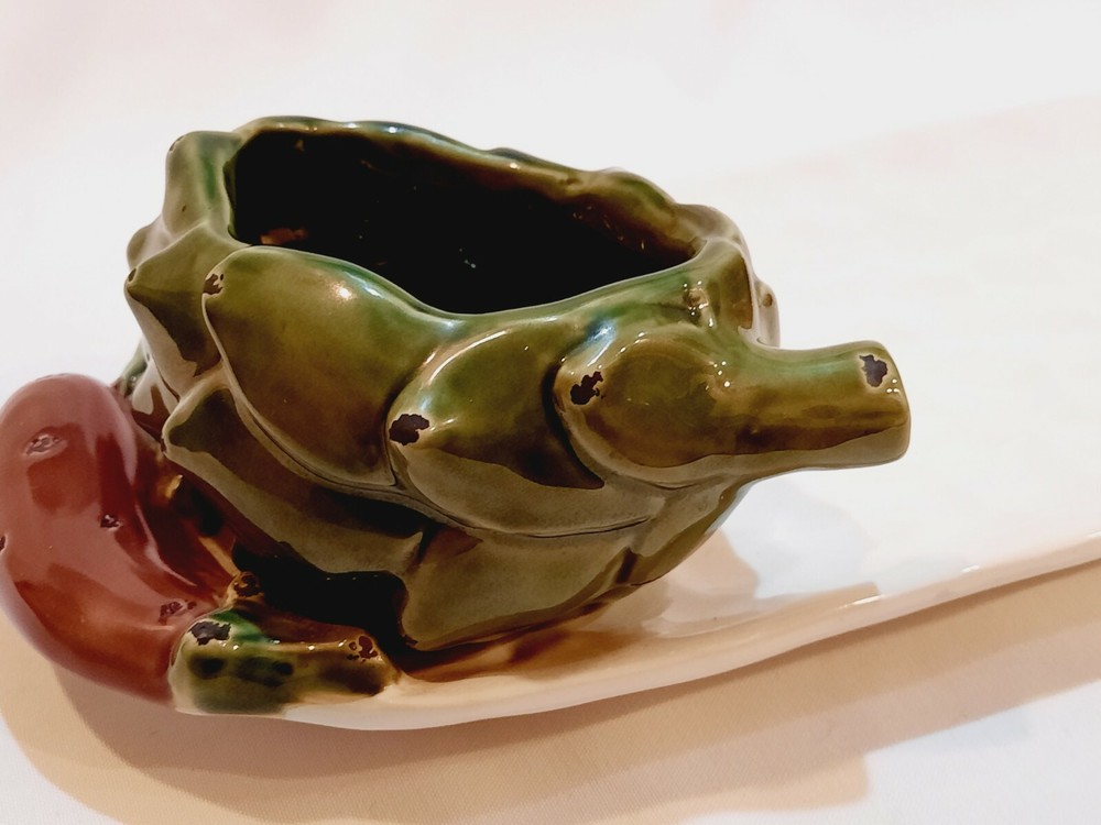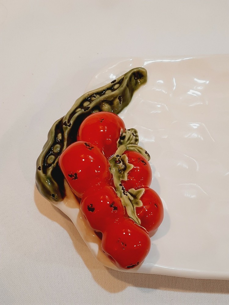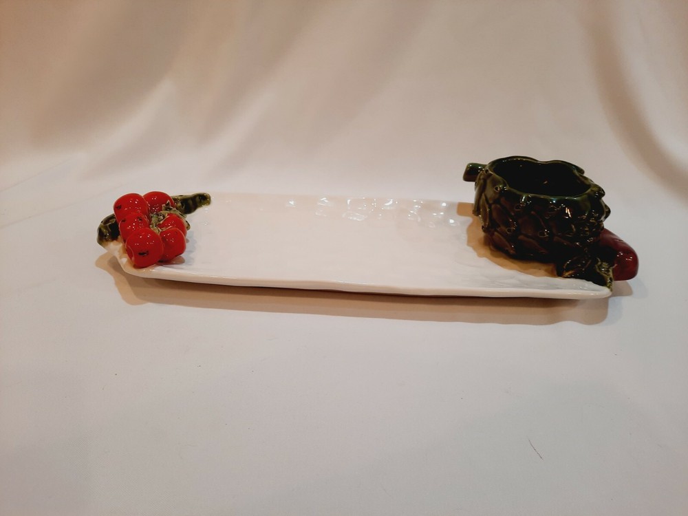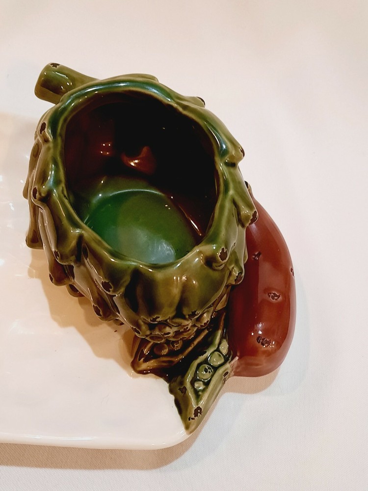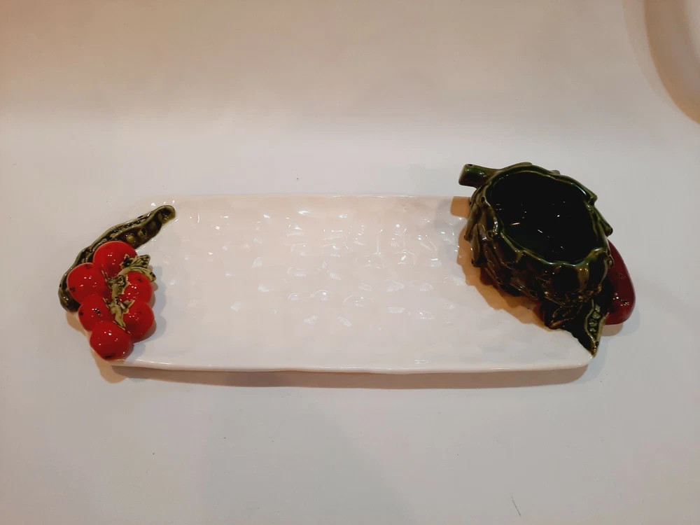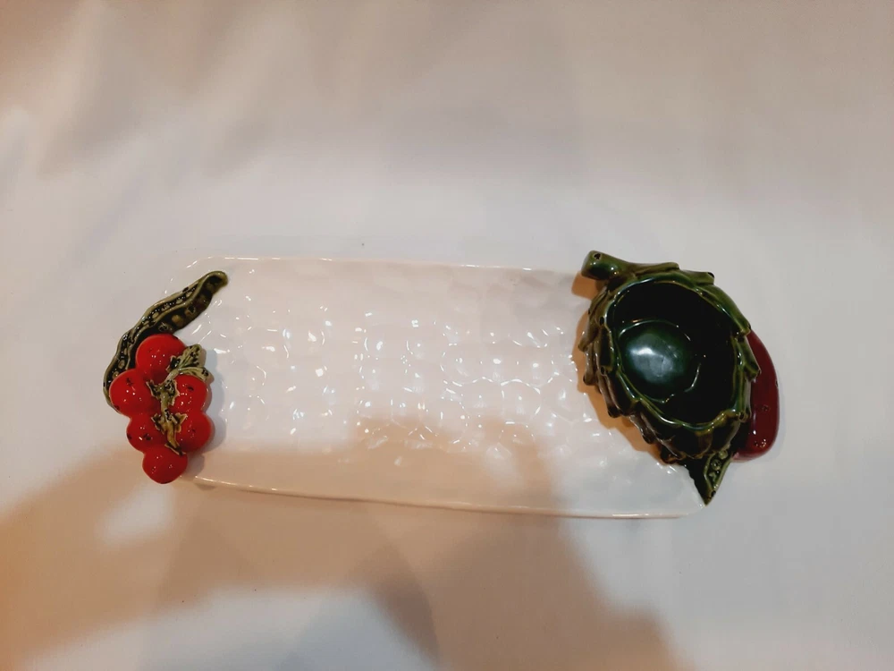 Center of tray has textured honeycomb pattern surrounded by raised 3-D tomato, pea, eggplant and artichoke embellishments. Artichoke if hollow for holding dip. 19 1/2" long x 7 1/2" wide x 3 3/4" high to top edge of artichoke. Used; excellent condition. No chips or cracks. Ships USPS Parcel Ground Select. Buyer Pays Shipping.