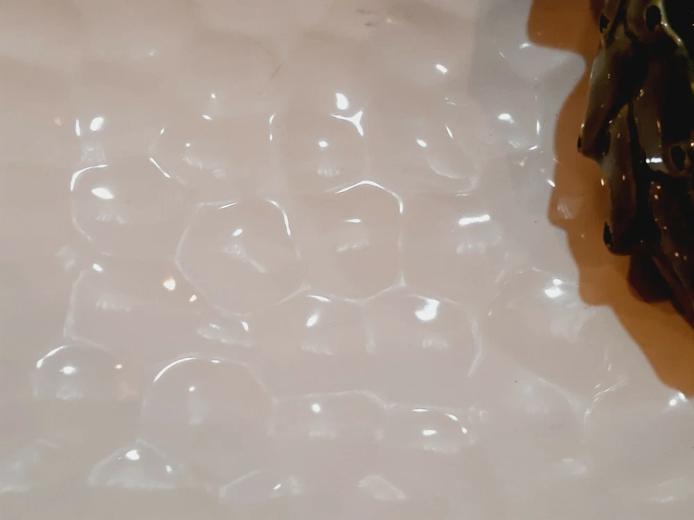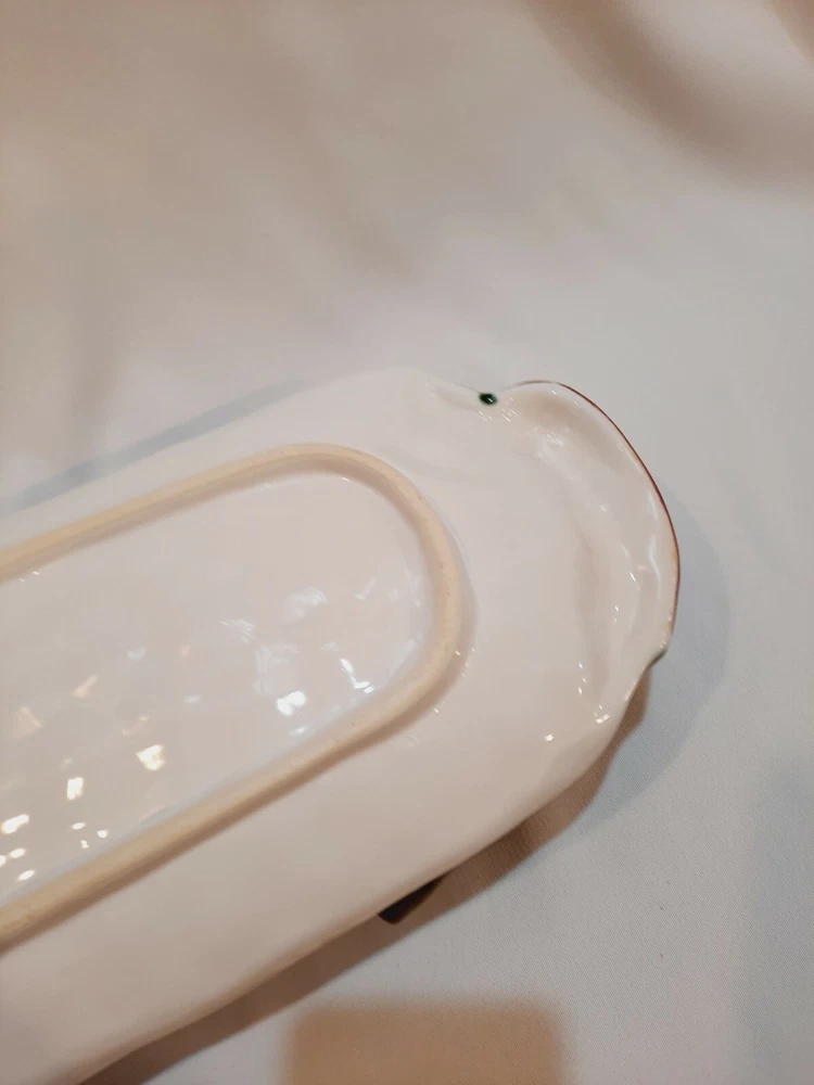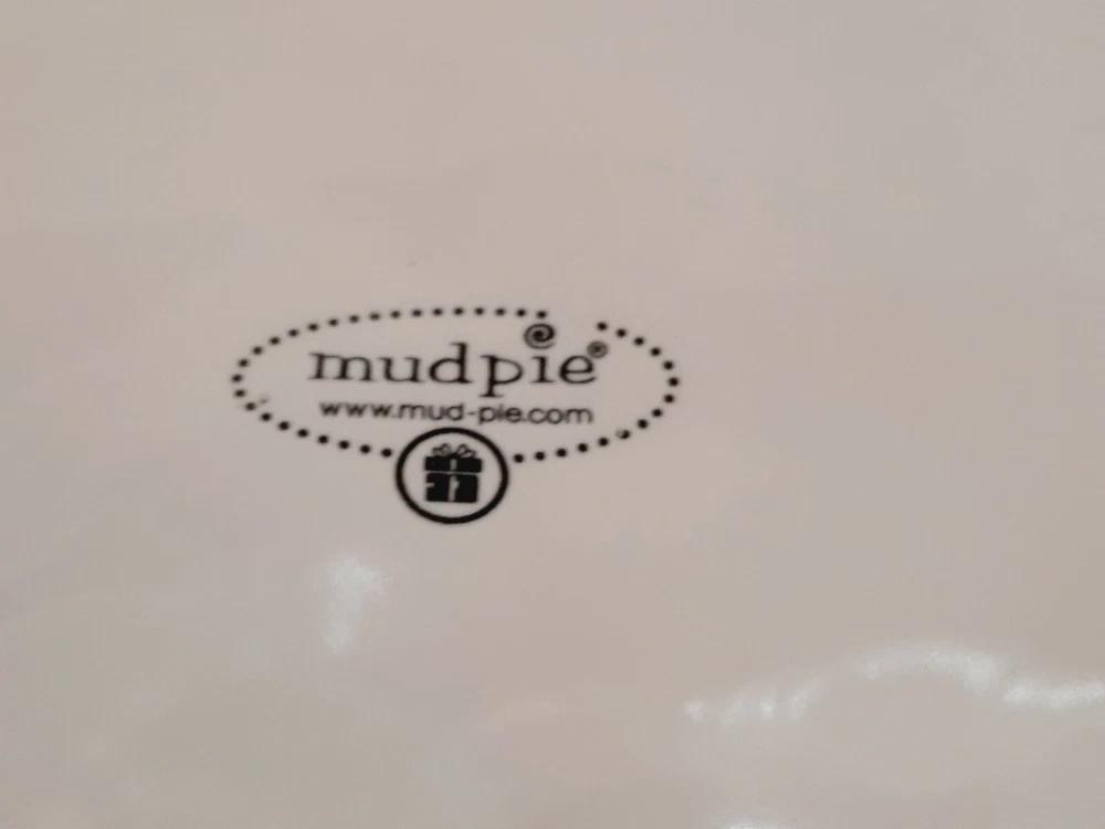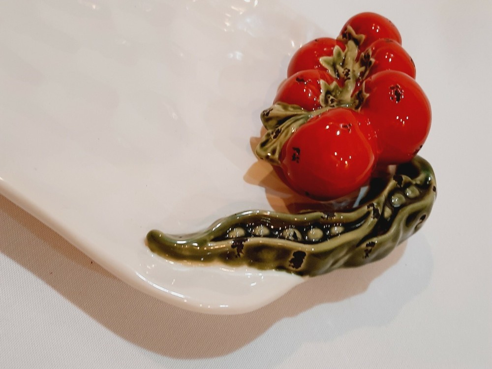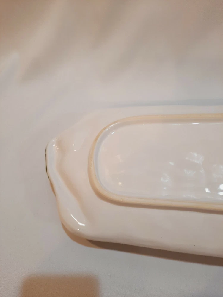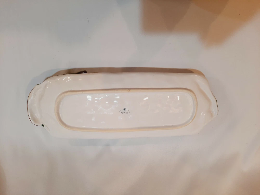 Center of tray has textured honeycomb pattern surrounded by raised 3-D tomato, pea, eggplant and artichoke embellishments. Artichoke if hollow for holding dip. 19 1/2" long x 7 1/2" wide x 3 3/4" high to top edge of artichoke. Used; excellent condition. No chips or cracks. Ships USPS Parcel Ground Select. Buyer Pays Shipping.