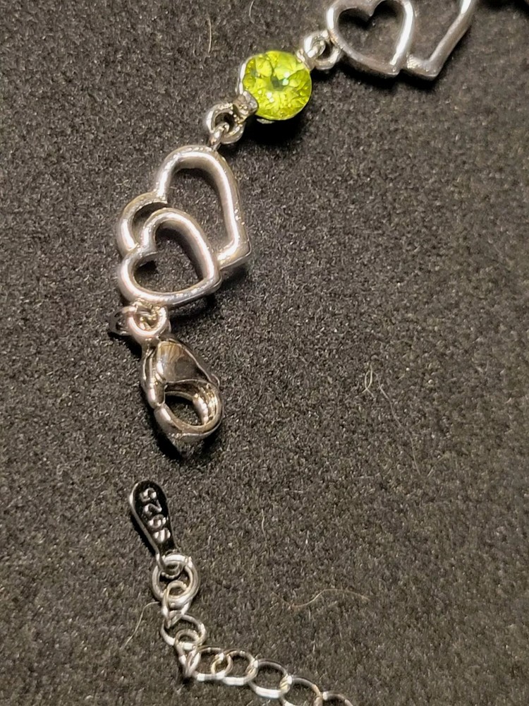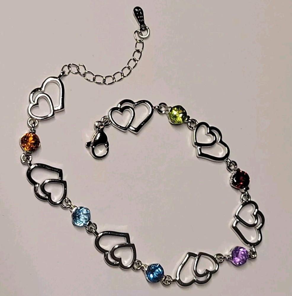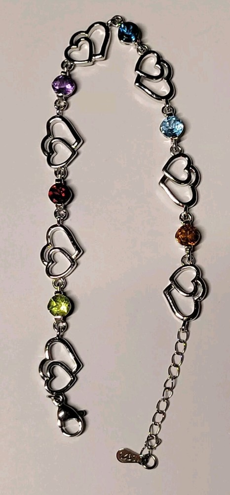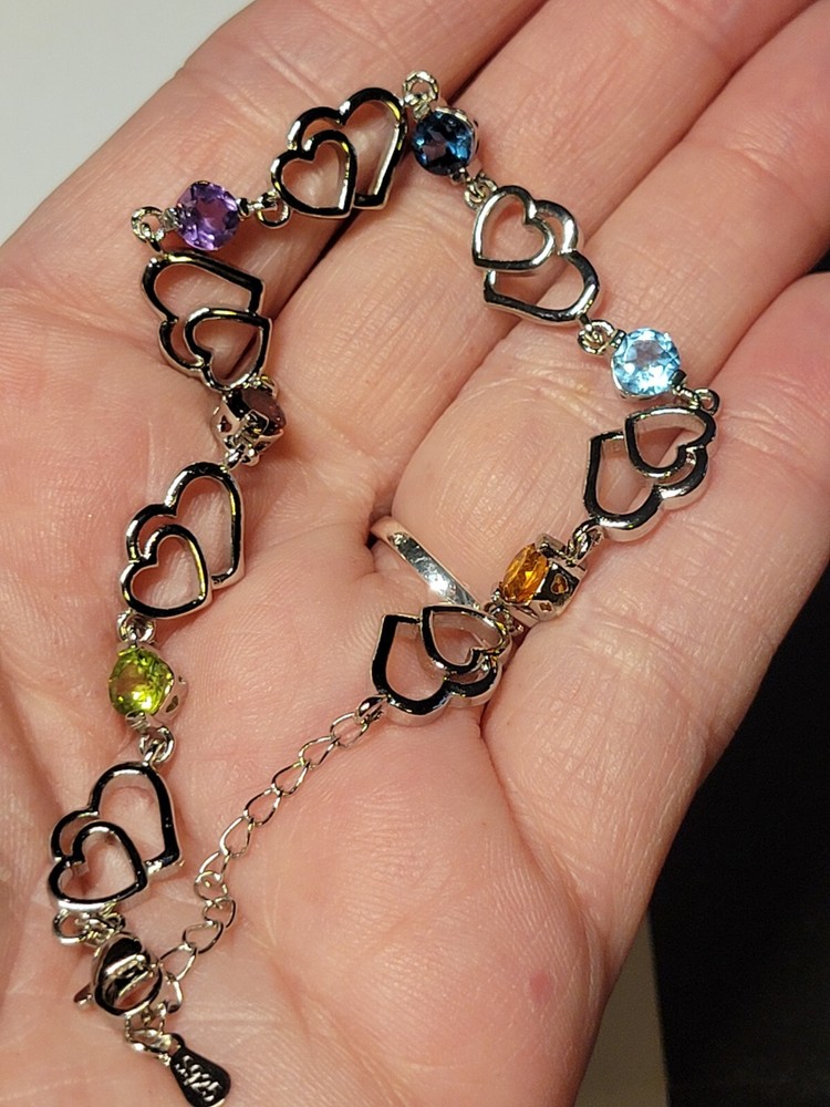This is a handmade 925 sterling silver bracelet featuring a heart-shaped cluster of natural gemstones including blue topaz, garnet, citrine, amethyst, and peridot. The bracelet has a total carat weight of 3.30 and a length of 8.5 inches. The design is in a tennis style with a round shape setting. The piece is crafted by Handmade Studio and is themed around beauty, nature, love, and various symbolic elements.