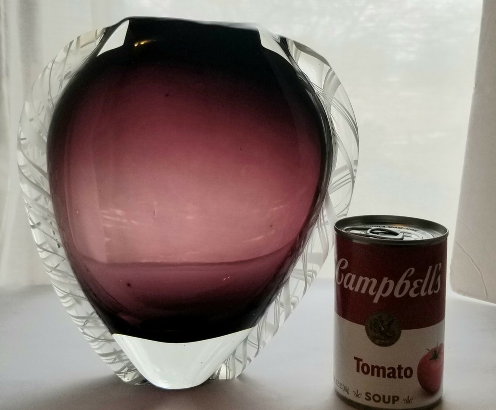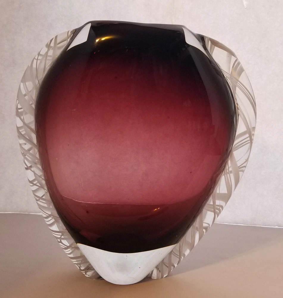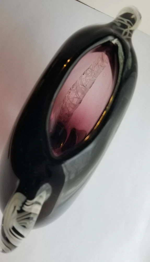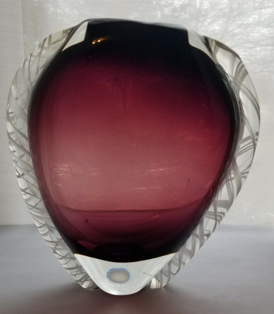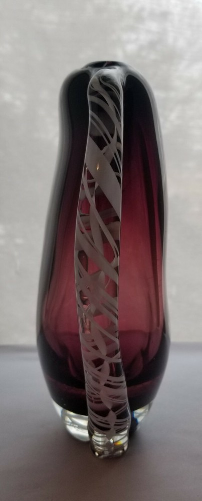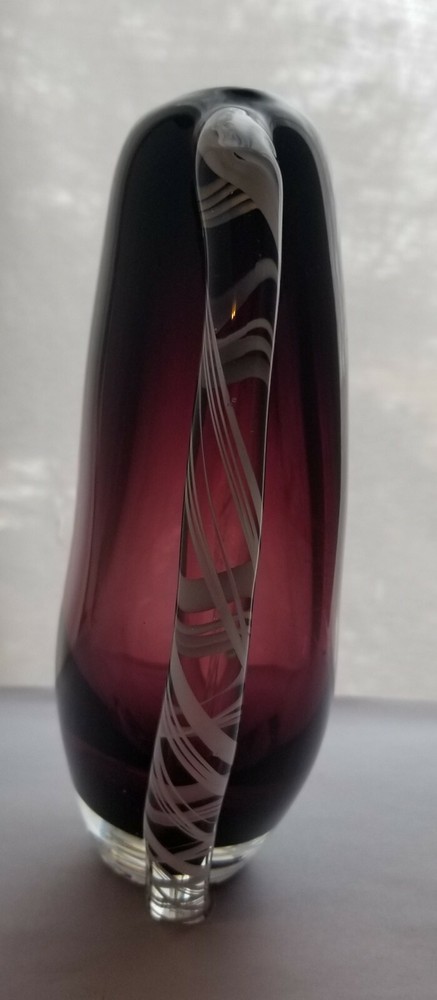 Murano Amythyst Art Vase Heart Shaped White Cane Ribbons Smooth Pontil. It is heavy, weighing 4.5 pounds. I know it is not a glass master's piece as the Trim is not symmetrical. Very nice with rich amythyst color. It measures 9" tall x 8.5" wide x 3" at the greatest depth. No damage of any kind! Please use the photos for the best description. Thank-you for looking!