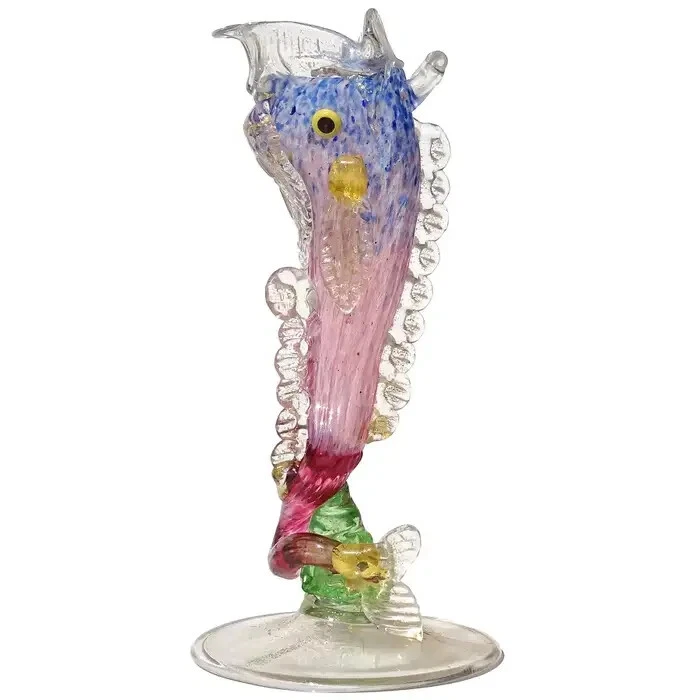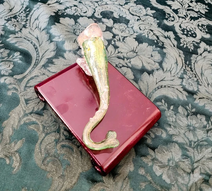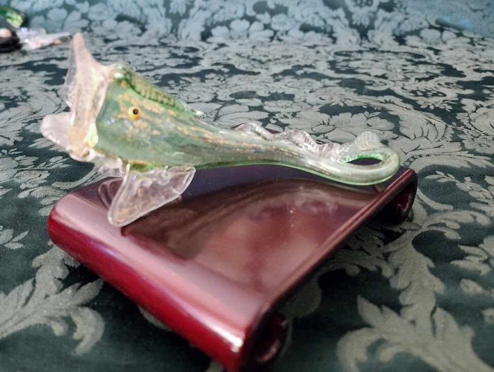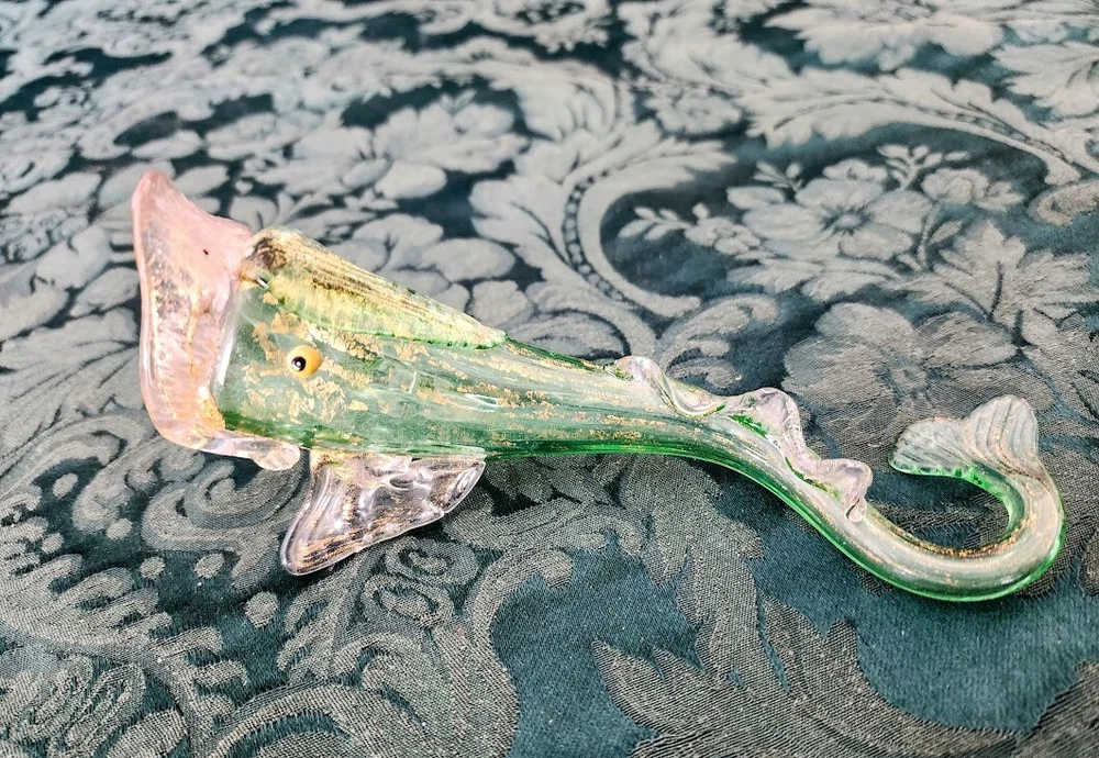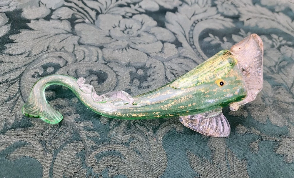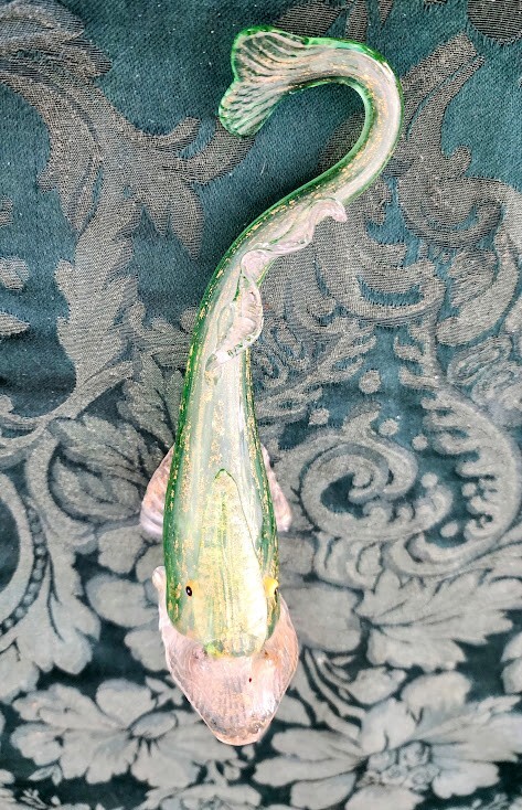 Antique Venetian " Fratelli Toso, Salviati (Workshop/Studios) "Green, Clear and Gold Flecks 1880's Italian Art Glass Fish Shaped Vase. Fish itself is 100% no cracks, no chips, no flea bites, no damage at all, running your finger lightly over every inch says smooth, clean, no structual problems and for its age that is a remarkable thing.However over 50% of the Gold Flecks are missing we belive as it is as we bought at an estate sail in mid-70's in NYC One of 25-30 pieces of MURANO Art Glass we purchased that weekend. Then later in life 2 trips to MURANO Island, off the Coast of Venice, Italy. Beautiful, antique, early Venetian / Murano hand blown green, clear and gold flecks Italian art glass with ornate fish shaped flower vase / table object. Created in the manner of the Salviati and Fratelli Toso companies, with similars dated from 1885 to 1895. The color is made up with little tiny dots of color, going from green to light clear, green & gold at the bottom. The entire piece, the fins, tail and applied foot are profusely covered in gold leaf. There is a little clear glass loop on the mouth. Would make a great piece on any curio cabinet, vanity or coffee table. Late Victorian era. Collectors item! Measures 6.25" tall x 3.25" wide at the base, with a 2" tail curl. A little nicer, more colors, w/a stand online at First Dibs currently 12/2023 for 1200.00 Copy/Paste Google in the link below! Antique Venetian Murano Blue Pink Gold Flecks Italian Art Glass Fish Shaped Vase For Sale at 1stDibs