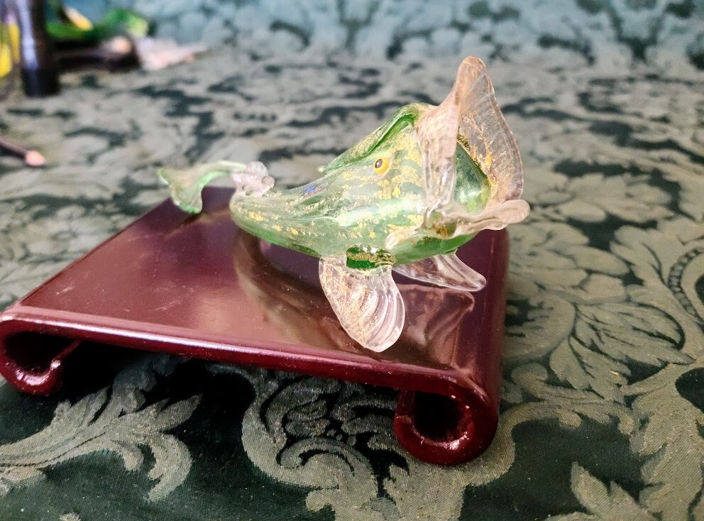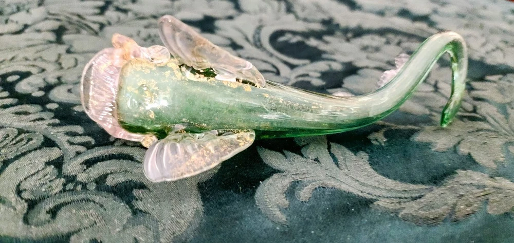 This stunning Murano fish vase is a true collector's treasure! The vibrant green glass sprinkled with gold flecks gives it an elegant, vintage charm. Despite its age, the piece is flawlessly preserved—no cracks, chips, or imperfections. The fish shape is beautifully crafted, showcasing the iconic Fratelli Toso artistry. While some gold flecks are missing, its character and history add to its uniqueness. A rare, authentic Murano find that feels magical to hold—perfect for displaying or gifting to a glass lover!