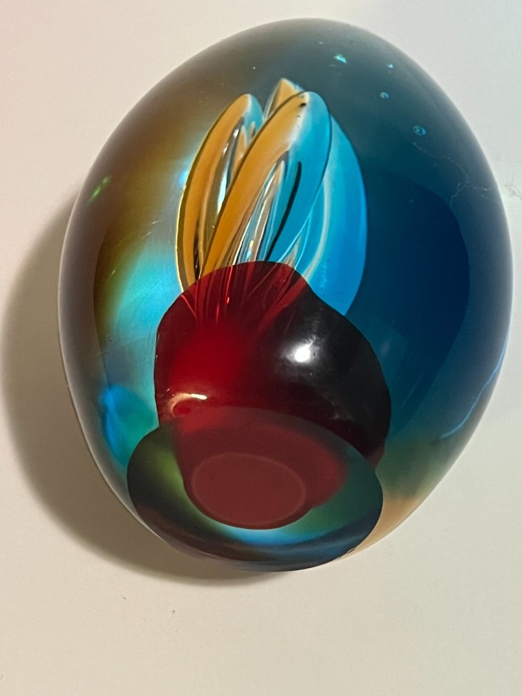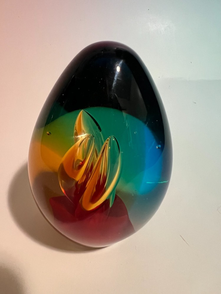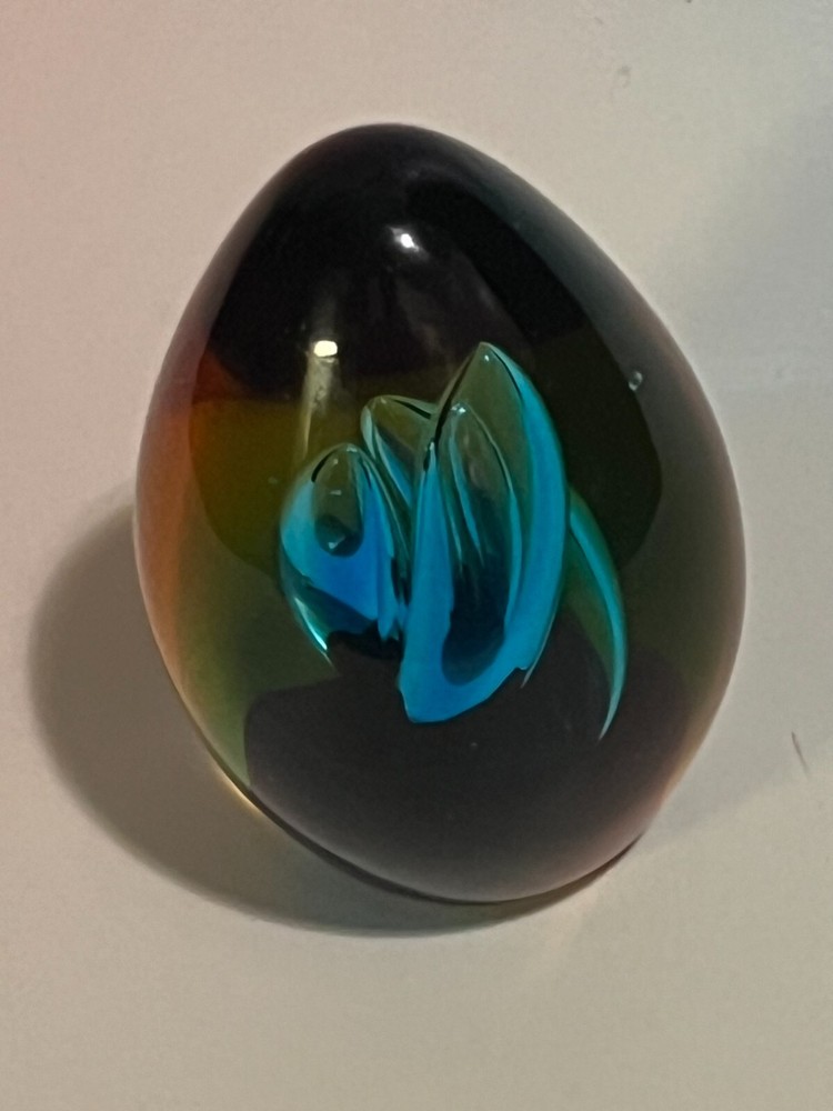This beautifully crafted paperweight is a one-of-a-kind piece of art that will add a touch of elegance to any space. Made by skilled artisans using the traditional technique of hand blown glass, this oval egg shaped paperweight features intricate teardrops and bubbles that capture the light in unique ways.Crafted by the renowned Murano brand, this studio art glass paperweight is a true masterpiece. With its stunning design and high-quality production style, it is sure to impress collectors and art enthusiasts alike. Use it as a decorative piece on your desk or display it in your glassware collection.