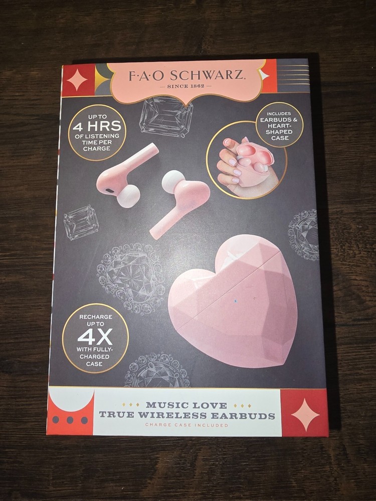 “Music Love” Pink Wireless EarBuds Earphone Heart Shaped Case FAO Schwarz Brand New in Box Thanks for looking and please let me know if you have any questions!...