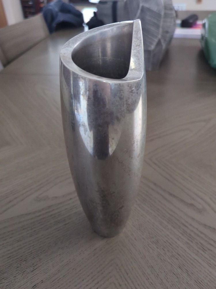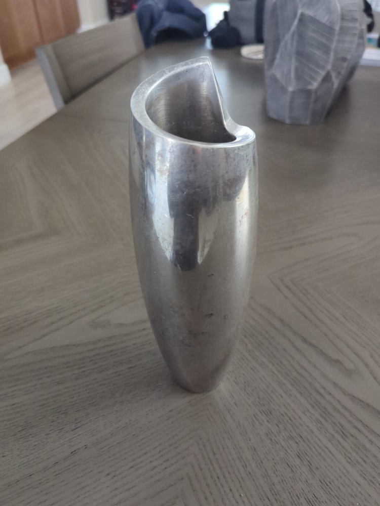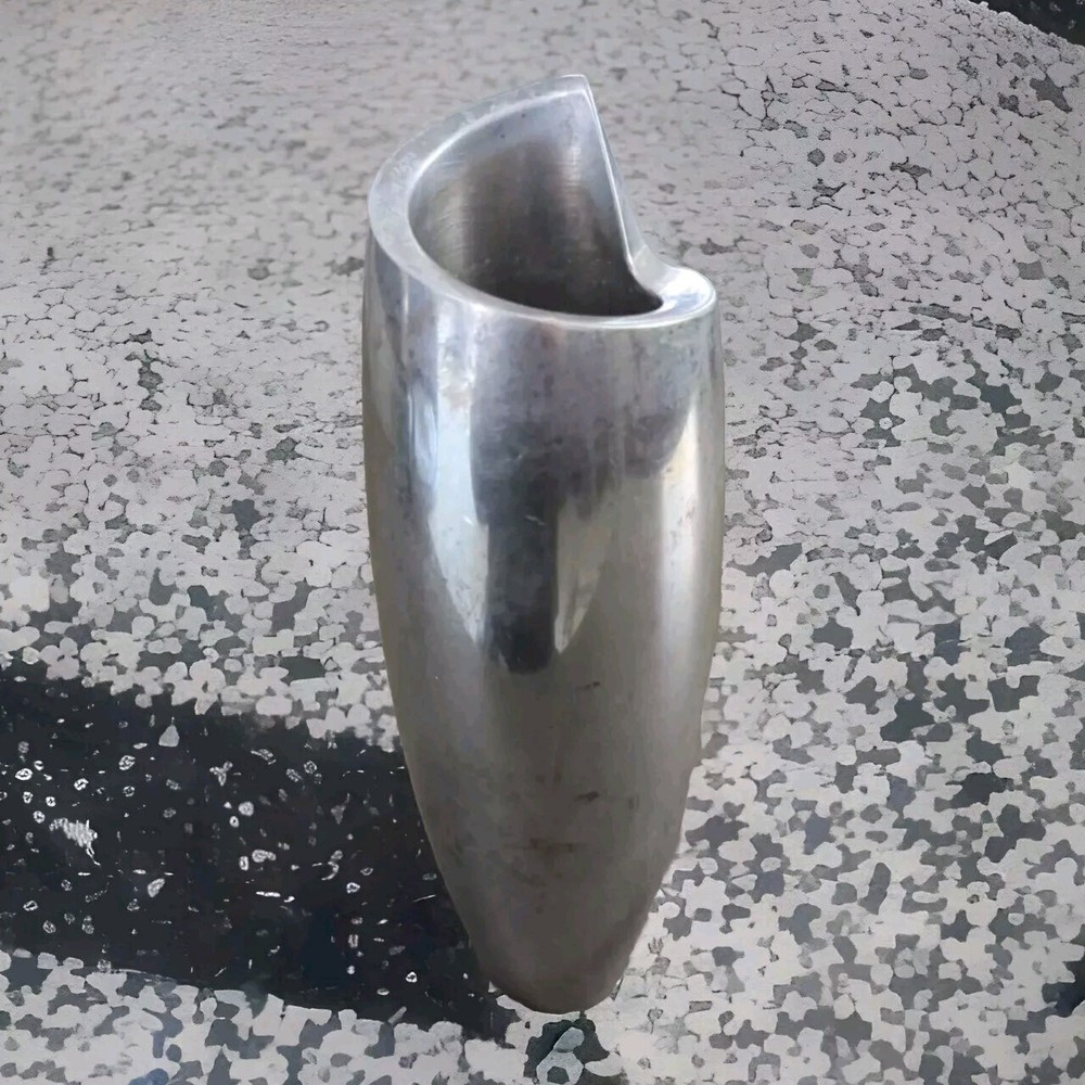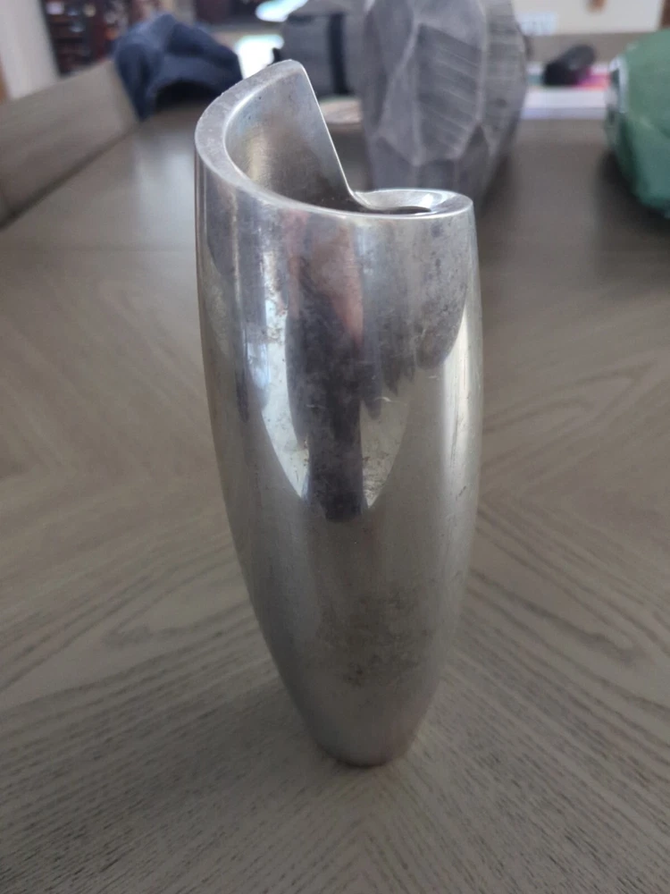 This NAMBE 1998 Studio Heavy Silver Aluminum Metal Spiral Vase #6192 is an Art Deco-inspired medium-sized vase, standing at 11 inches tall with a width of 3 inches. Crafted in the late 20th Century, it features a unique spiral shape with a smooth mirrored metallic finish. The vase is designed for adults and would make a stylish addition to any art-themed decor. It is hand washable and weighs 4.5-5 pounds, making it a substantial piece for display or use in a retirement setting.