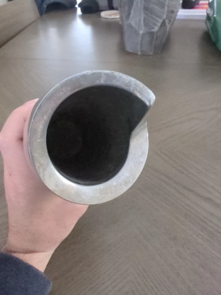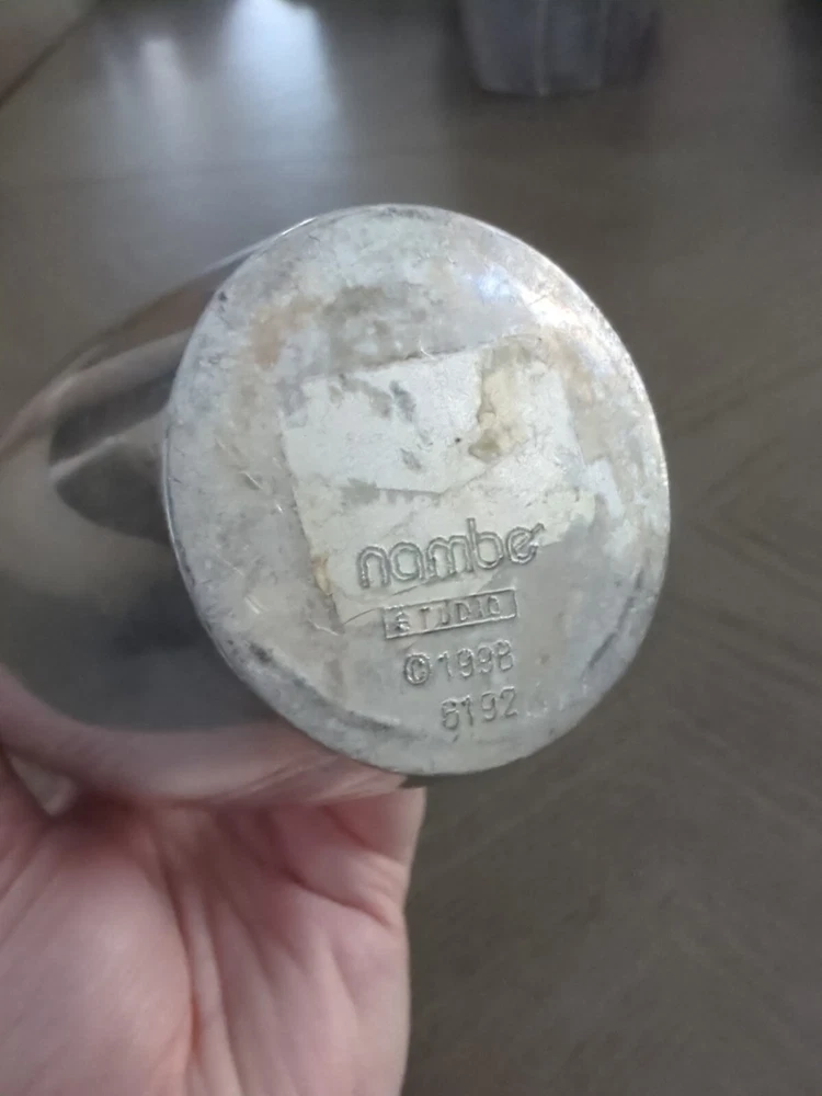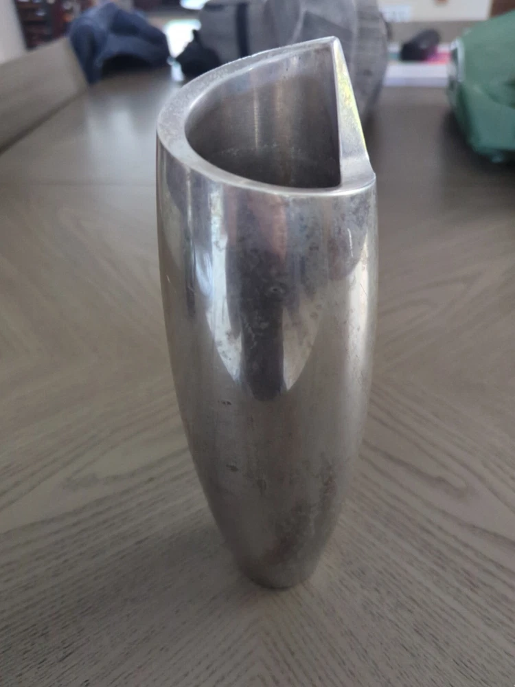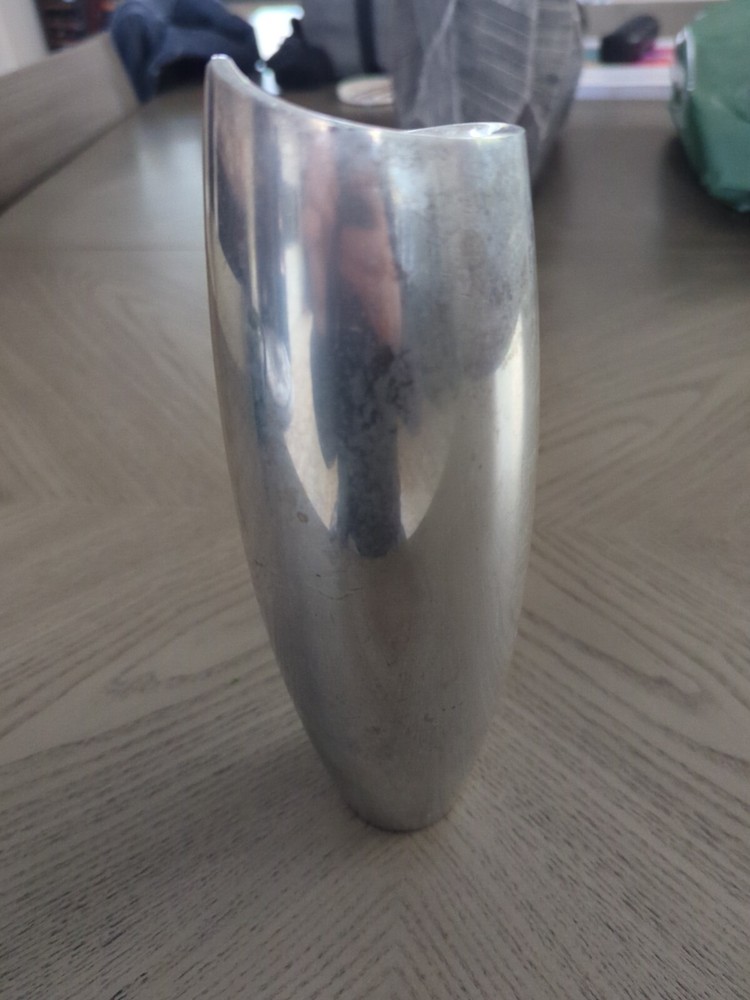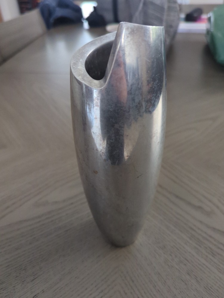 This NAMBE 1998 Studio Heavy Silver Aluminum Metal Spiral Vase #6192 is an Art Deco-inspired medium-sized vase, standing at 11 inches tall with a width of 3 inches. Crafted in the late 20th Century, it features a unique spiral shape with a smooth mirrored metallic finish. The vase is designed for adults and would make a stylish addition to any art-themed decor. It is hand washable and weighs 4.5-5 pounds, making it a substantial piece for display or use in a retirement setting.
