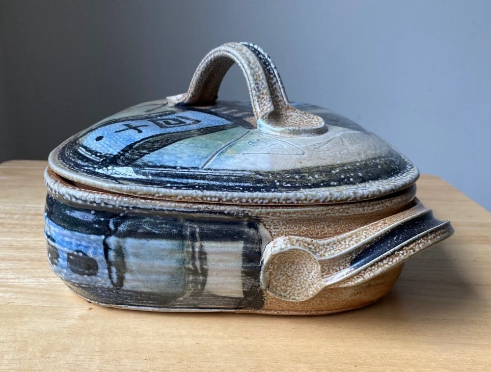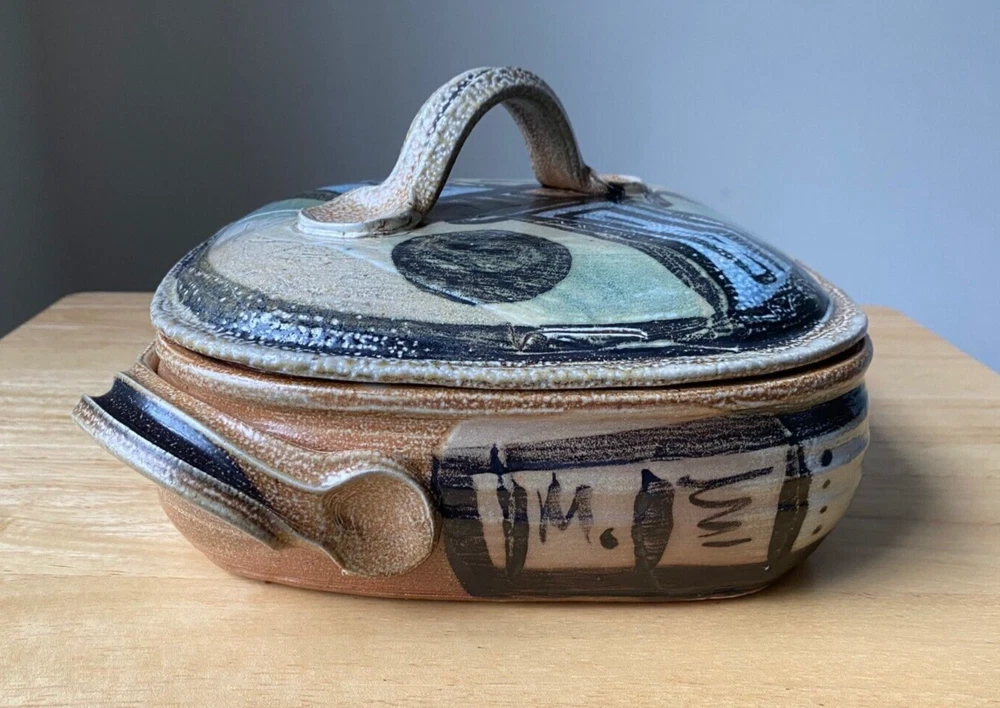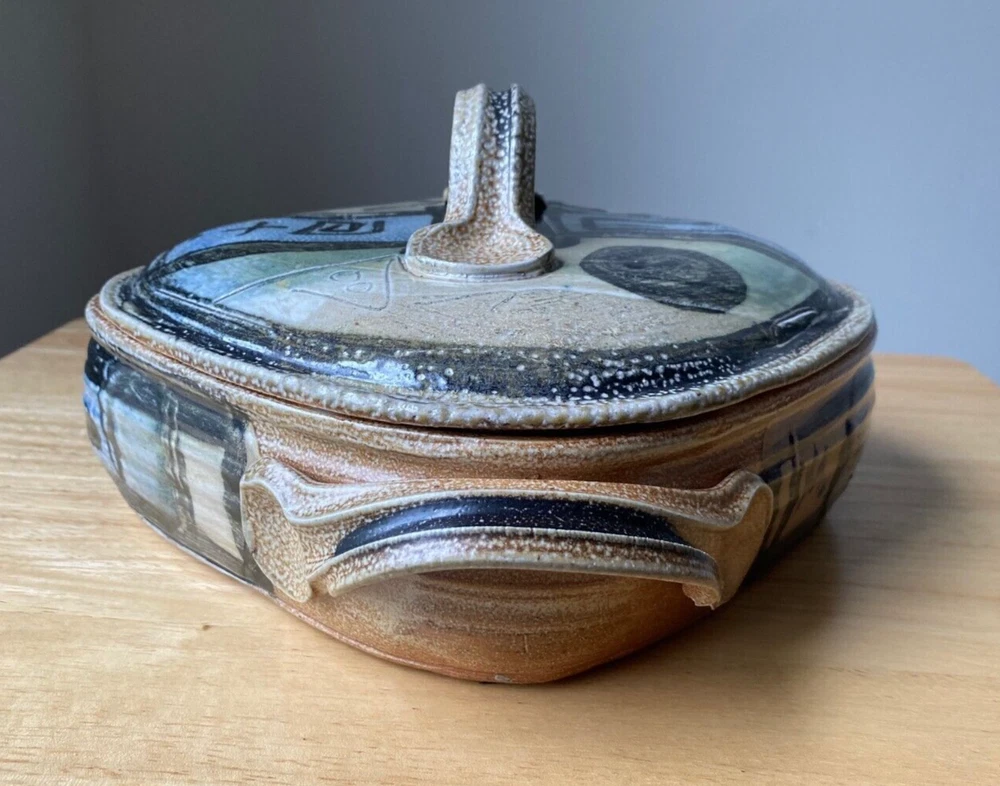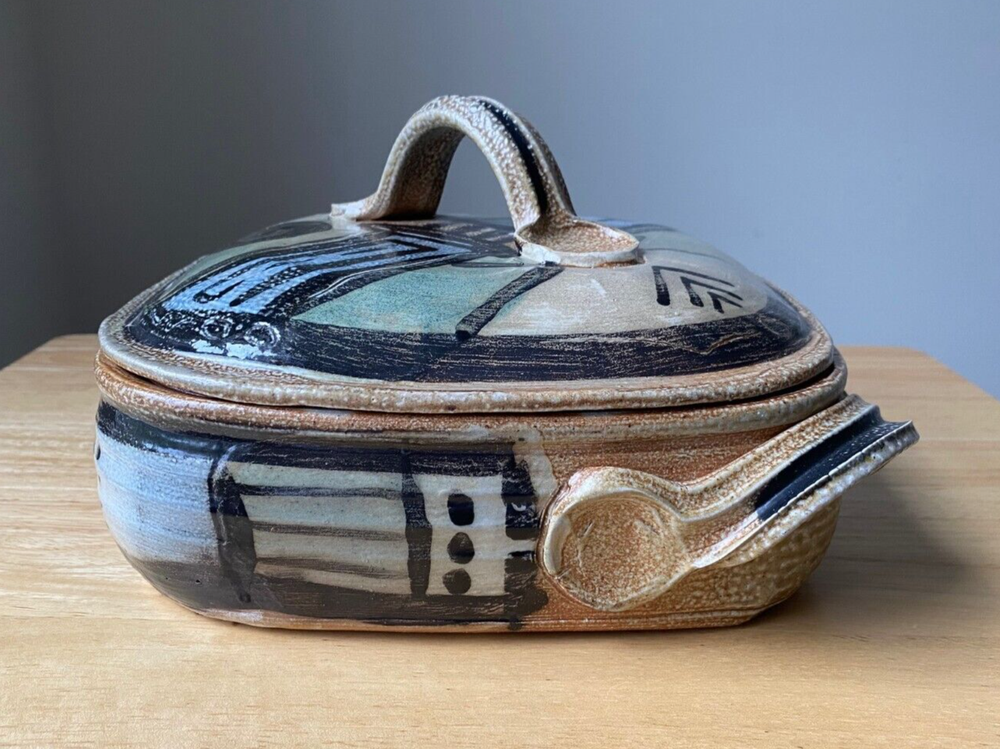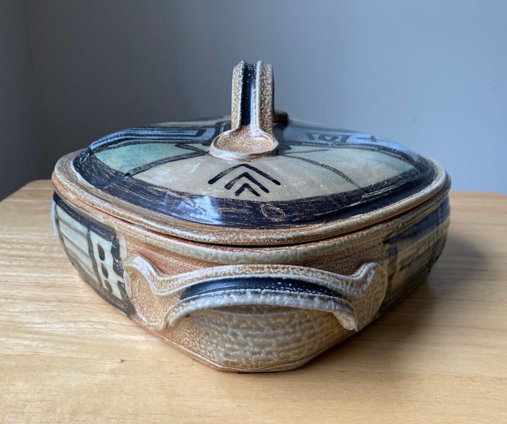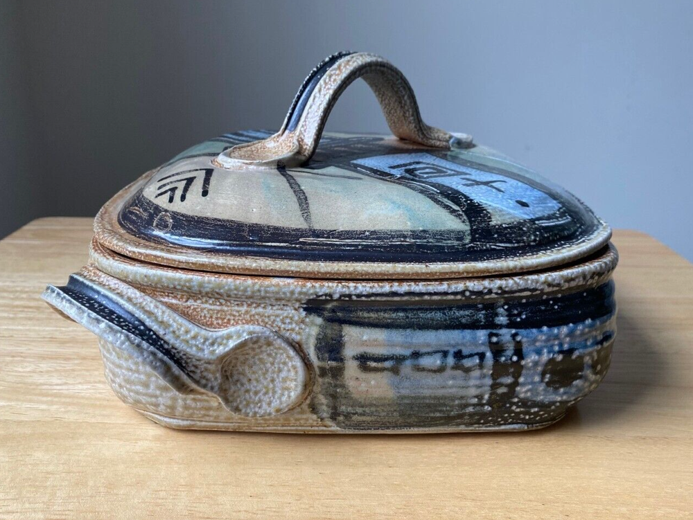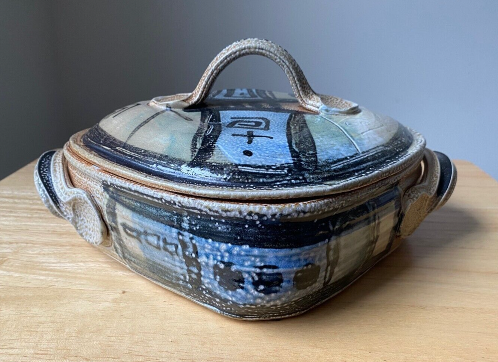 Abstract salt glazed stoneware casserole hand made by Colorado artisan Nancy Utterback. Measures 5.25 inches in height with lid, 11.5 inches from handle to handle, and 8.75 inches in width. Faint crazing and a few nicks or glaze imperfections. Otherwise in very good pre-owned condition.