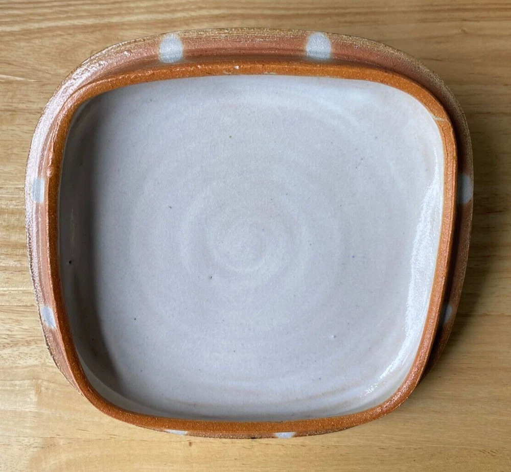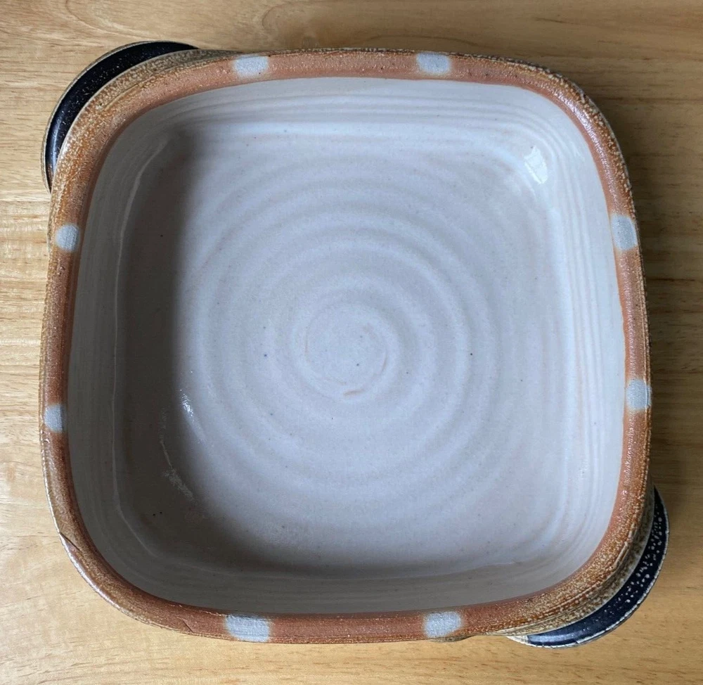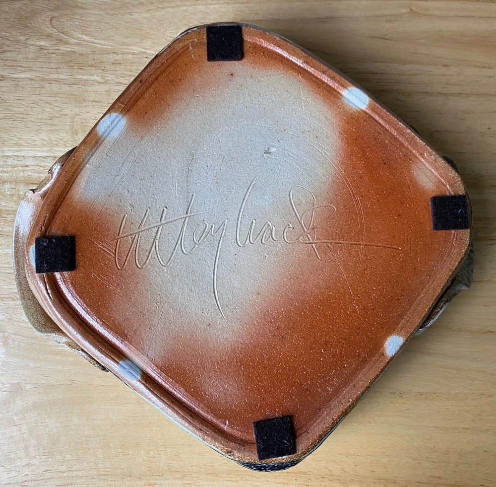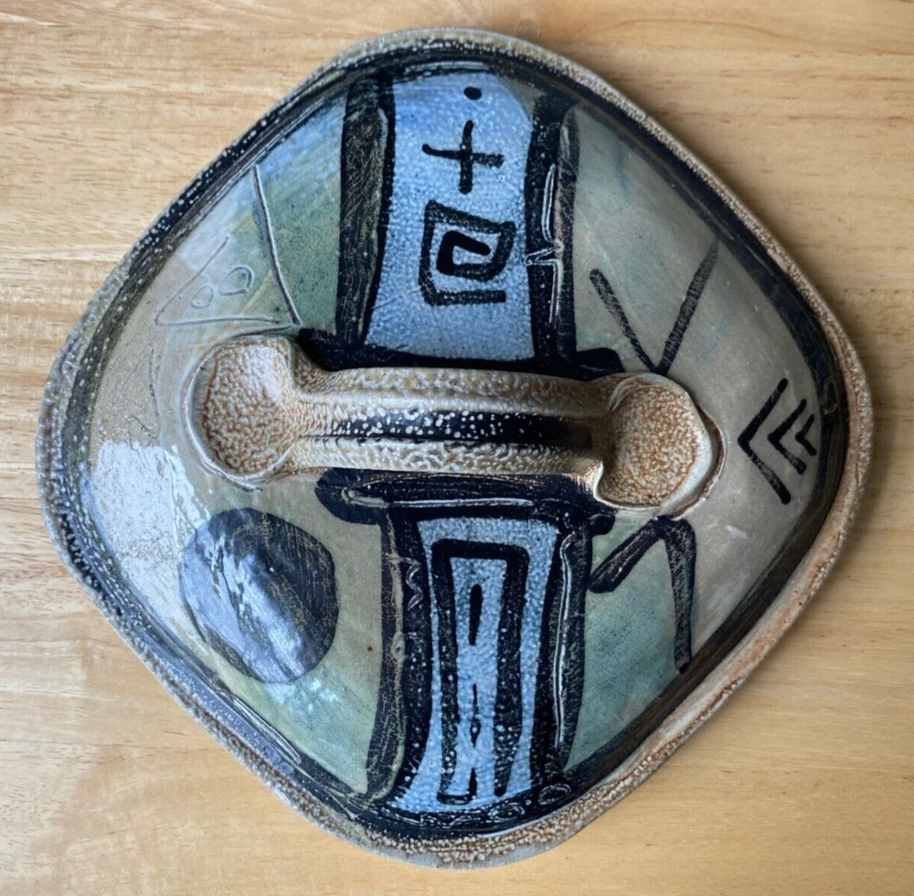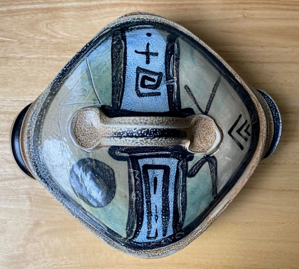 Abstract salt glazed stoneware casserole hand made by Colorado artisan Nancy Utterback. Measures 5.25 inches in height with lid, 11.5 inches from handle to handle, and 8.75 inches in width. Faint crazing and a few nicks or glaze imperfections. Otherwise in very good pre-owned condition.