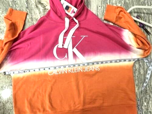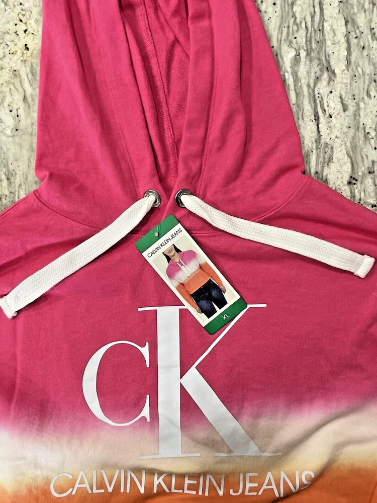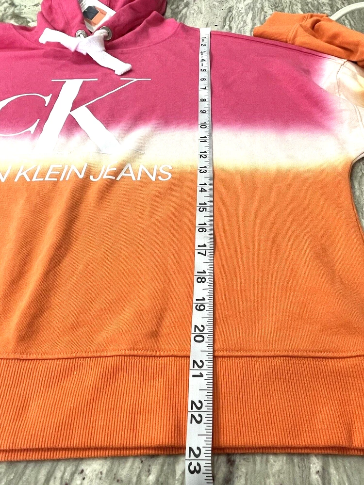 NEW with Tags, Calvin Klein Hoodie Size-XL, Logo Spell Out Sweatshirt, Dip Dye, Sherbet Orange/Pink/White Pull-Over, Cropped. Photos are of the actual item you are viewing. Everything is as seen in photos, including approximate measurements. Please compare the measurements to your own clothing and something that fits you well. Fast Shipping! Please message me with any questions! Thank you for looking!